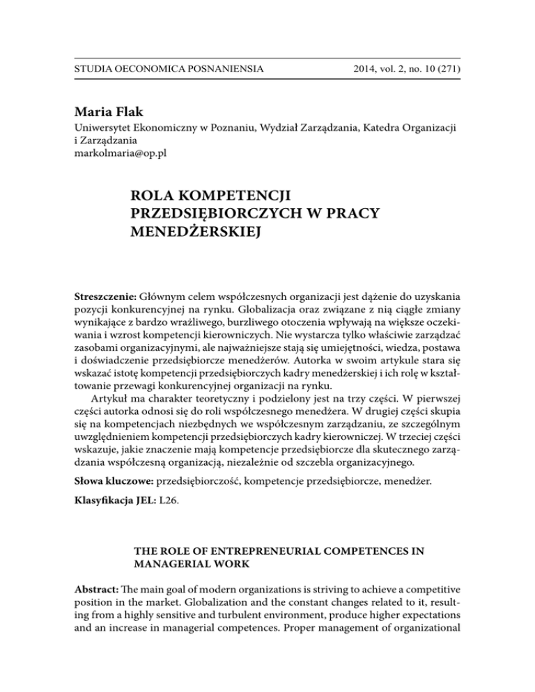 STUDIA OECONOMICA POSNANIENSIA 2014, vol. 2, no. 10 (271) Maria Flak Uniwersytet Ekonomiczny w Poznaniu, Wydział Zarządzania, Katedra Organizacji i Zarządzania [email protected] ROLA KOMPETENCJI PRZEDSIĘBIORCZYCH W PRACY MENEDŻERSKIEJ Streszczenie: Głównym celem współczesnych organizacji jest dążenie do uzyskania pozycji konkurencyjnej na rynku. Globalizacja oraz związane z nią ciągłe zmiany wynikające z bardzo wrażliwego, burzliwego otoczenia wpływają na większe oczekiwania i wzrost kompetencji kierowniczych. Nie wystarcza tylko właściwie zarządzać zasobami organizacyjnymi, ale najważniejsze stają się umiejętności, wiedza, postawa i doświadczenie przedsiębiorcze menedżerów. Autorka w swoim artykule stara się wskazać istotę kompetencji przedsiębiorczych kadry menedżerskiej i ich rolę w kształtowanie przewagi konkurencyjnej organizacji na rynku. Artykuł ma charakter teoretyczny i podzielony jest na trzy części. W pierwszej części autorka odnosi się do roli współczesnego menedżera. W drugiej części skupia się na kompetencjach niezbędnych we współczesnym zarządzaniu, ze szczególnym uwzględnieniem kompetencji przedsiębiorczych kadry kierowniczej. W trzeciej części wskazuje, jakie znaczenie mają kompetencje przedsiębiorcze dla skutecznego zarządzania współczesną organizacją, niezależnie od szczebla organizacyjnego. Słowa kluczowe: przedsiębiorczość, kompetencje przedsiębiorcze, menedżer. Klasyfikacja JEL: L26. THE ROLE OF ENTREPRENEURIAL COMPETENCES IN MANAGERIAL WORK Abstract: The main goal of modern organizations is striving to achieve a competitive position in the market. Globalization and the constant changes related to it, resulting from a highly sensitive and turbulent environment, produce higher expectations and an increase in managerial competences. Proper management of organizational 72 Maria Flak resources is not enough; the most important things being the skills, knowledge, attitude and entrepreneurial experience of managers. The author in this article attempts to show the essence of the entrepreneurial competences of managers and their role in shaping an organization’s competitive advantage in the market. The article is theoretical in character and is divided into three parts. In the first part the author discusses the role of a modern manager. The second part focuses on the competences necessary for modern management, with particular emphasis on the entrepreneurial competence of executives. The third part shows the importance of entrepreneurial competences for the effective management of a modern organization, regardless of the level. Keywords: entrepreneurship, entrepreneurial competences, manager. Wstęp Współczesne organizacje działają w bardzo burzliwym otoczeniu. Globalizacja, potrzeba ciągłego doskonalenia i umiejętne dostosowywanie się do zmian, wymaga od menedżerów nowych umiejętności, pogłębionej wiedzy, oparcia się na pozytywnym doświadczeniu, a przede wszystkim cech, umiejętności, postaw, doświadczenia i wiedzy przedsiębiorczej, czyli podsumowując – kompetencji przedsiębiorczych. Jest to związane z faktem, że od menedżera XXI wieku wymaga się oprócz kompetencji zarządczych i liderskich, także kompetencji przedsiębiorczych wpływających na twórczą pracę i powstawanie nowych, innowacyjnych rozwiązań. Celem publikacji jest zaprezentowanie koncepcji podstawowych kompetencji przedsiębiorczych i ukazanie konieczności posiadania ich przez menedżerów. Organizacje gospodarcze posiadające kapitał, w którego skład wchodzą przedsiębiorczy menedżerowie, podnoszą swoją przewagę konkurencyjną na rynku. Autorka artykułu stawia następujące pytania badawcze: Czy menedżerowie działający we współczesnych organizacjach muszą wykazywać postawę i umiejętności przedsiębiorcze oraz jaki to ma wpływ na skuteczność działalności zatrudniającej ich organizacji? Chcąc odpowiedzieć na tak postawione pytania, autorka przeprowadziła studia literatury przedmiotu. Analiza dotyczy oczekiwań stawianych współczesnemu menedżerowi, jego kompetencji przedsiębiorczych i wpływu pracy kadry kierowniczej na tworzenie przewagi konkurencyjnej na rynku. Rola kompetencji przedsiębiorczych w pracy menedżerskiej 73 1. Wymagania stawiane współczesnemu menedżerowi Menedżer to osoba zarządzająca na różnych szczeblach organizacyjnych i pełniąca główną rolę w kierowaniu organizacją. Menedżer może być właścicielem danej organizacji, ma to miejsce głównie w małych firmach, ale przede wszystkim jest to osoba zatrudniona lub działająca na rzecz danej organizacji, pełniąca funkcje kierownicze, zarządcze. Współcześnie, kiedy dużą wagę przykłada się do rozwoju organizacji opartej na innowacjach i pracy zespołowej ważne jest, aby kompetencje menedżera obejmowały również jego przedsiębiorczość. W literaturze przedmiotu trudno znaleźć jednoznaczne podejście do kompetencji przedsiębiorczych kadry kierowniczej. Podkreśla się jednak istotę i wagę przedsiębiorczości menedżera. Współczesny menedżer, zgodnie z ujęciem A.K. Koźmińskiego i D. Jemielniaka, musi pełnić funkcje, na które składają się elementy: planowania, organizowania, zarządzania informacją i wiedzą, zarządzania finansami organizacji, zarządzania operacjami, polityki personalnej, marketingu i public relationns, negocjacji, kontroli. Wymienione elementy decydują o sprawności funkcjonowania firmy. Duża potrzeba konkurencyjności współczesnych organizacji wymusza na menedżerach posiadanie zwiększonych kompetencji. Ważną rolę w kształtowaniu kompetencji kadry kierowniczej odgrywają miękkie umiejętności, oparte na cechach osobistych, pozwalające na działania przedsiębiorcze [Koźmiński i Jemielniak 2008, s. 19–21]. Definicji przedsiębiorczości jest wiele. Klasyczna definicja przedsiębiorczości autorstwa R. Cantillona [1755] tr