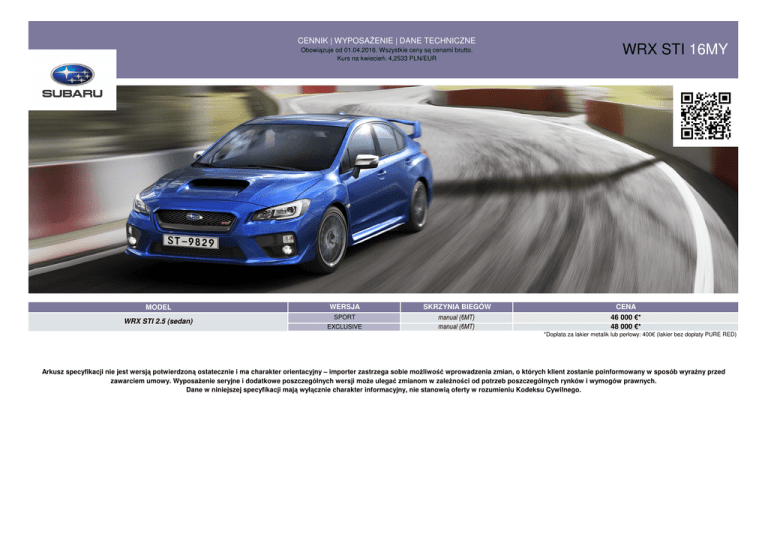 CENNIK | WYPOSAŻENIE | DANE TECHNICZNE Obowiązuje od 01.04.2016. Wszystkie ceny są cenami brutto. Kurs na kwiecień: 4,2533 PLN/EUR MODEL WERSJA WRX STI 2.5 (sedan) SPORT EXCLUSIVE SKRZYNIA BIEGÓW manual (6MT) manual (6MT) WRX STI 16MY CENA 46 000 €* 48 000 €* *Dopłata za lakier metalik lub perłowy: 400€ (lakier bez dopłaty PURE RED) Arkusz specyfikacji nie jest wersją potwierdzoną ostatecznie i ma charakter orientacyjny – importer zastrzega sobie możliwość wprowadzenia zmian, o których klient zostanie poinformowany w sposób wyraźny przed zawarciem umowy. Wyposażenie seryjne i dodatkowe poszczególnych wersji może ulegać zmianom w zależności od potrzeb poszczególnych rynków i wymogów prawnych. Dane w niniejszej specyfikacji mają wyłącznie charakter informacyjny, nie stanowią oferty w rozumieniu Kodeksu Cywilnego. WYPOSAŻENIE -2- WRX STI 2.5 (sedan) SPORT EXCLUSIVE manual (6MT) manual (6MT) WYPOSAŻENIE WNĘTRZA aluminiowe pedały dźwignia hamulca ręcznego obszyta skórą elektrycznie sterowane okno dachowe elektrycznie sterowane szyby wszystkich drzwi fotel kierowcy regulowany elektrycznie fotel kierowcy z regulacją wysokości gałka dźwigni zmiany biegów obszyta skórą gniazdo 12V w konsoli centralnej i desce rozdzielczej kierownica (w kształcie litery D) obszyta skórą kierunkowskazy autostradowe kieszenie w drzwiach z uchwytami na napoje kieszenie z tyłu oparć przednich foteli klimatyzacja automatyczna dwustrefowa (z filtrem przeciwpyłkowym) kolumna kierownicy regulowana w dwóch płaszczyznach konsola centralna ze schowkiem kontrolka obrotów, przy których należy zmienić bieg lampki do czytania z przodu lusterko wewnętrzne fotochromatyczne ozdobne nakładki na progi ze stali (z przodu) oświetlenie bagażnika podgrzewane fotele przednie przyciski sterowania systemu audio w kierownicy sportowe fotele przednie system audio Harman/Kardon z 7-calowym wyświetlaczem, odtwarzaczem CD, 9 głośnikami i wzmacniaczem system audio z 6,2-calowym wyświetlaczem, odtwarzaczem CD, 6 głośnikami system głośnomówiący oparty na technologii Bluetooth system kamery cofania system nawigacji z danymi na karcie SD system klucza elektronicznego Keyless Access z przyciskiem elektronicznego systemu Start/Stop tapicerka skórzana tapicerka skóra/Alcantara tempomat wejście USB i dodatkowe gniazdo wejściowe audio w desce rozdzielczej dwa wejścia USB i dodatkowe gniazdo wejściowe audio w desce rozdzielczej wielofunkcyjny wyświetlacz o przekątnej 4,3" wyświetlacz kolorowy LCD o przekątnej 3,5" na tablicy przyrządów wyposażenie seryjne wyposażenie niedostępne Subaru Import Polska sp. z o.o. podjęło wszelkie środki, aby zawarte w niniejszej specyfikacji informacje były dokładne i aktualne w chwili oddania do druku. W ramach polityki stałego ulepszania swoich produktów Subaru zastrzega sobie prawo do zmiany specyfikacji i wyposażenia opisanych i przedstawionych pojazdów bez uprzedzenia. O zmianach tych autoryzowani partnerzy Subaru będą powiadamiani w możliwie najkrótszym terminie. Każda zmiana wyposażenia i specyfikacji zostanie wyraźnie przedstawiona Państwu przed zawarciem umowy ze sprzedawcą. Niniejsza specyfikacja nie stanowią oferty w rozumieniu Kodeksu Cywilnego. WYPOSAŻENIE -3- WRX STI 2.5 (sedan) SPORT EXCLUSIVE manual (6MT) manual (6MT) automatycznie włączane i wyłączane reflektory przednie elektrycznie podgrzewane lusterka zewnętrzne elektrycznie składane lusterka zewnętrzne z wbudowanymi kierunkowskazami lusterka zewnętrzne w kolorze nadwozia lusterka zewnętrzne w kolorze srebrnym WYPOSAŻENIE ZEWNĘTRZNE podgrzewana szyba przednia w miejscu spoczynku piór wycieraczek podgrzewanie tylnej szyby z wyłącznikiem czasowym przednie reflektory LED* z automatycznym poziomowaniem reflektory przeciwmgłowe przednie spojler na bagażniku spojlery boczne światła do jazdy dziennej DRL tylny dyfuzor (pod zderzakiem) układ wydechowy z czterema końcówkami wycieraczki szyby przedniej z regulowaną prędkością wycieraczki z czujnikiem deszczu wysuwane spryskiwacze reflektorów przednich zdalnie sterowany centralny zamek *dotyczy świateł mijania TECHNIKA / BEZPIECZEŃSTWO 4-kanałowy ABS z elektronicznie sterowanym rozdziałem siły hamowania (EBD) aktywne sterowanie momentem napędowym (Active Torque Vectoring) aktywny centralny mechanizm różnicowy DCCD (Driver’s Control Centre Differential) felgi aluminiowe 18” funkcja "przewagi hamulców" Brake Override Hill Start Assist immobilizer Inteligentny System Ratunkowy (ISR) Inteligentny System Ratunkowy (ISR) używając sygnału GPS przekazuje automatycznie w sytuacji awaryjnej informację do stale funkcjonującego centrum monitoringu. Umożliwia to natychmiastowe zweryfikowanie zdarzenia i powiadomienie właściwych służb w celu szybkiej i sprawnej organizacji pomocy. ISOFIX kolanowa poduszka powietrzna kurtyny powietrzne PAKIET “ADVANCED” Zaawansowany pakiet bezpieczeństwa z funkcjami HBA (High Beam Assist) i SRVD (Subaru Rear Vehicle Detection) pasy bezpieczeństwa: 3-punktowe dla drugiego rzędu siedzeń poduszki powietrzne kierowcy i pasażera przednie poduszki powietrzne kierowcy i pasażera przednie - boczne przednie pasy bezpieczeństwa z napinaczami i ogranicznikami napięcia przednie pasy bezpieczeństwa z regulacją wysokości SI-DRIVE (3 tryby) Subaru Assistance Symmetrical AWD - stały napęd wszystkich kół system wspomagania hamowania awaryjnego TPMS (Tire Pressure Monitoring System – system monitorujący ciśnienie powietrza w oponach) VDCS: system kontroli trakcji i stabilizacji toru jazdy wentylowane tarcze hamulcowe Brembo (przód / tył) wspomaganie układu kierowniczego wzmocnienia boczne nadwozia zabezpieczenie tylnych drzwi przed otwarciem przez dzieci zagłówki w tylnym rzędzie siedzeń dla 3 pasażerów wyposażenie seryjne wyposażenie niedostępne Subaru Import Polska sp. z o.o. podjęło wszelkie środki, aby zawarte w ni