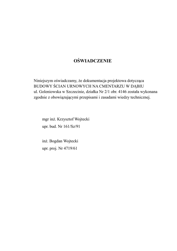 OŚWIADCZENIE Niniejszym oświadczamy, że dokumentacja projektowa dotycząca BUDOWY ŚCIAN URNOWYCH NA CMENTARZU W DĄBIU ul. Goleniowska w Szczecinie, działka Nr 2/1 obr. 4146 została wykonana zgodnie z obowiązującymi przepisami i zasadami wiedzy technicznej. mgr inż. Krzysztof Wojtecki upr. bud. Nr 161/Sz/91 inż. Bogdan Wojtecki upr. proj. Nr 4719/61 CMENTARZ W DĄBIU - ŚCIANY URNOWE - Projekt budowlany - KONSTRUKCJA SPIS TREŚCI I. OPIS TECHNICZNY 1. 2. 3. 4. 5. II. 1.A. 1.B. 1.C. 2. 3. 4. 5. 6. 7. 8. 9. 10. 11. 12. 13. 14. 15. 16. Założenia projektowe Warunki gruntowo-wodne Posadowienie obiektu Rozwiązania konstrukcyjne Uwagi CZĘŚĆ RYSUNKOWA Układ fundamentów ścian urnowych ETAP I .............. 1:50 Układ fundamentów ścian urnowych ETAP II ............. 1:50 Układ fundamentów ścian urnowych ETAP III ............ 1:50 Fundament ściany „1” ................................................... 1:25 Fundament ściany „2” ................................................... 1:25 Fundament ściany „3” ................................................... 1:25 Fundament ściany „4”’.................................................. 1:25 Fundament ściany „5”’.................................................. 1:25 Fundament pod murki łączące ...................................... 1:25 Fundament pod mur ...................................................... 1:25 Zbrojenie ściany „1” ..................................................... 1:25 Zbrojenie ściany „2” ..................................................... 1:25 Zbrojenie ściany „3” ..................................................... 1:25 Zbrojenie ściany „4” ..................................................... 1:25 Zbrojenie ściany „5” ..................................................... 1:25 Konstrukcja ram pergoli 1............................................. 1:10 Konstrukcja ram pergoli 2............................................. 1:10 Konstrukcja ram pergoli 3............................................. 1:10 Wykazy stali 2 CMENTARZ W DĄBIU - ŚCIANY URNOWE - Projekt budowlany - KONSTRUKCJA 3 Opis techniczny do projektu ścian urnowych Cmentarz w Dąbiu w Szczecinie 1. Założenia projektowe. Zaprojektowano zespół ścian urnowych spełniających również funkcję ogrodzenia cmentarza oraz wymianę fragmentu istniejącego murowanego ogrodzenia. Ściany w konstrukcji betonowej zbrojonej stalą konstrukcyjną. Zastosowano beton C20/25 (B25) oraz beton architektoniczny C35/45 (B45). Ściany urnowe zaprojektowano w technologii wylewanej. Zaprojektowano elementy małej architektury w postaci pergoli i przegrodzeń ze stali ocynkowanej. 2. Warunki gruntowo-wodne. Badań geologicznych dla posadowienia ścian urnowych nie przeprowadzono. Przyjęto standardowe warunki gruntowe występujące w tym rejonie tj. piaski drobne średnio zagęszczone, woda gruntowa nie występuje. W przypadku stwierdzenia podczas wykonywania wykopów odmiennych warunków geotechnicznych, należy niezwłocznie zawiadomić projektanta. 3. Posadowienie obiektu. Zaprojektowano posadowienie ścian urnowych na fundamentowej płycie żelbetowej wylewanej na budowie z betonu C20/25 (B25). Posadowienie fundamentu ścian urnowych min. 90cm poniżej poziomu terenu – przyjęto poziom +5,50m npm. Płyta grubości 40cm. Pod płytą warstwa chudego betonu gr. 10cm. Ściany fundamentowe gr. 15, 20 i 24cm z betonu C20/25 (B25) zbrojonego siatką Ø 8 co 20cm (stal A-III). Otulina zbrojenia5cm. Posadowienie ogrodzenia murowanego na ławach żelbetowych z betonu C20/25 (B25). 4. Rozwiązania konstrukcyjne. 4.1. Ściany urnowe. Stropy nad ścianami fundamentowymi, pomiędzy poszczególnymi kondygnacjami i strop górny zaprojektowano monolityczne wylewane na budowie. Zbrojenie siatką Ø 6 co 14 i 15cm (stal A-III). Otulina zbrojenia 2cm. CMENTARZ W DĄBIU - ŚCIANY URNOWE - Projekt budowlany - KONSTRUKCJA Ściany pomiędzy niszami zaprojektowano betonowe, wylewane na budowie. Beton architektoniczny C35/45 (B45). 4.2. Pergole stalowe. Konstrukcję nośną stanowią ramy dwu- i jednonawowe wykonane z profili zamkniętych prostokątnych 100×100×4. Posadowienie ram z jednej strony na własnych stopach fundamentowych 40×40×40cm, z drugiej na fundamencie ścian urnowych. Oparcie poprzez blachy podstawy gr. 10mm i podlewkę gr. 2cm. W przypadku ram pośrednich (wewnętrznych) pergoli, zamocowanie belki poziomej ramy bezpośrednio do ściany za pomocą spawania do marki stalowej osadzonej w betonie. Stężenia poziome z belek stalowych prostokątnych 100×100×4 wspawane pomiędzy węzły ram głównych. Do konstrukcji pergoli zamocować stalowe elementy wypełniające z profili stalowych 60×40×3 i 20×20×3 za pomocą śrub M8. 5. Uwagi 5.1. W przypadku wystąpienia nietypowych warunków geotechnicznych podłoża, należy niezwłocznie zawiadomić projektanta niniejszego opracowania. 5.2. Należy zwrócić na prawidłowe wyznaczenie geometrii płyty fundamentowej w terenie oraz dokładne wykonanie elementów wylewanych z betonu architektonicznego. 5.3. Miejsca spawania konstrukcji na budowie oszlifować i pomalować farbą cynkową. 5.4. Izolacje przeciwwilgociowe wykonać zgodnie z projektem architektury. opracował mgr inż. Krzysztof Wojtecki upr. bud. 161/Sz/91 4