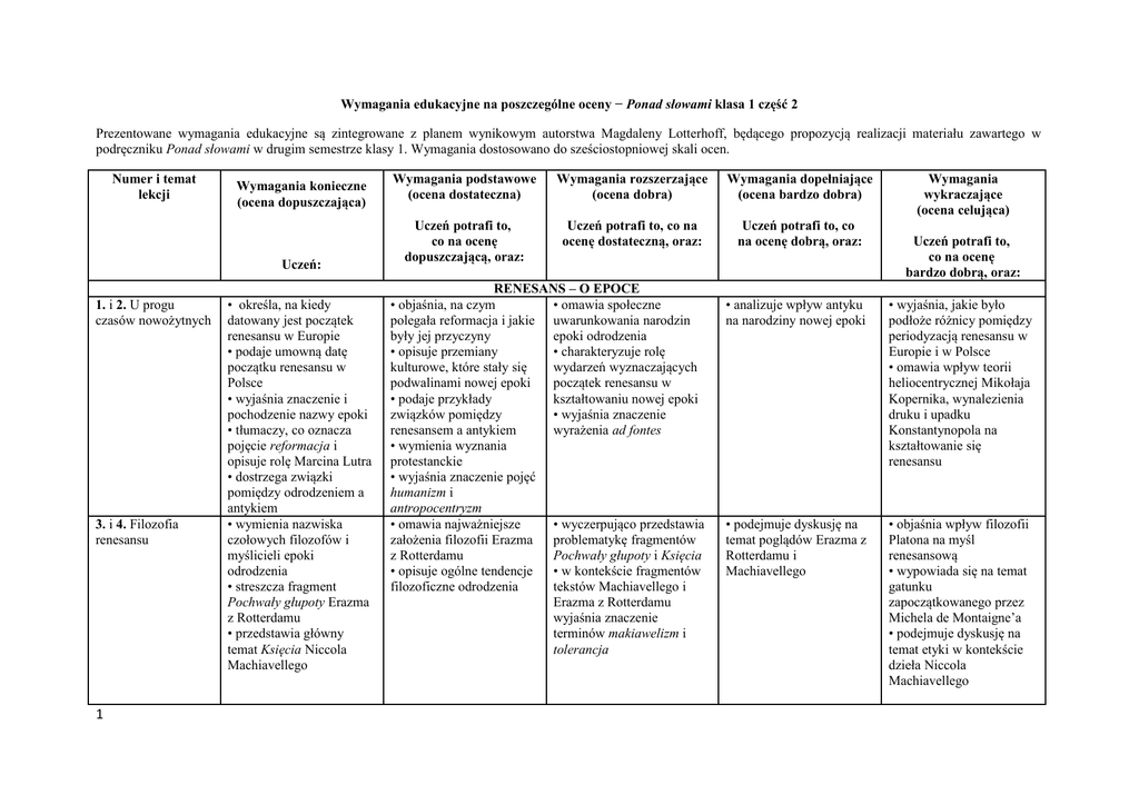 Wymagania edukacyjne na poszczególne oceny − Ponad słowami klasa 1 część 2 Prezentowane wymagania edukacyjne są zintegrowane z planem wynikowym autorstwa Magdaleny Lotterhoff, będącego propozycją realizacji materiału zawartego w podręczniku Ponad słowami w drugim semestrze klasy 1. Wymagania dostosowano do sześciostopniowej skali ocen. Numer i temat lekcji Wymagania konieczne (ocena dopuszczająca) Uczeń: 1. i 2. U progu czasów nowożytnych 3. i 4. Filozofia renesansu 1 • określa, na kiedy datowany jest początek renesansu w Europie • podaje umowną datę początku renesansu w Polsce • wyjaśnia znaczenie i pochodzenie nazwy epoki • tłumaczy, co oznacza pojęcie reformacja i opisuje rolę Marcina Lutra • dostrzega związki pomiędzy odrodzeniem a antykiem • wymienia nazwiska czołowych filozofów i myślicieli epoki odrodzenia • streszcza fragment Pochwały głupoty Erazma z Rotterdamu • przedstawia główny temat Księcia Niccola Machiavellego Wymagania podstawowe (ocena dostateczna) Wymagania rozszerzające (ocena dobra) Wymagania dopełniające (ocena bardzo dobra) Uczeń potrafi to, co na ocenę dopuszczającą, oraz: Uczeń potrafi to, co na ocenę dostateczną, oraz: Uczeń potrafi to, co na ocenę dobrą, oraz: RENESANS – O EPOCE • objaśnia, na czym • omawia społeczne polegała reformacja i jakie uwarunkowania narodzin były jej przyczyny epoki odrodzenia • opisuje przemiany • charakteryzuje rolę kulturowe, które stały się wydarzeń wyznaczających podwalinami nowej epoki początek renesansu w • podaje przykłady kształtowaniu nowej epoki związków pomiędzy • wyjaśnia znaczenie renesansem a antykiem wyrażenia ad fontes • wymienia wyznania protestanckie • wyjaśnia znaczenie pojęć humanizm i antropocentryzm • omawia najważniejsze • wyczerpująco przedstawia założenia filozofii Erazma problematykę fragmentów z Rotterdamu Pochwały głupoty i Księcia • opisuje ogólne tendencje • w kontekście fragmentów filozoficzne odrodzenia tekstów Machiavellego i Erazma z Rotterdamu wyjaśnia znaczenie terminów makiawelizm i tolerancja Wymagania wykraczające (ocena celująca) Uczeń potrafi to, co na ocenę bardzo dobrą, oraz: • analizuje wpływ antyku na narodziny nowej epoki • wyjaśnia, jakie było podłoże różnicy pomiędzy periodyzacją renesansu w Europie i w Polsce • omawia wpływ teorii heliocentrycznej Mikołaja Kopernika, wynalezienia druku i upadku Konstantynopola na kształtowanie się renesansu • podejmuje dyskusję na temat poglądów Erazma z Rotterdamu i Machiavellego • objaśnia wpływ filozofii Platona na myśl renesansową • wypowiada się na temat gatunku zapoczątkowanego przez Michela de Montaigne’a • podejmuje dyskusję na temat etyki w kontekście dzieła Niccola Machiavellego 6. i 7. Sztuka renesansu • rozpoznaje dzieła sztuki renesansowej • ogólnie wypowiada się na temat najważniejszych artystów odrodzenia (Leonardo da Vinci, Michał Anioł, Rafael, Sandro Botticelli) 8. Teatr renesansowy • wymienia cechy teatru elżbietańskiego 9. Poezja religijna Jana Kochanowskiego • czyta ze zrozumieniem Pieśń XXV z Ksiąg wtórych Kochanowskiego • określa rodzaj liryki występujący w utworze 10. i 11. Świat myśli Jana Kochanowskiego utrwalony w Pieśniach • czyta ze zrozumieniem podane pieśni • wskazuje elementy światopoglądu renesansowego w utworach Kochanowskiego • definiuje pieśń jako gatunek • czyta ze zrozumieniem fragmenty Pieśni o 12. Liryka obywatelska Jana 2 • wymienia cechy charakterystyczne stylu renesansowego i objaśnia je na przykładach • prezentuje dzieła polskiego renesansu • wyjaśnia znaczenie terminów: akt, portret, perspektywa, scenka rodzajowa, krużganki, miasto idealne, sfumato • przedstawia różnice pomiędzy teatrem renesansowym a średniowiecznym • wskazuje i ilustruje przykładami najważniejsze tematy sztuki renesansowej • omawia twórczość najważniejszych artystów odrodzenia (Leonardo da Vinci, Michał Anioł, Rafael, Sandro Botticelli) • analizuje renesansowe dzieło sztuki • charakteryzuje wpływ antyku na sztukę odrodzenia • opisuje twórczość renesansowych artystów północnych • analizuje i ocenia dzieła renesansowe • wypowiada się na temat muzyki XVI-wiecznej • wylicza podobieństwa i różnice pomiędzy teatrem renesansowym a antycznym • charakteryzuje konwencje teatralne powstałe w renesansie • omawia zjawisko teatru dell’arte • przedstawia podobieństwa oraz różnice pomiędzy dramatem humanistycznym a elżbietańskim • porównuje kreację Boga w pieśni z Jego obrazem w utworach średniowiecznych • rozpoznaje rodzaj wersyfikacji zastosowany w utworze • na podstawie indywidualnych poszukiwań wyjaśnia znaczenie wyrażenia Deus artifex i odnosi je do utworu Jana Kochanowskiego • konfrontuje wiersz Jana Kochanowskiego z obrazem Pietera Bruegla Żniwa i formułuje wnioski • porównuje Pieśń XXIV z Ksiąg wtórych z wierszami Horacego • konfrontuje pieśni Jana Kochanowskiego z obrazem Tycjana Trzy okresy życia RENESANS – TEKSTY Z EPOKI • wskazuje podmiot • interpretuje wiersz liryczny oraz adresata • wyjaśnia, na czym polega lirycznego pieśni renesansowy charakter • określa gatunek utworu i utworu wskazuje na jego pochodzenie • na podstawie wierszy charakteryzuje światopogląd poety • wyjaśnia znaczenie terminów: horacjanizm, cnota, fortuna, stoicyzm, epikureizm • odnajduje wątki horacjańskie w pieśniach Jana Kochanowskiego • analizuje wiersze pod kątem obecności elementów stoicyzmu i epikureizmu • dokonuje analizy i interpretacji utworów • wskazuje w pieśniach cechy wiersza sylabicznego • określa historyczne tło powstania Pieśni o • odnosi tematykę pieśni do światopoglądu • w kontekście utworu Jana Kochanowskiego • przywołuje szerokie konteksty interpretacyjne Kochanowskiego 13. Renesansowy obr