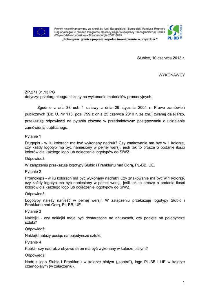 Słubice, 10 czerwca 2013 r. WYKONAWCY ZP.271.31.13.PG dotyczy: przetarg nieograniczony na wykonanie materiałów promocyjnych. Zgodnie z art. 38 ust. 1 ustawy z dnia 29 stycznia 2004 r. Prawo zamówień publicznych (Dz. U. Nr 113, poz. 759 z dnia 25 czerwca 2010 r. ze zm.) zwanej dalej Pzp, przekazuję odpowiedzi na pytania złożone w przedmiotowym postępowaniu o udzielenie zamówienia publicznego. Pytanie 1 Długopis - w ilu kolorach ma być wykonany nadruk? Czy znakowanie ma być w 1 kolorze, czy każdy logotyp ma być naniesiony w pełnej wersji, jeśli tak to proszę o podanie ilości kolorów dla każdego logo lub dołączenie logotypów do SIWZ. Odpowiedź: W załączeniu przekazuję logotypy Słubic i Frankfurtu nad Odrą, PL-BB, UE. Pytanie 2 Promoklips - w ilu kolorach ma być wykonany nadruk? Czy znakowanie ma być w 1 kolorze, czy każdy logotyp ma być naniesiony w pełnej wersji, jeśli tak to proszę o podanie ilości kolorów dla każdego logo lub dołączenie logotypów do SIWZ. Odpowiedź: Logotypy należy nanieść w pełnej wersji. W załączeniu przekazuję logotypy Słubic i Frankfurtu nad Odrą, PL-BB, UE. Pytanie 3 Naklejki - czy naklejki mają być dostarczone na arkuszach, czy pocięte na pojedyncze sztuki? Odpowiedź: Naklejki należy pociąć na pojedyncze sztuki. Pytanie 4 Kubki - czy nadruk z obydwu stron ma być wykonany w kolorze białym? Odpowiedź: Nadruk logo Słubic i Frankfurtu w kolorze białym („kontra”), logo PL-BB i UE w kolorze czarnobiałym (w załączeniu). 1 Pytanie 5 Proszę o udostępnienie logotypów, które maja być zamieszczone na materiałach promocyjnych. Odpowiedź: W załączeniu przekazuję logotypy Słubic i Frankfurtu nad Odrą, PL-BB, UE. Pytanie 6 Proszę o przesłanie informacji o ilości kolorów (lub samych logotypów),które mają zostać umieszczone na: długopisach, tasiemce, klipsie, kubkach. Czy nadruk na tasiemce ma być jedno- czy dwustronny? Odpowiedź: Nadruk na wstążce jednostronny (loga w pełnym kolorze). W załączeniu przekazuję logotypy Słubic i Frankfurtu nad Odrą, PL-BB, UE. Kolorystyka logo Słubic i Frankfurtu nad Odrą, UE oraz PL-BB w pełnych kolorach (tasiemka, długopis, promoklips). Logo Słubic i Frankfurtu nad Odrą na kubkach należy umieścić w wersji białej oraz w kolorze czarnobiałym UE i PL-BB. Pytanie 7 Proszę o podanie ilości kolorów: 1 Promoklipsy 2.Kubki. Proszę o podanie informacji czy nadruk na wstążce ma być jednostronny oraz ile kolorów. Odpowiedź: Nadruk na wstążce jednostronny (loga w pełnym kolorze). W załączeniu przekazuję logotypy Słubic i Frankfurtu nad Odrą, PL-BB, UE. Pytanie 8 Proszę o informację w ilu kolorach ma być wykonany nadruk na promoklipsie? W 1 czy w full kolorze? Odpowiedź: Nadruk na promoklipsie w pełnym kolorze. W załączeniu przekazuję logotypy Słubic i Frankfurtu nad Odrą, PL-BB, UE. Pytanie 9 Aby dokonać analizy kosztów wykonania materiałów promocyjnych niezbędne mi są logotypy w formie krzywych w Corellu. Proszę o ich udostępnienie w trybie pilnym. Odpowiedź: W załączeniu przekazuję dostępne formaty plików z logotypami, które posiada Zamawiający. W związku z wprowadzonymi dodatkowymi informacjami, na podstawie art. 38 ust. 4 ustawy Pzp, zamawiający przesuwa termin składania i otwarcia ofert zmieniając treść Specyfikacji Istotnych Warunków Zamówienia w następujący sposób: Rozdział X pkt 4 otrzymuje następujące brzmienie: 4. Kopertę (opakowanie) należy oznakować następująco: OFERTA PRZETARGOWA 2 Przetarg nieograniczony na wykonanie materiałów promocyjnych. Uwaga! Nie otwierać przed dniem: 19 czerwca 2013 r. do godziny 11:30 Rozdział XI pkt 1 i 2 otrzymuje następujące brzmienie: 1. Oferty należy składać w siedzibie Zamawiającego w Urzędzie Miejskim w Słubicach, ul Akademicka 1 w sekretariacie Burmistrza (I piętro, pokój 118) do dnia 19 czerwca 2013 r. do godziny 11:00. 2. Otwarcie ofert nastąpi w dniu 19 czerwca 2013 r. o godzinie 11:30 w siedzibie Zamawiającego, sala konferencyjna, II piętro. 3