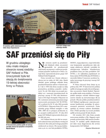 Temat SAF Holland Przecięcie wstęgi nowo oddanego obiektu W siedzibie spółki zlokalizowana jest także stacja diagnostyczna SAF przeniósł się do Piły W grudniu ubiegłego roku miało miejsce otwarcie nowej siedziby SAF Holland w Pile. Uroczystość była też okazją do świętowania 15-letniej obecności firmy w Polsce. W kierownictwie polskiej spółki od samego początku obecny był gospodarz uroczystości, Marek Modrak N a otwarciu zjawili się przedstawiciele lokalnych władz, uroczystość zgromadziła też przedstawicieli całej branży naczepowej z czołowymi producentami pojazdów użytkowych w Polsce. Zarząd firmy reprezentował prezes grupy SAF Holland Detlef Borghardt. Firma wywodzi się z branży rolniczej i obecna jest na rynku od 1881 roku. Marek Modrak, prezes polskiego oddziału firmy, przedstawił kamienie milowe w historii marki. I tak w 1950 roku firma zaczęła na skalę przemysłową produkcję pojazdów użytkowych. Na rok 1964 datuje się początek produkcji osi i zawieszeń pneumatycznych do przyczep i naczep. W 1991 roku skonstruowano oś SK (Super Kompakt). Połączenie osi SK z systemem zawieszenia pneumatycznego zaowocowało powstaniem SAF SK-INTRAAX w połowie lat 90. W roku 2002 powstała oś INTEGRAL. Połączenie firmy SAF z amerykańską grupą Holland nastąpiło w roku 2006. 2008 rok to przejęcie producenta m. in. zaczepów siodłowych GF+. W roku 2012 grupa SAF Holland wypracowała obroty prawie 860 mln euro. SAF Holland obecny jest dziś na wszystkich rynkach świata i jest jednym z wiodących dostawców dla rynku pierwotnego pojazdów użytkowych na świecie. Dla naczep dedykowane są m. in. osie linii produktów INTRA, MODUL, nogi podporowe, czopy królewskie oraz komponenty specjalistyczne takie jak: rampy załadowcze, zderzaki i produkty do zabezpieczenia ładunków. Sztandarowym produktem firmy jest linia produktów SAF INTRA, a do najbardziej popularnych osi firmy należy INTRADISK plus INTEGRAL z niezwykle lekkim 9-tonowym zaciskiem hamulca tarczowego do przyczep i naczep SAF SBS2220 H0. W Polsce obecność firmy datuje się na połowę roku 1997. W kierownictwie polskiej spółki od samego początku obecny był gospodarz uroczystości, Marek Modrak. Poprzednio spółka miała swoją siedzibę w Trzciance, jednak tamtejsze warunki lokalowo-magazynowe okazały się niewystarczające dla jej potrzeb. Obecnie polskie przedstawicielstwo SAF Holland współpracuje z pięcioma partnerami handlowymi, posiadając 26 autoryzowanych partnerów serwisowych. Firma opiekuje się również rynkiem ukraińskim. Dziś z Polski sprzedaje się rocznie produkty spółki na kwotę ponad 40 mln złotych. Od września 2013 roku firma posiada nowoczesną siedzibę w Pile. Magazyn części posiada powierzchnię 3000 metrów kwadratowych. W siedzibie spółki zlokalizowana jest także stacja diagnostyczna dla serwisu komponentów SAF Holland. Zbigniew Witamborski 33