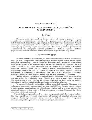 ANNA SZCZEPANIAK-KREFT1 BADANIE ODKSZTAŁCEŃ NABRZEŻA „HUTNIKÓW” W ŚWINOUJŚCIU 1. Wstęp Nabrzeża, stanowiące obudowę brzegu morza lub rzeki, wyposażone zwykle w urządzenia przeładunkowe, należą do podstawowych portowych budowli hydrotechnicznych. Budowle tego typu znajdują się często pod wpływem znacznych obciążeń statycznych i dynamicznych. Przed wydaniem zezwolenia na eksploatację nabrzeża warunkuje się ją między innymi wykonywaniem okresowych pomiarów przemieszczeń i odkształceń. W niniejszym artykule przedstawiono badania wykonane podczas przystosowania nabrzeża Hutników portu w Świnoujściu do przeładunku rudy żelaza. 2. Opis stanu istniejącego. Nabrzeże Hutników przeznaczone jest do cumowania i obsługi statków o wyporności do 65 tys. DWT. Długość linii cumowniczej całego nabrzeża wynosi 328 m. Składa się ona z nabrzeża narożnikowego (39m) i właściwego nabrzeża (289m). Głębokość dopuszczalna projektowana wynosi 14,0m, a eksploatacyjna 13,3m. Płyta nabrzeża ma szerokość 23m, przy rzędnej korony +2,5m. Płyta podzielona jest na dziesięć sekcji (rys.1). Rozwiązanie konstrukcji nabrzeża oparte jest na koncepcji ustroju płytowo-palowego, z przednią uszczelnioną palościanką oraz ze skarpą odciążającą pod płytą nabrzeża. Nabrzeże wyposażono w urządzenie przeładunkowe typu suwnica 40tx36/18/26m o wysokiej wydajności, całkowity ciężar suwnicy wynosi 960t, prędkość robocza v=5 – 20 m/min. Wzdłuż nabrzeża Hutników, w odległości 30m od linii cumowniczej, usytuowany jest plac operacyjny do przeładunku rudy. Długość tego placu wynosi 204m, szerokość 26m.Nawierzchnia z płyt żelbetowych przenosi obciążenia od hałdy rudy na podłoże; zakotwiona w niej jest również ścianka szczelna zabezpieczająca nabrzeże. W pierwszej kolejności obciążeniom poddano konstrukcję nabrzeża. Obciążenia były realizowane przy pomocy zamontowanej suwnicy 40tx36/18/26m. Badania przeprowadzono w trzech etapach, uwzględniając wszystkie elementy mające wpływ na pracę nabrzeża (np. cumowanie statków poziom wody w Świnie, temperatura powietrza, kierunek i siła wiatru, sztormowe kotwiczenie suwnicy). W czasie badań przeprowadzonych w I etapie obciążeń, nabrzeże było wolne od statków. Etap ten przewidywał wywołanie maksymalnie równomiernych obciążeń nabrzeża, przy przyjęciu określonego schematu pracy suwnicy i badanie pod tym obciążeniem przemieszczeń punktów pomiarowych na poszczególnych sekcjach nabrz 1 Politechnika Szczecińska, Szczecin Rys. 1 Nabrzeże Hutników Obserwacji stabilizacji przemieszczeń dokonano na sekcji nr 7 nabrzeża. Suwnica została przesunięta ze stanowiska montażowego na sekcje nr 7 i przy tym jej ustawieniu wykonano obserwację punktów pomiarowych w czasie: - bezpośrednio po ustawieniu suwnicy, - po 20 minutach, - po 40 minutach, - po 60 minutach, - po 120 minutach. Wielkości przemieszczeń zostały obliczone w stosunku do stanu pierwotnego, pomierzonego bezpośrednio przed ustawieniem suwnicy na badanej sekcji. Przedstawiony wyżej rozkład obserwacji w czasie, stosowany był przy obciążeniu pozostałych sekcji. Program badań wymagał trzykrotnego obciążenia każdej sekcji, według określonej kolejności, wymuszającej równomierne trwałe osiadanie obiektu. Etap I zakończono pomiarem po ustawieniu suwnicy na stanowisku montażowym. W II etapie badań maksymalnemu obciążeniu poddana została szyna odlądowa, a w etapie III – szyna odwodna, co uzyskano przez odpowiednie usytuowanie wózka chwytakowego suwnicy, obciążonego ciężarem eksploatacyjnym. Obserwacje geodezyjne przeprowadzono wg schematu czasowego, obowiązującego w etapie I. Badania konstrukcji placu operacyjnego i nabrzeża wraz ze ścianką szczelną, przeprowadzono również w trzech etapach obciążeń. W etapie I plac obciążony był rudą żelaza o ciężarze 17000 ton. Badania wykonano w pierwszym dniu po obciążeniu, a następnie w trzecim, piątym i siódmym dniu obciążenia. W etapie III na placu operacyjnym składowane było 25000 ton rudy; obowiązywał schemat czasowy obserwacji z etapu I. W etapie III plac pierwotnie obciążało 20000 ton rudy, a następnie w trakcie badań następowało stopniowe odciążenie placu. Po rocznej eksploatacji, cały obiekt poddany był badaniom kontrolnym. 3. Opis pomiarów i badań. Cykle prac pomiarowych związane były z wysokimi wymaganiami dokładnościowymi określenia przemieszczeń – poziomych z dokładnością ± 0,5mm, pionowych z dokładnością ± 0,33mm. 3.1. Badanie przemieszczeń pionowych. Do wyznaczenia przemieszczeń pionowych zostały zastosowane metody pomiaru, sprzęt pomiarowy i sposób wyrównania obserwacji, typowe dla precyzyjnej niwelacji geometrycznej ( 1 ). Pomiędzy zastabilizowanymi punktami pomiarowymi zaprojektowano ciągi niwelacyjne, zamykające możliwie najwięcej oczek sieci. Zaplanowano tak przebieg ciągów, aby nie ulegał on zmianie w trakcie długotrwałych badań. Jedynie podczas maksymalnych obciążeń placu operacyjnego były niedostępne do pomiaru niektóre umiejscowione na nim repery. Wyrównania kolejnych obserwacji przeprowadzono metodą spostrzeżeń pośredniczących, przy odrzuceniu warunku bezbłędności położenia reperów dopasowania. 3.2. Badanie przemieszczeń poziomych ( prostopadłych do osi podłużnej nabrzeża ). Badaniom tym poddano punkty zastabilizowane na szynie odwodnej i odlądowej toru podsuwnicowego oraz na oczepie ścianki szczelnej. Zastosowano zmodyfikowaną metodę stałej prostej, pozwalającą na pomiar poziomych przemieszczeń, prostopadłych do płaszczyzny pionowej przechodzącej przez wyznaczona prosta. Stała prosta realizowana była przez oś celową teodolitu. Obserwacje wykonano teodolitem precyzyjnym typu Wild T2, wyposażonym w nasadkę z płytką plasko-równoległą i mikrometrem. Stanowiska teodolitu obrano na południowych krań