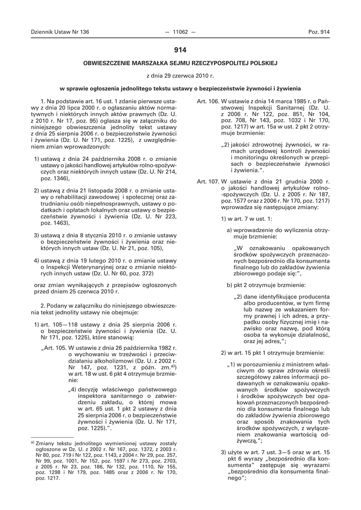Dziennik Ustaw Nr 136 — 11062 — Poz. 914 914 OBWIESZCZENIE MARSZAŁKA SEJMU RZECZYPOSPOLITEJ POLSKIEJ z dnia 29 czerwca 2010 r. w sprawie ogłoszenia jednolitego tekstu ustawy o bezpieczeństwie żywności i żywienia 1. Na podstawie art. 16 ust. 1 zdanie pierwsze ustawy z dnia 20 lipca 2000 r. o ogłaszaniu aktów normatywnych i niektórych innych aktów prawnych (Dz. U. z 2010 r. Nr 17, poz. 95) ogłasza się w załączniku do niniejszego obwieszczenia jednolity tekst ustawy z dnia 25 sierpnia 2006 r. o bezpieczeństwie żywności i żywienia (Dz. U. Nr 171, poz. 1225), z uwzględnieniem zmian wprowadzonych: 1) ustawą z dnia 24 października 2008 r. o zmianie ustawy o jakości handlowej artykułów rolno-spożywczych oraz niektórych innych ustaw (Dz. U. Nr 214, poz. 1346), 2) ustawą z dnia 21 listopada 2008 r. o zmianie ustawy o rehabilitacji zawodowej i społecznej oraz zatrudnianiu osób niepełnosprawnych, ustawy o podatkach i opłatach lokalnych oraz ustawy o bezpieczeństwie żywności i żywienia (Dz. U. Nr 223, poz. 1463), 3) ustawą z dnia 8 stycznia 2010 r. o zmianie ustawy o bezpieczeństwie żywności i żywienia oraz niektórych innych ustaw (Dz. U. Nr 21, poz. 105), 4) ustawą z dnia 19 lutego 2010 r. o zmianie ustawy o Inspekcji Weterynaryjnej oraz o zmianie niektórych innych ustaw (Dz. U. Nr 60, poz. 372) oraz zmian wynikających z przepisów ogłoszonych przed dniem 25 czerwca 2010 r. 2. Podany w załączniku do niniejszego obwieszczenia tekst jednolity ustawy nie obejmuje: 1) art. 105—118 ustawy z dnia 25 sierpnia 2006 r. o bezpieczeństwie żywności i żywienia (Dz. U. Nr 171, poz. 1225), które stanowią: „Art. 105. W ustawie z dnia 26 października 1982 r. o wychowaniu w trzeźwości i przeciwdziałaniu alkoholizmowi (Dz. U. z 2002 r. Nr 147, poz. 1231, z późn. zm.a)) w art. 18 w ust. 6 pkt 4 otrzymuje brzmienie: „4) decyzję właściwego państwowego inspektora sanitarnego o zatwierdzeniu zakładu, o której mowa w art. 65 ust. 1 pkt 2 ustawy z dnia 25 sierpnia 2006 r. o bezpieczeństwie żywności i żywienia (Dz. U. Nr 171, poz. 1225).”. a) Zmiany tekstu jednolitego wymienionej ustawy zostały ogłoszone w Dz. U. z 2002 r. Nr 167, poz. 1372, z 2003 r. Nr 80, poz. 719 i Nr 122, poz. 1143, z 2004 r. Nr 29, poz. 257, Nr 99, poz. 1001, Nr 152, poz. 1597 i Nr 273, poz. 2703, z 2005 r. Nr 23, poz. 186, Nr 132, poz. 1110, Nr 155, poz. 1298 i Nr 179, poz. 1485 oraz z 2006 r. Nr 170, poz. 1217. Art. 106. W ustawie z dnia 14 marca 1985 r. o Państwowej Inspekcji Sanitarnej (Dz. U. z 2006 r. Nr 122, poz. 851, Nr 104, poz. 708, Nr 143, poz. 1032 i Nr 170, poz. 1217) w art. 15a w ust. 2 pkt 2 otrzymuje brzmienie: „2) jakości zdrowotnej żywności, w ramach urzędowej kontroli żywności i monitoringu określonych w przepisach o bezpieczeństwie żywności i żywienia.”. Art. 107. W ustawie z dnia 21 grudnia 2000 r. o jakości handlowej artykułów rolno-spożywczych (Dz. U. z 2005 r. Nr 187, poz. 1577 oraz z 2006 r. Nr 170, poz. 1217) wprowadza się następujące zmiany: 1) w art. 7 w ust. 1: a) wprowadzenie do wyliczenia otrzymuje brzmienie: „W oznakowaniu opakowanych środków spożywczych przeznaczonych bezpośrednio dla konsumenta finalnego lub do zakładów żywienia zbiorowego podaje się:”, b) pkt 2 otrzymuje brzmienie: „2) dane identyfikujące producenta albo producentów, w tym firmę lub nazwę ze wskazaniem formy prawnej i ich adres, a przypadku osoby fizycznej imię i nazwisko oraz nazwę, pod którą osoba ta wykonuje działalność, oraz jej adres,”; 2) w art. 15 pkt 1 otrzymuje brzmienie: „1) w porozumieniu z ministrem właściwym do spraw zdrowia określi szczegółowy zakres informacji podawanych w oznakowaniu opakowanych środków spożywczych i środków spożywczych bez opakowań przeznaczonych bezpośrednio dla konsumenta finalnego lub do zakładów żywienia zbiorowego oraz sposób znakowania tych środków spożywczych, z wyłączeniem znakowania wartością odżywczą,”; 3) użyte w art. 7 ust. 3—5 oraz w art. 15 pkt 6 wyrazy „bezpośrednio dla konsumenta” zastępuje się wyrazami „bezpośrednio dla konsumenta finalnego”; Dziennik Ustaw Nr 136 — 11063 — Art. 111. W ustawie z dnia 6 września 2001 r. o transporcie drogowym (Dz. U. z 2004 r. Nr 204, poz. 2088, z późn. zm.e)) w art. 92 w ust. 1 pkt 6 otrzymuje brzmienie: 4) w art. 17 w ust. 1 w pkt 1 lit. d otrzymuje brzmienie: „d) powiadamianie podpunktu krajowego punktu kontaktowego w ramach sieci systemu wczesnego ostrzegania o niebezpiecznej żywności i paszach (systemu RASFF) o podjętych decyzjach dotyczących niebezpiecznych artykułów rolno-spożywczych,”. „6) o bezpieczeństwie żywności i żywienia”. Art. 112. W ustawie z dnia 13 września 2002 r. o napojach spirytusowych (Dz. U. Nr 166, poz. 1362, z 2004 r. Nr 29, poz. 257 i Nr 173, poz. 1808 oraz z 2006 r. Nr 133, poz. 935) wprowadza się następujące zmiany: Art. 108. W ustawie z dnia 11 stycznia 2001 r. o substancjach i preparatach chemicznych (Dz. U. Nr 11, poz. 84, z późn. zm.b)) wprowadza się następujące zmiany: 1) w art. 2 pkt 2 i 3 otrzymują brzmienie: „2) aromatyzowanie — użycie przy wyrobie napojów spirytusowych co najmniej jednej substancji naturalnej lub preparatu aromatycznego, ewentualnie substancji aromatycznej identycznej z naturalną, dopuszczonej na podstawie przepisów o bezpieczeństwie żywności i żywienia; 1) w art. 1 w ust. 3 w pkt 3 lit. b otrzymuje brzmienie: „b) środkami spożywczymi, w rozumieniu przepisów o bezpieczeństwie żywności i żywienia,”; 2) w art. 13 w ust. 1 pkt 3 otrzymuje brzmienie: 3) barwienie — użycie przy wyrobie napojów spirytusowych co najmniej jednego barwnika, dozwolonego na podstawie przepisów o bezpieczeństwie żywności i żywienia;”; „3) substancje nowe stosowane wyłącznie jako substancje dodatkowe do żywności, w rozumieniu przepisów o bezpieczeństwie żywności i żywienia,”. Art. 109. W u