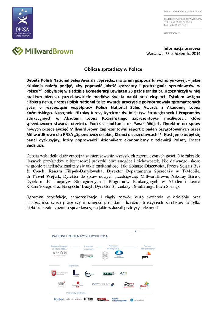 Informacja prasowa Warszawa, 28 października 2014 Oblicze sprzedaży w Polsce Debata Polish National Sales Awards „Sprzedaż motorem gospodarki wolnorynkowej, – jakie działania należy podjąd, aby poprawid jakośd sprzedaży i postrzeganie sprzedawców w Polsce?” odbyła się w siedzibie Konfederacji Lewiatan 23 października br. Uczestniczyli w niej praktycy biznesu, przedstawiciele mediów, świata nauki oraz eksperci. Tytułem wstępu Elżbieta Pełka, Prezes Polish National Sales Awards uroczyście poinformowała zgromadzonych gości o rozpoczęciu współpracy Polish National Sales Awards z Akademią Leona Koźmioskiego. Następnie Nikolay Kirov, Dyrektor ds. Inicjatyw Strategicznych i Programów Edukacyjnych w Akademii Leona Koźmioskiego zaprezentował możliwości, które sprzedawcom stwarza uczelnia. Podczas spotkania dr Paweł Wójcik, Dyrektor do spraw nowych przedsięwzięd MillwardBrown zaprezentował raport z badao przygotowanych przez MillwardBrown dla PNSA „Sprzedawcy o sobie, Klienci o sprzedawcach”*. Następnie odbył się panel dyskusyjny, który poprowadził dziennikarz ekonomiczny z telewizji Polsat, Ernest Bodziuch. Debata wzbudziła duże emocje i zainteresowanie wszystkich zgromadzonych gości. Nie zabrakło licznych przykładów z biznesowej praktyki oraz anegdot i ciekawostek. Nic dziwnego, skoro w gronie panelistów znalazły się takie znakomitości jak: Solange Olszewska, Prezes Solaris Bus & Coach, Renata Filipek-Baryłowska, Dyrektor Departamentu Sprzedaży w T-Mobile, dr Paweł Wójcik, Dyrektor do spraw nowych przedsięwzięć MillwardBrown, Nikolay Kirov, Dyrektor ds. Inicjatyw Strategicznych i Programów Edukacyjnych w Akademii Leona Koźmińskiego oraz Krzysztof Bazyl, Dyrektor Sprzedaży i Marketingu Eden Springs. Ogromna satysfakcja, samorealizacja i ciągły rozwój, duża swoboda w działaniu oraz elastycznośd czasu pracy czy możliwośd posiadania bardzo atrakcyjnych zarobków to tylko niektóre z zalet zawodu sprzedawcy, na jakie wskazali praktycy i eksperci. Jednak to również ogromna odpowiedzialnośd i presja, ponieważ nie kto inny, jak siły sprzedaży są wizytówką firmy i generują jej zyski. Podczas prezentacji zestawienia badao - wizerunku sprzedawcy we własnych oczach vs opinii klientów o sprzedawcach - szczególne zainteresowanie wzbudziły następujące dane. - 68% sprzedawców przyznało, że są świadomi tego, iż często zdarza się, że wykorzystują niewiedzę klientów w celu ułatwienia sobie sprzedaży produktu lub usługi – powiedział dr Paweł Wójcik, Dyrektor do spraw nowych przedsięwzięd MillwardBrown. - Natomiast zaledwie 19% klientów zadeklarowało, że sprzedawca wykorzystał ich niewiedzę w celu ułatwienia sobie sprzedaży. Według uczestników debaty klienci nie muszą byd ekspertami w każdej dziedzinie i to właśnie sprzedawca powinien byd dla nich wsparciem merytorycznym i pomocą. W żadnym wypadku natomiast nie może wykorzystywad tego faktu dla celów nieetycznych. Działania sprzedawców powinny byd nastawione na zbadanie potrzeb klientów oraz dopasowanie do nich najbardziej odpowiedniego produktu lub usługi. Tylko takie praktyki prowadzą bowiem do sukcesów w długiej perspektywie, powodują nawiązanie pozytywnych relacji z klientem oraz są gwarantem jego lojalności i budują zaufanie i dobrą markę firmy. Warto tu zwrócid uwagę, że według przeprowadzonych badao 40% respondentów przyznało, iż pod wpływem pozytywnego zachowania sprzedawcy przekonało się do korzystania z produktów lub usług firmy, którą reprezentował! Z badao wynika również, że pomimo przeważających pozytywnych opinii o polskich sprzedawcach, profesja ta niestety nie cieszy się jeszcze w oczach respondentów należytym uznaniem. - Aby przekonad się czy zawód sprzedawcy postrzegany jest jako prestiżowy, zadaliśmy respondentom podchwytliwe pytanie – powiedział dr Paweł Wójcik - „Czy chciałby(a)by Pan(i), aby Pana(i) dziecko zostało sprzedawcą?”. Okazało się, że 63% ankietowanych nie chce, aby ich dziecko w przyszłości wykonywało zawód sprzedawcy. To dużo i mało, ponieważ 20% respondentów życzyłoby sobie, aby ich dzieci w przyszłości wybrały zawód sprzedawcy. Jednak według gości spotkania wizerunek sprzedaży i sprzedawcy różni się bardzo w zależności od branży i produktu lub usługi, którą reprezentuje. - Sprzedawcami w mojej firmie są wyłącznie osoby z wyższym wykształceniem, znające języki obce, mające bardzo obszerną, gruntowną i fachową wiedzę, na co dzieo negocjujące z najlepszymi specjalistami w branży – twierdzi Solange Olszewska, Prezes Solaris Bus & Coach. - Dodam, że są to osoby bardzo dobrze zarabiające i darzone dużym szacunkiem zarówno wewnątrz nasze firmy, jak i w branży. Podczas spotkania wielokrotnie podkreślano wagę tworzenia wysokich standardów etycznych oraz etosu profesjonalnego sprzedawcy. - Niebawem odbędzie się już VI finał Konkursu Polish National Sales Awards. W tym roku mamy 46 sędziów w kapitule oceniających kandydatów według unikatowej metodologii. Już od siedmiu lat działamy na rzecz rozwoju sił sprzedaży w Polsce, nagradzamy dobre praktyki i dążymy do tego, aby relacja konsument – sprzedawca była oparta na obopólnym zaufaniu i satysfakcji. Wraz z intensyfikacją zadowolenia konsumentów wzrośnie prestiż zawodu sprzedawcy w oczach społeczeostwa – podsumowuje Elżbieta Pełka, Prezes Polish National Sales Awards. * Badanie Sprzedawcy o sobie zrealizował instytut Millward Brown dla PNSA Sondaż CAWI (wywiady przez internet) wśród przedstawicieli handlowych i pracowników działów sprzedaży, N=159, 12-25 lutego 2014 Badanie Sprzedawcy oczami konsumentów zrealizował instytut Millward Brown dla PNSA w czerwcu 2014 roku za pomocą sondażu CAPIBUS; ogólnopolska, losowa próba, reprezentatywna dla dorosłej (1575 lat) populacji Polaków (~30 221 tys. osób). PNSA - Poli