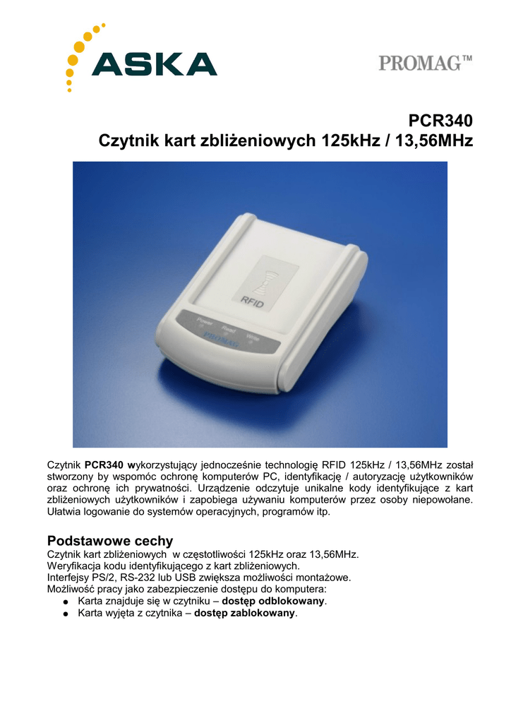 PCR340 Czytnik kart zbliżeniowych 125kHz / 13,56MHz Czytnik PCR340 wykorzystujący jednocześnie technologię RFID 125kHz / 13,56MHz został stworzony by wspomóc ochronę komputerów PC, identyfikację / autoryzację użytkowników oraz ochronę ich prywatności. Urządzenie odczytuje unikalne kody identyfikujące z kart zbliżeniowych użytkowników i zapobiega używaniu komputerów przez osoby niepowołane. Ułatwia logowanie do systemów operacyjnych, programów itp. Podstawowe cechy Czytnik kart zbliżeniowych w częstotliwości 125kHz oraz 13,56MHz. Weryfikacja kodu identyfikującego z kart zbliżeniowych. Interfejsy PS/2, RS-232 lub USB zwiększa możliwości montażowe. Możliwość pracy jako zabezpieczenie dostępu do komputera: ● Karta znajduje się w czytniku – dostęp odblokowany. ● Karta wyjęta z czytnika – dostęp zablokowany. PCR340 Zastosowania Ochrona komputerów przed dostępem osób niepowołanych. Kontrola czasu pracy. Logowanie do systemów. Systemy POS. Automatyczne logowanie. Dane techniczne Częstotliwość odczytu 125kHz / 13,56MHz Parametry transmisji 19200 \ 14400 \ 9600 \ 4800 \ 2400 bps Typy kart EM compatible64 bits, ASK Manchester coding, ISO 14443A, Mifare® MF1 1K&4K Odległość odczytu 80mm dla kart 125kHz 40mm dla kart 13,56MHz Zasilanie 5V / 70 mA Interfejsy USB \ PS2 \ RS-232 Wymiary 86 x 120 x 42mm Materiał obudowy ABS Certyfikaty bezpieczeństwa CE / FCC Wymiary karty Max. 86 x 55 x 2mm Temperatura otoczenia -0° ~ +50° C (praca) -10° ~ +60° C (przechowywanie) Wilgotność otoczenia 10 ~90 % Dostępne wersje: PCR340 – interfejs USB PCR340 – interfejs PS/2 PCR340 – interfejs RS-232 Przedstawiciel w Polsce: ASKA ul. Wędkarska 2A/B1, 04-869 Warszawa tel. 22 4985908/9, fax 22 6177020 e-mail: [email protected] www.kodykreskowe.com