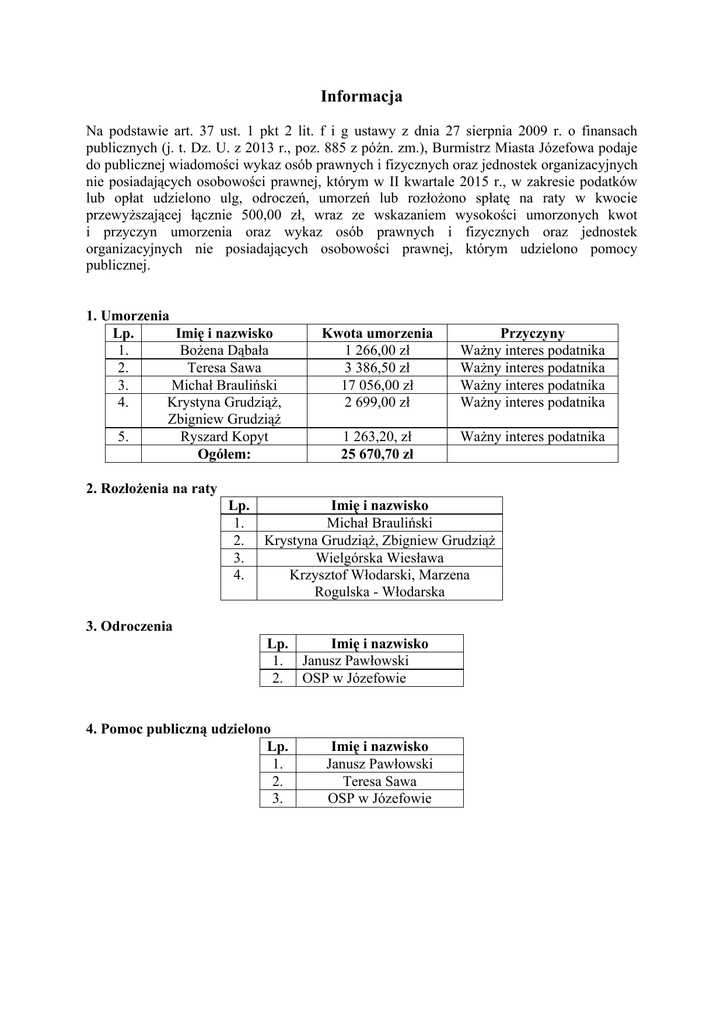 Informacja Na podstawie art. 37 ust. 1 pkt 2 lit. f i g ustawy z dnia 27 sierpnia 2009 r. o finansach publicznych (j. t. Dz. U. z 2013 r., poz. 885 z późn. zm.), Burmistrz Miasta Józefowa podaje do publicznej wiadomości wykaz osób prawnych i fizycznych oraz jednostek organizacyjnych nie posiadających osobowości prawnej, którym w II kwartale 2015 r., w zakresie podatków lub opłat udzielono ulg, odroczeń, umorzeń lub rozłożono spłatę na raty w kwocie przewyższającej łącznie 500,00 zł, wraz ze wskazaniem wysokości umorzonych kwot i przyczyn umorzenia oraz wykaz osób prawnych i fizycznych oraz jednostek organizacyjnych nie posiadających osobowości prawnej, którym udzielono pomocy publicznej. 1. Umorzenia Lp. Imię i nazwisko 1. Bożena Dąbała 2. Teresa Sawa 3. Michał Brauliński 4. Krystyna Grudziąż, Zbigniew Grudziąż 5. Ryszard Kopyt Ogółem: Kwota umorzenia 1 266,00 zł 3 386,50 zł 17 056,00 zł 2 699,00 zł Przyczyny Ważny interes podatnika Ważny interes podatnika Ważny interes podatnika Ważny interes podatnika 1 263,20, zł 25 670,70 zł Ważny interes podatnika 2. Rozłożenia na raty Lp. 1. 2. 3. 4. Imię i nazwisko Michał Brauliński Krystyna Grudziąż, Zbigniew Grudziąż Wielgórska Wiesława Krzysztof Włodarski, Marzena Rogulska - Włodarska 3. Odroczenia Lp. Imię i nazwisko 1. Janusz Pawłowski 2. OSP w Józefowie 4. Pomoc publiczną udzielono Lp. 1. 2. 3. Imię i nazwisko Janusz Pawłowski Teresa Sawa OSP w Józefowie