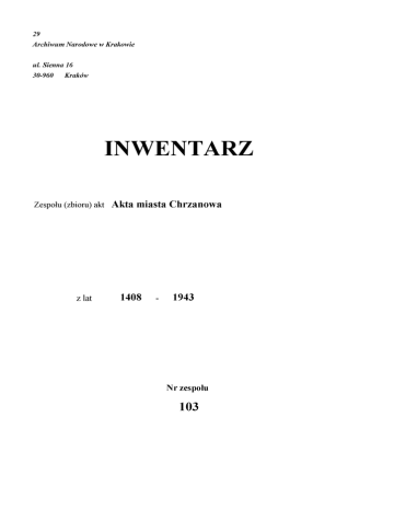 29 Archiwum Narodowe w Krakowie ul. Sienna 16 30-960 Kraków INWENTARZ Zespołu (zbioru) akt z lat Akta miasta Chrzanowa 1408 - 1943 Nr zespołu 103 DOKUMENTY Sygnatura Dok Dep 343 Sygnatury dawne N 33 Data dokumentu 1500.06.04 Miejsce wystawienia Bobrek Regest Piotr Ligęza z Bobrku nadaje przywilejem mieszczanom w Chrzanowie szereg praw, a także określa ich obowiązki Pieczęcie Pieczęć Piotra Ligęzy z herbem Półkozic woskowa w puszce metalowej na sznurku Język łaciński M ateriał pisarski pergamin Uwagi N a odwrociu pieczęć tuszowa A rchiwum Państwowego Katowic z wizerunkiem orła ze sfastyką Sygnatura Dok Dep 344 Sygnatury dawne II Data dokumentu 1646.12.15 Miejsce wystawienia Chrzanów Regest Andrzej Samuel Dembieński kasztelan biecki, dziedziczny pan Chrzanowa nadaje mieszczanom chrzanowskim szereg praw, najszerzej omówione prawo propinacji i określa ich obowiązki Pieczęcie Pieczęć A ndrzeja Dembieńskiego z herbem Rawicz woskowa w puszce metalowej na sznurku Język polski M ateriał pisarski pergamin Uwagi Sygnatura Dok Dep 345 Sygnatury dawne No 3 Data dokumentu 1781.10.09 Miejsce wystawienia Warszawa Regest Stanisław August Poniatowski król polski nadaje miastu Chrzanów dziedzicznemu Józefa i Maksymiliana Ossolińskich przywilej na dwa jarmarki dwuniedzielne Pieczęcie Pieczęć wielka koronna Stanisława Augusta (Gum 183) papierowa na podkładzie woskowym Język polski M ateriał pisarski papier Uwagi Strona 8 Sygnatura Dok Dep 346 Sygnatury dawne Data dokumentu 1789.03.20 Miejsce wystawienia Chrzanów Regest Antoni Zaleski starosta pełczyński jako pełnomocnik dziedzica Chrzanowa Józefa Ossolińskiego wojewody podlaskiego zezwala Kazimierzowi Peynarzewskiemu i Antoniemu Dulowskiemu pobudować się na ogrodzie szpitalnym za czynszem rocznym 16 złp od obu Pieczęcie loco sigillo Język polski M ateriał pisarski papier Uwagi O gólna liczba pozycji: 4 Strona 9 Księgi radzieckie Tytuł\Treść: Księga radziecka spraw sądowych Chrzanowa Sygnatura: DEP 38 Daty: 1527-1604 ss. 330 Opis j.a.: księga; ; ; ; ; dutka Sygnatury dawne: Uwagi: oprawny w skórę, P. III Tytuł\Treść: Księga radziecka spraw sądowych Chrzanowa Sygnatura: DEP 41 Daty: 1555-1564 ss. 227 Opis j.a.: księga; ; ; ; ; dutka Sygnatury dawne: Uwagi: nieoprawny, P. VI: „księga radziecko-ławnicza” Księgi radziecko-ławnicze Tytuł\Treść: Zapiski radzieckie, ławnicze, przyjęć do prawa miejskiego, rachunki miejskie Chrzanowa Sygnatura: DEP 36 Daty: 1408-1526 ss. 182 Opis j.a.: księga; ; ; ; ; dutka Sygnatury dawne: Uwagi: oprawny w pergamin, Pęckowski, t. I [P. I] Tytuł\Treść: Księga radziecko-ławnicza Chrzanowa (acta inscriptionum) Sygnatura: DEP 49 Daty: 1667-1788 Opis j.a.: księga; ; ; rękopis; ; in quarto ss. 249 Sygnatury dawne: Uwagi: oprawny w skórę, P. XIV: „przede wszystkim radzieckie - akta administracyjne i sądowe” Tytuł\Treść: Księga radziecko-ławnicza Chrzanowa. [z drugiej strony] Taksa wojewodzińska z 1764 r., uniwersały komisji itd. Sygnatura: DEP 51 Daty: 1763-1779 ss. 275 Opis j.a.: księga; ; ; rękopis; ; folio Sygnatury dawne: Uwagi: oprawny w tekturę, P. XVI Tytuł\Treść: Księga radziecko-ławnicza Chrzanowa Sygnatura: DEP 52 Opis j.a.: księga; ; ; rękopis; ; folio Daty: 1763-1778 ss. 150 Sygnatury dawne: Uwagi: oprawny w tekturę, P. XVII Tytuł\Treść: Księga radziecko-ławnicza Chrzanowa. [od drugiej strony księgi] Akta różne, np. Nr zespołu: 103 Strona 3 manifesty pana przeciw proboszczowi, Żyda przeciw synagodze itd. Sygnatura: DEP 53 Daty: 1763-1779 Opis j.a.: księga; ; ; rękopis; ; folio ss. 272 Sygnatury dawne: Uwagi: oprawny w tekturę, P. XVIII: „oblaty uniwersały urzędu dworskiego” Księgi ławnicze Tytuł\Treść: Księga ławnicza Chrzanowa Sygnatura: DEP 37 Daty: 1430-1522 Opis j.a.: księga; ; ; rękopis; ; dutka ss. 646 Sygnatury dawne: Uwagi: oprawny w pergamin, P. II. Zakończenie tej księgi w postaci składki s. 631-646 z l. 1522-1524 przekazała Biblioteka Jagiellońska pismem z dnia 2.10.1967 nr B28a/65/67/68/Kow. (6.10.1967, A. Kamiński) Tytuł\Treść: Księga ławnicza Chrzanowa Sygnatura: DEP 39 Daty: 1550-1554 Opis j.a.: księga; ; ; rękopis; ; dutka ss. 162 Sygnatury dawne: Uwagi: oprawny w pergamin, P. IV: „księga radziecka” Tytuł\Treść: Księga ławnicza Chrzanowa Sygnatura: DEP 40 Daty: 1552-1579 Opis j.a.: księga; do konserwacji; ; rękopis; ; dutka ss. 622 Sygnatury dawne: Uwagi: oprawny w pergamin, uszkodzony, P. V: „przeważnie protokoły sądu wójtowskiego” Tytuł\Treść: Księga ławnicza Chrzanowa Sygnatura: DEP 42 Daty: 1579-1595 Opis j.a.: księga; ; ; rękopis; ; dutka ss. 536 Sygnatury dawne: Uwagi: oprawny w pergamin, P. VII Tytuł\Treść: Księga ławnicza Chrzanowa Sygnatura: DEP 43 Daty: 1595-1607 Opis j.a.: księga; ; ; rękopis; ; dutka ss. 572 Sygnatury dawne: Uwagi: oprawny w pergamin, P. VIII: „sprawy sporne i niesporne” Tytuł\Treść: Księga ławnicza Chrzanowa Sygnatura: DEP 44 Opis j.a.: księga; ; ; rękopis; ; dutka Nr zespołu: 103 Daty: 1607-1611 ss. 284 Strona 4 Sygnatury dawne: Uwagi: oprawny w pergamin, P. IX: „rezygnacje” Tytuł\Treść: Księga ławnicza Chrzanowa Sygnatura: DEP 45 Daty: 1611-1640 Opis j.a.: księga; ; ; rękopis; ; dutka ss. 666 Sygnatury dawne: Uwagi: oprawny w pergamin, P. X: „rezygnacje inne” Tytuł\Treść: Księga ławnicza Chrzanowa Sygnatura: DEP 46 Daty: 1622-1643 Opis j.a.: księga; ; ; rękopis; ; dutka ss. 554 Sygnatury dawne: Uwagi: oprawny w skórę, na początku indeks, P. XI: „księga urzędu wójtowskiego” Tytuł\Treść: Księga ławnicza Chrzanowa Sygnatura: DEP 47 Daty: 1635-1702 Opis j.a.: księga; ; ; rękopis; ; folio ss. 389 Sygnatury dawne: Uwagi: oprawny w pergamin, P. XII: „inskrypcje-rezygnacje” Tytuł\Treść: Księga ławnicza Chrzanowa Sygnatura: DEP 48 Daty: 1643-1679 Opis j.a.: księga; ; ; rękopis; ; in quarto ss. 650 Sygnatury dawne: Uwagi: oprawny w skór