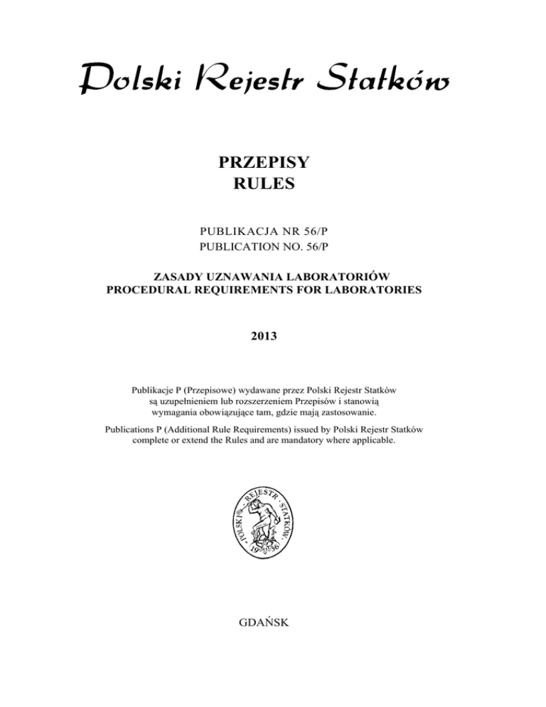 PRZEPISY RULES PUBLIKACJA NR 56/P PUBLICATION NO. 56/P ZASADY UZNAWANIA LABORATORIÓW PROCEDURAL REQUIREMENTS FOR LABORATORIES 2013 Publikacje P (Przepisowe) wydawane przez Polski Rejestr Statków są uzupełnieniem lub rozszerzeniem Przepisów i stanowią wymagania obowiązujące tam, gdzie mają zastosowanie. Publications P (Additional Rule Requirements) issued by Polski Rejestr Statków complete or extend the Rules and are mandatory where applicable. GDAŃSK Publikacja Nr 56/P – Zasady uznawania laboratoriów – 2013, stanowi rozszerzenie wymagań Części IX – Materiały i spawanie, Przepisów klasyfikacji i budowy statków morskich oraz wszystkich innych Przepisów PRS, w których została przywołana. Publikacja ta została zatwierdzona przez Zarząd PRS S.A. w dniu 23 kwietnia 2013 r. i wchodzi w życie z dniem 10 maja 2013 r. Niniejsza Publikacja zastępuje Publikację Nr 56/P – Zasady uznawania laboratoriów – 2009. PRS Publication No. 56/P – Procedural Requirements for Laboratories – 2013, is an extension of the requirements contained in Part IX – Materials and Welding of the Rules for the Classification and Construction of Sea-going Ships. This Publication was approved by the PRS Board on 23 April 2013 and enters into force on 10 May 2013. The present Publication replaces Publication No. 56/P – Procedural Requirements for Laboratories – 2009. © Copyright by Polski Rejestr Statków S.A., 2013 PRS/AW, 04/2013 ISBN 978-83-7664-123-2 SPIS TREŚCI str. 1 Postanowienia ogólne............................................................................................... 1.1 Postanowienia ogólne ........................................................................................ 1.2 Określenia i definicje......................................................................................... 1.3 Dokumenty przywołane w Publikacji................................................................ 5 5 5 5 2 Zakres zastosowania ................................................................................................ 6 3 Procedura uznawania laboratoriów ....................................................................... 3.1 Wymagane dokumenty ...................................................................................... 3.2 Wymagania ogólne ............................................................................................ 3.3 Inspekcja laboratorium ...................................................................................... 3.4 Sprawozdanie z inspekcji .................................................................................. 3.5 System jakości ................................................................................................... 6 6 7 10 10 11 4 Świadectwo uznania................................................................................................. 11 5 Nadzór nad uznanymi laboratoriami ..................................................................... 12 6 Unieważnienie Świadectwa uznania ....................................................................... 12 7 Specjalne wymagania dotyczące laboratoriów różnych kategorii ....................... 7.1 Badania niszczące.............................................................................................. 7.2 Badania nieniszczące......................................................................................... 7.3 Badania palnościowe ......................................................................................... 7.4 Pomiary gazometryczne .................................................................................... 13 13 14 15 16 CONTENTS page 1 General...................................................................................................................... 1.1 General Provisions............................................................................................. 1.2 Abbreviations .................................................................................................... 1.3 Reference Documents........................................................................................ 19 19 19 19 2 Application................................................................................................................ 20 3 Procedure for Approval of Laboratories ............................................................... 3.1 Submission of Documents ................................................................................. 3.2 General Requirements ....................................................................................... 3.3 Inspection of the Laboratory.............................................................................. 3.4 Inspection Report............................................................................................... 3.5 Quality Management System............................................................................. 20 20 21 24 24 24 4 Approval Certificate ................................................................................................ 25 5 Control over Approved Laboratories..................................................................... 25 6 Cancellation of Approval Certificate...................................................................... 26 7 Special Requirements for Various Categories of Laboratories........................... 7.1 Destructive Testing............................................................................................ 7.2 Non-destructive Testing .................................................................................... 7.3 Fire Testing........................................................................................................ 7.4 Gasometric Measurements................................................................................. 26 26 27 28 29 1 1.1 POSTANOWIENIA OGÓLNE Postanowienia ogólne 1.1.1 Niniejsza Publikacja określa zasady i