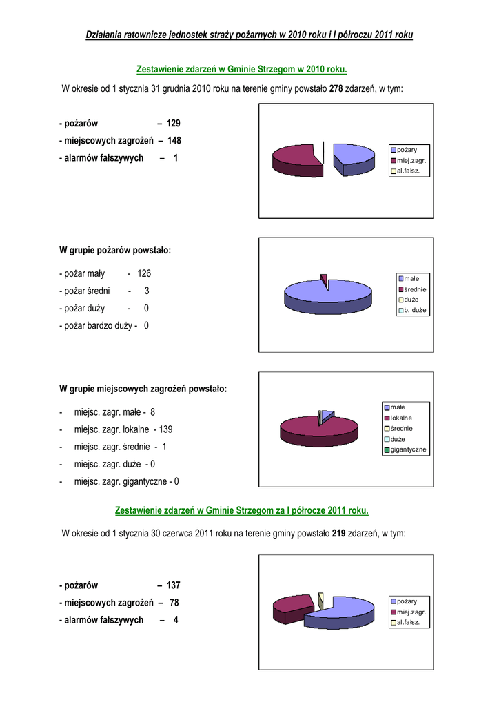 Działania ratownicze jednostek straży pożarnych w 2010 roku i I półroczu 2011 roku Zestawienie zdarzeń w Gminie Strzegom w 2010 roku. W okresie od 1 stycznia 31 grudnia 2010 roku na terenie gminy powstało 278 zdarzeń, w tym: - pożarów – 129 - miejscowych zagrożeń – 148 - alarmów fałszywych – 1 pożary miej.zagr. al.fałsz. W grupie pożarów powstało: - pożar mały - 126 - pożar średni - 3 średnie - pożar duży - 0 b. duże małe duże - pożar bardzo duży - 0 W grupie miejscowych zagrożeń powstało: - miejsc. zagr. małe - 8 małe - miejsc. zagr. lokalne - 139 średnie - miejsc. zagr. średnie - 1 - miejsc. zagr. duże - 0 - miejsc. zagr. gigantyczne - 0 lokalne duże gigantyczne Zestawienie zdarzeń w Gminie Strzegom za I półrocze 2011 roku. W okresie od 1 stycznia 30 czerwca 2011 roku na terenie gminy powstało 219 zdarzeń, w tym: - pożarów – 137 - miejscowych zagrożeń – 78 - alarmów fałszywych – 4 pożary miej.zagr. al.fałsz. W grupie pożarów powstało: - pożar mały - 135 - pożar średni - 2 średnie - pożar duży - 0 b. duże małe duże - pożar bardzo duży - 0 W grupie miejscowych zagrożeń powstało: - miejsc. zagr. małe - 13 małe - miejsc. zagr. lokalne - 64 średnie - miejsc. zagr. średnie - 1 - miejsc. zagr. duże - 0 - miejsc. zagr. gigantyczne - 0 lokalne duże gigantyczne LEGENGA: POŻAR - jest to niekontrolowany proces palenia, w miejscu do tego nie przeznaczonym, MIEJSCOWE ZAGROŻENIA – jest to inne niż pożar zdarzenie wynikające z rozwoju cywilizacyjnego i naturalnych praw przyrody, a stwarzające zagrożenie dla życia, środowiska lub mienia, ALARM FAŁSZYWY - jest to wezwania podmiotów systemu ratowniczo – gaśniczego lub innych jednostek ochrony przeciwpożarowej do zdarzenia, które faktycznie nie miało miejsca lub zaistniało, lecz nie wymagało podjęcia działań ratowniczych. PODZIAŁ POŻARÓW WEDŁUG ICH WIELKOŚCI: mały - występuje, jeśli w jego wyniku zostały spalone lub zniszczone: a) obiekty lub ich części, ruchomości, składowiska materiałów, maszyny, urządzenia, surowce, paliwa itp., o powierzchni do 70 m2 lub objętości do 350 m3, b) lasy, uprawy, trawy, torfowiska i nieużytki, o powierzchni nie większej niż 1 ha, średni - występuje, jeśli w jego wyniku zostały spalone lub zniszczone: a) obiekty lub ich części, ruchomości, składowiska materiałów, maszyny, urządzenia, surowce, paliwa itp., o powierzchni od 71 do 300 m2 lub objętości od 351 do 1.500 m3, b) lasy, uprawy, trawy, torfowiska i nieużytki, o powierzchni powyżej 1 ha i nie większej niż 10 ha, duży - występuje, jeśli w jego wyniku zostały spalone lub zniszczone: a) obiekty lub ich części, ruchomości, składowiska materiałów, maszyny, urządzenia, surowce, paliwa itp., o powierzchni od 301 do 1.000 m2 lub objętości od 1.501 do 5.000 m3, b) lasy, uprawy, trawy, torfowiska i nieużytki, o powierzchni powyżej 10 ha i nie większej niż 100 ha, bardzo duży - występuje, jeśli w jego wyniku spalone lub zniszczone powierzchnie lub objętości przekraczają wartości podanych prądów gaśniczych: 1) pożar mały - jeżeli podano do 4 prądów gaśniczych, 2) pożar średni - jeżeli podano 5- 12 prądów gaśniczych, 3) pożar duży - jeżeli podano 13-36 prądów gaśniczych, 4) pożar bardzo duży - jeżeli podano powyżej 36 prądów gaśniczych, bez względu na ich rodzaj i wielkość. PODZIAŁ MIEJSCOWYCH ZAGROŻEŃ WEDŁUG ICH WIELKOŚCI: małe - jako nagłe, uszkodzenia elementów urządzeń, maszyn, pojazdów, obiektów, które mogą powodować zagrożenie dla życia, zdrowia lub mienia, wymagające interwencji podmiotów systemu lub innych jednostek ochrony przeciwpożarowej, a także gdy jednostki ochrony przeciwpożarowej wspomagają inne służby ratownicze, porządkowe, mogące także występować jako prawdopodobne, wymagające jednak rozpoznania tego zagrożenia, 2 lokalne - jako nagłe, uszkodzenia części obiektu, w szczególności budynku lub urządzenia technicznego powodujące przerwę w jego użytkowaniu lub utratę jego właściwości funkcjonalnych, stwarzające zagrożenie dla życia, zdrowia lub mienia, średnie - jako nagłe zdarzenie, którego następstwem jest jednostkowe zagrożenie dla życia, zdrowia, mienia lub skażenie środowiska, występujące na niewielkim obszarze, powierzchni lub ograniczone do jednego obiektu, duże - jako nagłe, nieprzewidziane zdarzenie, podczas którego wystąpiło zbiorowe zagrożenie dla życia, zdrowia, mienia dużej wartości lub środowiska naturalnego, występujące na znacznym obszarze, gigantyczne lub klęski żywiołowe - jako zdarzenie losowe spowodowane siłami natury lub wynikające z działań człowieka, których następstwem jest powszechne zagrożenie dla życia, zdrowia lub mienia; może występować w szczególności w wyniku huraganów, powodzi, intensywnych opadów śniegu lub deszczu, trzęsień ziemi lub tąpnięć, dużych skażeń chemicznych, ekologicznych lub radiacyjnych, obejmujące duże obszary kraju, np. obszar gminy, dzielnicy miasta. PODZIAŁ ALARMÓW FAŁSZYWYCH: złośliwe - zgłaszając zdarzenie sprawca miał na celu wprowadzenie podmiotów systemu lub innych jednostek ochrony przeciwpożarowej w błąd, w dobrej wierze - zgłaszający zdarzenie zaobserwował symptomy zagrożenia, np.: dymy, pary, zapachy, lecz po przybyciu na miejsce zagrożenie samoistnie zakończyło się bez możliwości stwierdzenia miejsca lub przyczyny, nie stwarzało zagrożenia, np. para z urządzeń wentylacyjnych lub klimatyzacyjnych, dymy lub ognie technologiczne, wypalanie materiałów pod nadzorem w miejscach do tego celu przeznaczonych, inne zdarzenia, które nie wymagały podjęcia działań ratowniczych, z instalacji wykrywania - zgłaszane przez instalacje wykrywania pożaru lub innych zagrożeń, spowodowane zadziałaniem czujników z takich przyczyn, jak w szczególności: odbłyski światła, dostanie się chwi