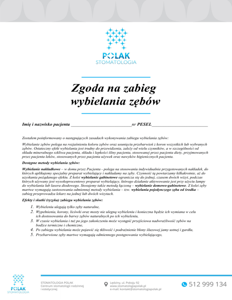 Zgoda na zabieg wybielania zębów Imię i nazwisko pacjenta __________________________nr PESEL________________________ Zostałem poinformowany o nastepujacych zasadach wykonywania zabiegu wybielania zebow: Wybielanie zebow polega na rozjasnieniu koloru zebow oraz usunieciu przebarwien z koron wszystkich lub wybranych zebow. Ostateczny efekt wybielania jest trudny do przewidzenia, zalezy od wielu czynnikow, a w szczegolnosci od składu mineralnego szkliwa pacjenta, składu i lepkosci sliny pacjenta, stosowanej przez pacjenta diety, przyjmowanych przez pacjenta lekow, stosowanych przez pacjenta uzywek oraz nawykow higienicznych pacjenta. Dostępne metody wybielania zębów: Wybielanie nakładkowe – w domu przez Pacjenta - polega na stosowaniu indywidualnie przygotowanych nakładek, do ktorych aplikujemy specjalny preparat wybielajacy i nakładamy na zeby. Czynnosc ta powtarzamy kilkakrotnie, az do uzyskania pozadanego efektu. Z kolei wybielanie gabinetowe ogranicza sie do jednej, czasem dwoch wizyt, podczas ktorych uzywany jest wysokoprocentowy preparat wybielajacy, ktorego działanie aktywowanie jest przy uzyciu lampy do wybielania lub lasera diodowego. Stosujemy takze metoda łaczona – wybielanie domowo-gabinetowe. Z kolei zeby martwe wymagaja zastosowania odmiennej metody wybielania – tzw. wybielania pojedynczego zęba od srodka – zabieg przeprowadza lekarz na jednej lub dwoch wizytach. Efekty i skutki (ryzyka) zabiegu wybielania zębów: 1. Wybieleniu ulegaja tylko zeby naturalne, 2. Wypełnienia, korony, licowki oraz mosty nie ulegna wybieleniu i konieczna bedzie ich wymiana w celu ich dostosowania do barwy zebow naturalnych po ich wybieleniu, 3. W czasie wybielania i tuz po jego zakonczeniu moze wystapic przejsciowa nadwrazliwosc zebow na 4. 5. bodzce termiczne i chemiczne, Po zabiegu wybielania moze pojawic sie tkliwosc i podraznienie błony sluzowej jamy ustnej i gardła, Przebarwione zeby martwe wymagaja odmiennego postepowania wybielajacego, 6. W czasie wybielania i 7 dni po jego zakonczeniu nalezy stosowac tzw. biała diete złozona z 7. 8. 9. niebarwiacych składnikow zywnosciowych, a w szczegolnosci unikac spozywania kawy, herbaty, czerwonego wina, barszczu, sosu sojowego, sokow i napojow o ciemnych barwach, Nalezy bezwzglednie zrezygnowac z palenia tytoniu, Nalezy stosowac zabiegi i preparaty higieniczne zalecone przez lekarza, Aby utrzymac jak najdłuzej efekt wybielenia zebow nalezy wykonywac stomatologiczne badanie kontrolne nie pozniej niz co 6 miesiecy, regularnie usuwac złogi nazebne, dbac o higiene jamy ustnej według zalecen lekarza, zminimalizowac spozycie płynow i pokarmow zawierajacych barwniki. Utrzymanie efektu wybielania zalezy od diety i nawykow pacjenta. Oswiadczenie o zgodzie na zabieg Powyzsze zasady przeczytałem i zrozumiałem, uzyskałem rowniez wszelkie wyjasnienia dotyczace postepowania w moim przypadku, w tym o technice zabiegu i o przebiegu proponowanego leczenia. Miałem mozliwosc uzyskania od lekarza lub higienistki stomatologicznej dodatkowych wyjasnien dotyczacych zabiegu wybielania zebow. Zostałem poinformowany o alternatywnych mozliwosciach postepowania, z zaniechaniem zabiegu wybielania włacznie. Zostałem poinformowany o ryzykach towarzyszacym innym metodom i konsekwencjach wynikajacych z zaniechania zabiegu. Rozumiem, ze tak jak w przypadku wszystkich procedur ogolnomedycznych, pozytywne efekty wybielania nie sa zagwarantowane. Wybielanie jest podejmowane w celu usuniecia konkretnego problemu i moze nie wyeliminowac innych ukrytych problemow zarowno natury zdrowotnej, jak i estetycznej. Wybielanie nie zabezpiecza przed prochnica, złamaniem zeba oraz chorobami przyzebia. W wyjatkowych sytuacjach zab moze wymagac ponownego wybielania lub leczenia zachowawczo-protetycznego. Zostałem rowniez poinformowany, ze do czasu rozpoczecia i w jego trakcie moge odwołac zgode na wybielanie, przy czym w zaleznosci od chwili odwołania zgody rozne moga byc dla mnie skutki przerwania zabiegu, zarowno o charakterze zdrowotnym, jak i estetycznym. Zobowiazuje sie do przestrzegania wszystkich ww. zalecen lekarskich, ze szczegolnym uwzglednieniem higieny jamy ustnej, oraz do zgłaszania sie na wizyty kontrolne w wyznaczonych terminach. Oswiadczam, ze udzieliłem wyczerpujacych i prawdziwych informacji co do mojego obecnego stanu zdrowia – zgodnie z ankieta stanowiaca załacznik do niniejszego oswiadczenia. O wszelkich zmianach stanu mojego zdrowia zobowiazuje sie powiadomic lekarza prowadzacego niezwłocznie. Wyrazam zgode na wykonanie dokumentacji radiologicznej oraz fotograficznej podczas zabiegow i w czasie wizyt kontrolnych oraz jej przechowywanie w mojej dokumentacji medycznej. W zwiazku z powyzszym, oswiadczam, ze zgodnie z art. 32 – 35 ustawy z dnia 5 grudnia 1996 r. o zawodach lekarza i lekarza dentysty (tekst jednolity Dz. U. z 2008 nr 136 poz. 857 z pozniejszymi zmianami) oraz art. 16 -18 ustawy z dnia 6 listopada 2008 r. o prawach pacjenta i Rzeczniku Praw Pacjenta (Dz. U. 2009 r. Nr 52 poz. 417 z pozn. zm.) wyrazam zgode na wykonanie zabiegu wybielania zebow metoda: ______________________________________________________________________________________ ______________________________________________________________________________________ ___________________________ Data, Podpis i pieczatka lekarza dentysty _____________________________ Czytelny podpis pacjenta / opiekuna