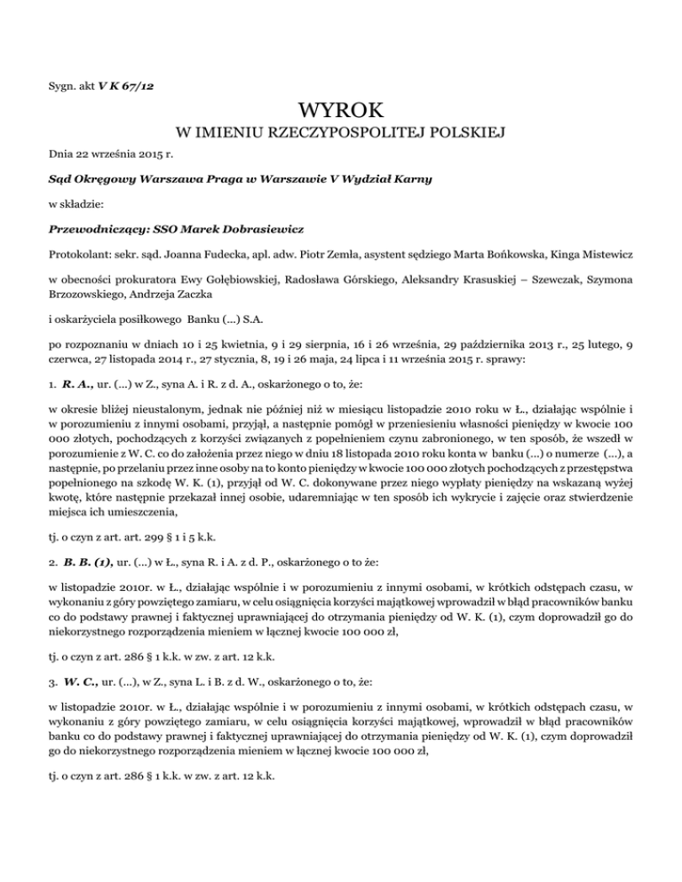 Sygn. akt V K 67/12 WYROK W IMIENIU RZECZYPOSPOLITEJ POLSKIEJ Dnia 22 września 2015 r. Sąd Okręgowy Warszawa Praga w Warszawie V Wydział Karny w składzie: Przewodniczący: SSO Marek Dobrasiewicz Protokolant: sekr. sąd. Joanna Fudecka, apl. adw. Piotr Zemła, asystent sędziego Marta Bońkowska, Kinga Mistewicz w obecności prokuratora Ewy Gołębiowskiej, Radosława Górskiego, Aleksandry Krasuskiej – Szewczak, Szymona Brzozowskiego, Andrzeja Zaczka i oskarżyciela posiłkowego Banku (...) S.A. po rozpoznaniu w dniach 10 i 25 kwietnia, 9 i 29 sierpnia, 16 i 26 września, 29 października 2013 r., 25 lutego, 9 czerwca, 27 listopada 2014 r., 27 stycznia, 8, 19 i 26 maja, 24 lipca i 11 września 2015 r. sprawy: 1. R. A., ur. (...) w Z., syna A. i R. z d. A., oskarżonego o to, że: w okresie bliżej nieustalonym, jednak nie później niż w miesiącu listopadzie 2010 roku w Ł., działając wspólnie i w porozumieniu z innymi osobami, przyjął, a następnie pomógł w przeniesieniu własności pieniędzy w kwocie 100 000 złotych, pochodzących z korzyści związanych z popełnieniem czynu zabronionego, w ten sposób, że wszedł w porozumienie z W. C. co do założenia przez niego w dniu 18 listopada 2010 roku konta w banku (...) o numerze (...), a następnie, po przelaniu przez inne osoby na to konto pieniędzy w kwocie 100 000 złotych pochodzących z przestępstwa popełnionego na szkodę W. K. (1), przyjął od W. C. dokonywane przez niego wypłaty pieniędzy na wskazaną wyżej kwotę, które następnie przekazał innej osobie, udaremniając w ten sposób ich wykrycie i zajęcie oraz stwierdzenie miejsca ich umieszczenia, tj. o czyn z art. art. 299 § 1 i 5 k.k. 2. B. B. (1), ur. (...) w Ł., syna R. i A. z d. P., oskarżonego o to że: w listopadzie 2010r. w Ł., działając wspólnie i w porozumieniu z innymi osobami, w krótkich odstępach czasu, w wykonaniu z góry powziętego zamiaru, w celu osiągnięcia korzyści majątkowej wprowadził w błąd pracowników banku co do podstawy prawnej i faktycznej uprawniającej do otrzymania pieniędzy od W. K. (1), czym doprowadził go do niekorzystnego rozporządzenia mieniem w łącznej kwocie 100 000 zł, tj. o czyn z art. 286 § 1 k.k. w zw. z art. 12 k.k. 3. W. C., ur. (...), w Z., syna L. i B. z d. W., oskarżonego o to, że: w listopadzie 2010r. w Ł., działając wspólnie i w porozumieniu z innymi osobami, w krótkich odstępach czasu, w wykonaniu z góry powziętego zamiaru, w celu osiągnięcia korzyści majątkowej, wprowadził w błąd pracowników banku co do podstawy prawnej i faktycznej uprawniającej do otrzymania pieniędzy od W. K. (1), czym doprowadził go do niekorzystnego rozporządzenia mieniem w łącznej kwocie 100 000 zł, tj. o czyn z art. 286 § 1 k.k. w zw. z art. 12 k.k. 4. P. G., ur. (...), w S., syna W. i G. z d. A., oskarżonego o to, że: w okresie bliżej nieustalonym, do 19 lipca 2010r. w W., działając wspólnie i w porozumieniu z N. W. (1), chcąc aby inne osoby doprowadziły do niekorzystnego rozporządzenia mieniem L. P. poprzez wprowadzenie w błąd pracowników Banku (...) S.A. co do jego tożsamości, co następnie skutkowało wykonaniem przez bank transakcji zleconych przez osobę podającą się za L. P., wskutek których poniósł on stratę w łącznej wysokości 770 000 złotych, ułatwił jego popełnienie w ten sposób, że dokonując szeregu logowań do konta L. P. uzyskał jego dane osobowe oraz informacje o numerze rachunku bankowego i wysokości zgromadzonych środków finansowych, a następnie przekazał te informacje innym osobom, tj. o czyn z art. 18 § 3 k.k. w zw. art. 286 § 1 k.k. w zb. z art. 294 § 1 k.k. 5. K. K. (1), ur. (...) w W., syna K. i B. z d. C., oskarżonego o to, że: w listopadzie 2010r. w W., działając wspólnie i w porozumieniu z innymi osobami, pomógł w przeniesieniu własności pieniędzy pochodzących z korzyści związanych z popełnieniem czynu zabronionego, w ten sposób, że nakłonił M. S. (1) do założenia rachunku w Banku (...) nr (...), na który następnie zostały przelane pieniądze w kwocie 50 000 zł z rachunku w Banku (...) o numerze (...) pochodzące z przestępstwa popełnionego na szkodę J. S., które to czynności mogły udaremnić lub znacznie utrudnić stwierdzenie ich przestępnego pochodzenia lub miejsca umieszczenia, ich wykrycie, zajęcie albo orzeczenie przepadku, tj. o czyn z art. 299 § 1 i 5 k.k. 6. T. O., ur. (...) w W., syna W. i E. z d. C. oskarżonego o to, że: w okresie od 9 lipca 2010r. do 19 lipca 2010r. w W., działając wspólnie i w porozumieniu z K. P. (1) oraz innymi osobami, przyjął, a następnie pomógł w przeniesieniu własności pieniędzy w kwocie 400 000 złotych pochodzących z korzyści związanych z popełnieniem czynu zabronionego, w ten sposób, że wszedł w porozumienie z K. P. (1) co do załażenia przez niego konta bankowego w (...)Bank, a następnie, po przelaniu na to konto bankowe K. P. (1) pieniędzy w kwocie 400 000 złotych pochodzących z przestępstwa popełnionego na szkodę L. P., przyjął od K. P. (1) dokonane przez niego wypłaty pieniędzy na łączną kwotę 400 000 złotych, które następnie przekazał innej osobie, które to czynności mogły udaremnić lub znacznie utrudnić stwierdzenie ich przestępnego pochodzenia lub miejsca umieszczenia, ich wykrycie, zajęcie albo orzeczenie przepadku tj. o czyn z art. 299 § 1 i 5 k.k. 7. A. R. (1), ur. (...) w W., syna E. i D. z d. S., oskarżonego o to, że: w listopadzie 2010r. w W., działając wspólnie i w porozumieniu z innymi osobami, pomógł w przeniesieniu własności pieniędzy pochodzących z korzyści związanych z popełnieniem czynu zabronionego, w ten sposób, że nakłonił M. S. (1) do założenia rachunku w Banku (...) nr (...), na który następnie zostały przelane pieniądze w kwocie 50 000 zł z rachunku w Banku (...) o numerze (...) pochodzące z przestępstwa popełnionego na szkodę J. S., które to c