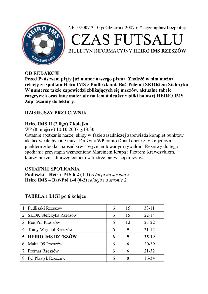 NR 5/2007 * 10 październik 2007 r. * egzemplarz bezpłatny CZAS FUTSALU BIULETYN INFORMACYJNY HEIRO IMS RZESZÓW OD REDAKCJI Przed Państwem piąty już numer naszego pisma. Znaleźć w nim można relację ze spotkań Heiro IMS z Pudliszkami, Bać-Polem i SKOKiem Stefczyka W numerze także zapowiedzi zbliżających się meczów, aktualne tabele rozgrywek oraz inne materiały na temat drużyny piłki halowej HEIRO IMS. Zapraszamy do lektury. DZISIEJSZY PRZECIWNIK Heiro IMS II (2 liga) 7 kolejka WP (8 miejsce) 10.10.2007 g.18:30 Ostatnie spotkanie naszej ekipy w fazie zasadniczej zapowiada komplet punktów, ale tak wcale byc nie musi. Drużyna WP mimo iż na koncie z tylko jednym punktem zdołała „napsuć krwi” wyżej notowanym rywalom. Rezerwy do tego spotkania przystąpią wzmocnione Marcinem Krupą i Piotrem Krawczykiem, którzy nie zostali uwzględnieni w kadrze pierwszej drużyny. OSTATNIE SPOTKANIA Pudliszki – Heiro IMS 6-2 (1-1) relacja na stronie 2 Heiro IMS – Bać-Pol 1-4 (0-2) relacja na stronie 2 TABELA 1 LIGI po 6 kolejce 1 Pudliszki Rzeszów 6 15 33-11 2 SKOK Stefczyka Rzeszów 6 15 22-14 3 Bać-Pol Rzeszów 6 12 25-22 4 Tomy Więcpol Rzeszów 6 9 21-12 5 HEIRO IMS RZESZÓW 6 9 25-19 6 Malta '05 Rzeszów 6 6 20-39 7 Promar Rzeszów 6 6 21-32 8 FC Plastyk Rzeszów 6 0 16-34 Wyniki 5 kolejki: Pudliszki – Heiro IMS 6-2 (1-1) Bać-Pol – SKOK 2-4 (0-0) Malta '05 – Tomy 5-4 (3-2) Plastyk – Promar 5-8 (2-2) Wyniki 6 kolejki: Heiro IMS – Bac-Pol 1-4 (0-2) Promar – Pudliszki 2-5 (1-3) Tomy – Plastyk 7-5 (3-3) SKOK – Malta '05 3-2 (2-1) Pudliszki – Heiro IMS 6-2 (1-1) Spotkanie rozpoczeło się obiecująco dla naszej drużyny. Kilka bardzo groźnych akcji pod bramką rywali nie przyniosło jednak zdobyczy bramkowej. Niestety później po błędzie i faulu w polu karnym Beemsterboera, bramkę z rzutu karnego zdobywają rywale. Tuż przed końcową syreną świetną indywidualną akcję przeprowadził Kubicz i ku olbrzymiej radości naszej drużyny strzelił bramkę wyrównującą. Po przerwie znów brakowało skuteczności mimo bardzo widocznej optycznej przewagi. Pudliszki doprowadzają do wyniku 4-1. W końcówce meczu po bardzo ładnej akcji Rafał Greń strzela bramkę na 2-4 dająca cień nadzieji. Jednak odsłonięta nasza ekipa traci dwa kolejne gole i mecz kończy się wyniki 2-6. Z 6 straconych bramek aż 3 straciliśmy po rzutach karnych. Na otarcie łez pozostaje zwycięstwo ekipy rezerw nad Polchemią 3-1 i ciągłe wspóliderowanie w drugoligowej tabeli. Bramki dla Heiro IMS: Kubicz 1, Greń 1. Heiro IMS – Bać-Pol 1-4 (0-2) Spotkanie z Bać-Polem było bardzo ważnym spotkaniem w kontekście walki o pierwszą „4” w ligowej tabeli. Na nasze nieszczęście rywali zagrali konsekwentnie i bez problemów wykorzystali nasze błędy w obronie. Mecz w wykonaniu naszej drużyny był mizernym widowiskiem co nie wróży dobrze przed spotkaniem ze SKOKiem. Jedyna bramkę po zespołowej akcji strzelił Sjouke Beemsterboer. Bramka dla Heiro IMS: Beemsterboer 1. strona 2 TABELA 2 LIGI po 6 kolejce 1 B&B Orange Rzeszów 6 15 2 Heiro IMS II Rzeszów 6 12 3 Techmet Rzeszów 6 12 4 Polchemia Rzeszów 6 10 5 Sigma-Apollo Rzeszów 6 9 6 Orlen PetroTank 6 6 7 C8038 Rzeszów 6 6 8 WP Rzeszów 6 1 Wyniki 6 kolejki: Heiro IMS II – Sigma-Apollo 5-7 Polchemia – Orlen 7-0 B&B Orange – Techmet 5-2 C8038 – WP 7-3 SPARINGOWO Ekipa Heiro IMS w najbliższym czasie planuje spotkanie z II ligową Elektrociepłownią Rzeszów, która jako beniaminek spisuje się w rozgrywkach ogólnopolskich rewelacyjnie (2 mecze, 4 punkty). O szczegółach poinformujemy na stronie internetowej klubu. SPONSORZY Dziękujemy za wsparcie firmom: ERPATECH, IMS, HEIRO oraz WISPOL bez których ciężko byłoby zapoczątkować działalność naszego klubu. ROZPOCZNIJ WSPOŁPRACĘ Heiro IMS to dynamicznie rozwijająca się drużyna piłki nożnej halowej. Posiadamy m.in. własny profesjonalny serwis internetowy oraz biuletyn klubowy. Minimalne nakłady finansowe pozwolą na ciekawą, skuteczną reklamę Państwa firmy, a naszemu klubowi pomoże to w funkcjonowaniu. Zapraszamy do współpracy wszystkie zainteresowane firmy. strona 3 CO POWINNEŚ WIEDZIEĆ Chciałbym zagrać w Heiro IMS co muszę zrobić ? Przede wszystkim należy ze strony klubowej pobrać deklarację, wypełnic ją, podpisac i przesłac na adres klubu. Dodatkowo należy wpłacić składkę rejestracyjną w wysokości 20 złotych. Od tego momentu mozna uczestniczyć w działalności klubu. Chciałbym pomóc organizacyjnie klubowi co należy zrobić ? Jako „raczkujący” klub poszukujemy osób, które zaangażują się w działalność naszego stowarzyszenia. Wystarczy jedynie skontaktować się z prezesem klubu p. Łukaszem Krawczykiem (dane kontaktowe poniżej). Na jakiej zasadzie działa klub i czym się zajmuje ? Heiro IMS oparte jest na strukturach stowarzyszenia Heiro Futsal. Jestesmy organizacją niedochodową co oznacza, że wszystkie fundusze przeznaczamy na naszą działalność statutową czyli w praktyce na: sprzęt sportowy, wynajem hali, mecze, w przyszłości turnieje dla młodzieży i inne. Podstawowe informacje o klubie: HEIRO IMS RZESZÓW Siedziba: ul. Lewakowskiego 5A/6, 35-125 Rzeszów tel. 600-418-812, mail: [email protected] www.futsal.heiro.pl Oficjalny rok powstania: 2007 Barwy: granatowo-biało-czerwone Prezes: Łukasz Krawczyk Kierownik: Wojciech Spirała strona 4