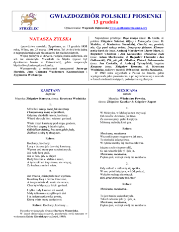 GWIAZDOZBIÓR POLSKIEJ PIOSENKI 13 grudnia Opracowanie: Wojciech Dąbrowski www.spotkaniazpiosenka.org STRZELEC NATASZA ZYLSKA (prawdziwe nazwisko Zygelman, ur. 13 grudnia 1933 roku, Wilno, zm. 29 marca 1995 roku, Tel Aviw) była jedną z najpopularniejszych piosenkarek lat pięćdziesiątych. Wojnę przeżyła w ukryciu. Podjęła studia aktorskie, ale ich nie ukończyła. Mieszkała na Śląsku (ojciec był dyrektorem banku w Katowicach), gdzie rozpoczęła błyskotliwą karierę piosenkarską. Występowała z orkiestrami tanecznymi Jerze-go Haralda, Jana Cajmera Waldemara Kazaneckiego i Zygmunta Wicharego. Największe przeboje: Bajo bongo (muz. H. Gietz, sł. polskie Zbigniew Sztaba), Klipsy i Kukurydza (muz. H. Skalska, sł. Kazimierz Szemioth), Chociaż raz powiedz nie, Czy pani tańczy twista, Deszczowy fokstrot, Klementynka bawi się (muz. Andrzej Markiewicz i Jerzy Mart, sł. Bogusław Choiński i Jan Gałkowski), Marianna ruda (muz. Adam Markiewicz, sł. Bogusław Choiński i Jan Gałkowski), Pik, pik, pik, Pikulina, Piotruś, Soho-mambo (muz. Jan Czekalla, sł. Andrzej Tylczyński), beguine Kasztany (muz. Zbigniew Korepta, sł. Krystyna Wodnicka, radiowy przebój 1956 roku) i rumba Mexicana. W 1963 roku wyjechała z Polski do Izraela, gdzie występowała jako piosenkarka, a po wycofaniu się z zawodu w latach siedemdziesiątych, poświęciła się plastyce. KASZTANY MEXICANA beguine rumba Muzyka: Zbigniew Korepta, słowa: Krystyna Wodnicka Muzyka: Władysław Pawelec, słowa: Zbigniew Kaszkur & Zbigniew Zapert 1. Mówiłeś: włosy masz jak kasztany I kasztanowy masz oczu blask, Gdyśmy chodzili razem, kochany, Wśród złotych liści, wiatru i gwiazd. Wiatr trząsł kasztany pod stopy gradem, Mówiłeś: żegnaj i drżał ci głos, Odjeżdżam dzisiaj, lecz tam gdzie jadę, Zabiorę z sobą tę złotą noc. Refren: Kochany, kochany, Lecą z drzewa jak dawniej kasztany, Wprost pod stopy par roześmianych, Jak rudy lecą grad. Jak w noc, gdy w alejce Rudy kasztan ci dałam i serce, A tyś rzekł mi trzy słowa, nic więcej, Że kochasz mnie i wiatr. 2. Już trzecia jesień park nasz wyzłaca, Kasztany lecą z drzew trzeci raz, A twoja miłość do mnie nie wraca, Choć tyle błyszczy liści i gwiazd. I tylko rudy kasztan mi został, Mały talizman szczęśliwych dni I ta jesienna piosenka prosta, Którą wiatr może zaniesie ci. Refren: Kochany, kochany ... Piosenkę wykonywała również Barbara Muszyńska. W latach dziewięćdziesiątych, przeżywała swój renesans w wykonaniu Edyty Górniak (płyta Dotyk, 1995). 1. W Meksyku, w Meksyku ten zwyczaj Od czasów Azteków już trwa, Że zawsze przy pełni księżyca Miłosną melodię ktoś gra. Refren: Mexicana, mexicana Wszystkie pary rozgrzewa jak rum, To melodia księżycowa, W rytmie rumby tej można całować. Można czule się przytulić, O, tak właśnie jak ty i jak ja, Mexicana, mexicana, Piękna jest, wdzięk swój ma rumba ta. 2. Gdy miłość z miłością się spotka, W noc pełni księżyca, wśród gwiazd, Wokoło rozlega się okrzyk: Hej, grać mexicanę już czas! Refren: Mexicana, mexicana... To jest taniec zakochanych, Takich właśnie jak ty i jak ja, Mexicana, mexicana, Piękna jest, wdzięk swój ma rumba ta.