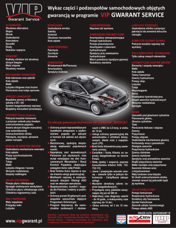 Wykaz części i podzespołów samochodowych objętych gwarancją w programie VIP GWARANT SERVICE ALTERNATOR Obudowa alternatora Stojan Wirnik Uszkodzenia Komutatora Szczotki Diody Reduktor napięcia OBUDOWY Kadłuby silników lub obudowy skrzyni biegów Miski olejowe Obudowy mostów MECHANIZMY RÓZNICOWE Koła talerzowe oraz zębniki Koła zębate Wałki Łożyska ślizgowe oraz toczne Pierścienie oraz tuleje oporowe ROZRUSZNIK Uszkodzenie wirnika Satelity Automat Obudowa rozrusznika Koła zębate PASKI ROZRZĄDU Pęknięcie Zsunięcie Zerwanie ZAWIESZENIE W kolumnach McPhersona: Amortyzatory Sprężyny śrubowe TURBOSPRĘŻARKI Naprawa lub wymiana ZAWIESZENIE PNEUMATYCZNE Amortyzatory samopoziomujące Pompa hydrauliczna Pompa pneumatyczna Amortyzator z zaworami hydraulicznymi Sprężyny przy zawieszeniu hydraulicznym Miech powietrzny (sprężyna gazowa) Reduktory ciśnienia VIPACOC LIKWIDATOR Bezpłatna pomoc w likwidacji szkody z OC i AC System bezgotówkowej naprawy Bezpłatny konsultant prowadzący VIPASSIST Pomoc drogowa Pokrycie kosztów holowania z przyczyn usterek przy trwałym unieruchomieniu pojazdu: Awaria skrzyni biegów manualnej oraz automatycznej; Unieruchomienie silnika Pęknięcie, zsunięcie, zerwanie paska rozrządu Co oferuje gwarancja techniczna VIP GWARANT SERVICE? nOchronę przed nieprzewidzianymi czych o DMC do 3,5 tony, w wieku do 15 lat; n Usługi ochrony gwarancyjnej dla samochodów z silnikiem benzynowym, diesla oraz z napędzanych LPG; n Brak limitu kilometrów przy zawieraniu umowy; nCertyfikat i Kartę Klienta na naprawy bezgotówkowe na terenie Polski; nStałą opiekę i wsparcie poprzez konsultantów Infolinii SOS: 732732-112; nJasne i przejrzyste warunki umowy – zawarte tylko w jednym dokumencie - Certyfikacie zakupu usługi; nWyraźnie określony zakres napraw bezgotówkowych; n Przystępne ceny pakietów zaczynające się już od 500 zł; n Najkrótszy czas diagnozy usterki - do 24 godz., a maksymalny czas naprawy do 14 dni; n Okres ochrony od 3 do 12 miesięcy. WAŁY NAPĘDOWE Wały napędowe Przeguby wału Łożyska wydatkami związanym z użytkowaniem pojazdu po zakupie w komisie lub salonie aut używanych; nBezstresową, spokojną eksploatację większości popularnych marek; nNajwiększą sieć sprawdzonych Partnerów aut używanych, oraz wciąż rozwijająca się sieć Autoryzowanych Warsztatów i Stacji Kontroli Pojazdów, obejmująca zasięgiem teren całej Polski; nBrak limitów ilości napraw w czasie trwania usługi gwarancyjnej; nMożliwość naprawy w autoryzowanych stacjach Obsługi ASO oraz we własnym warsztacie; n Bezpieczeństwo, komfort i wygodę dla Państwa i rodziny w podróżach; n Ochronę ponad 20 głównych podzespołów samochodu objętych Programem Ochronnym; nProgram Naprawczy dla samochodów osobowych i dostaw- www.vipgwarant.pl Szerokiej i bezpiecznej drogi bez przykrych niespodzianek oraz Wesołych Świąt i Szczęśliwego Nowego Roku życzy Państwu VIP Gwarant Service – Program Gwarancyjny Aut Używanych, tylko w najlepszych Komisach i Salonach aut używanych. MANUALNE SKRZYNIE BIEGÓW Uszkodzenia mechaniczne wewnątrz Koła zębate Piasty synchronizatorów Wybieraki Tuleje Wałki Łożyska ślizgowe i toczne Skrzynie rozdzielaczy Zespoły nadbiegów UKŁAD CHŁODZENIA Pompa płynu chłodzącego Sprzęgło wiskotyczne wentylatora Chłodnica płynu chłodzącego silnik Chłodnica nagrzewnicy auta ŁAŃCUCHY ROZRZĄDU Uszkodzenie silnika z przyczyn pęknięcia lub zerwania łańcucha rozrządu KOMPUTER GŁÓWNY SILNIKA Pokrycie kosztów naprawy lub wymiany KOŁA ZAMACHOWE DWUMASOWE Tylko zakup nowych elementów AUTOMATYCZNE SKRZYNIE BIEGÓW Elementy i zespoły wewnątrz: Wałki Koła zębate Taśmy hamulców Zawory hydrauliczne Pompy oleju Łożyska Tuleje Wspomaganie Servo Przekładnia hydrokinetyczna Zespół zaworów hydraulicznych Skrzynie rozdzielacza Sprzęgła SILNIK Uszczelki pod głowicami cylindrów Planowanie głowic, Głowice cylindrów Tłoki Pierścienie tłokowe i olejowe Zawory Popychacze Pompy olejowe Uszkodzenia mechaniczne głowicy Korbowody wraz z panewkami Dźwignie zaworów Popychacze hydrauliczne Zawory dolotowe Zawory wylotowe Sprężyny oraz prowadnice zaworów Drążki popychaczy zaworów Wałki rozrządu oraz popychacze Sworznie tłokowe wraz z łożyskowaniem Wały korbowe oraz łożyska W chwili unieruchomienia silnika również remont tej jednostki bądź jej wymianę UKŁAD HAMULCOWY Pompa hamulcowa Rozpieracze hydrauliczne Korektory siły hamowania Zaciski hamulcowe Zbiornik układu hamulcowego Pompa układu ABS WASZE AUTA NAPRAWIAMY W