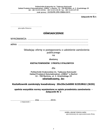 Politechnika Krakowska im. Tadeusza Kościuszki Zakład Produkcji Doświadczalnej „CEBEA” w Bochni 32 – 700 BOCHNIA, ul. Z. Krasińskiego 29 tel. +48-14-612-24-64; +48-14-612-30-45 fax. +48-14-612-27-39 znak sprawy : 03/ZO/PK.ZPD-CEBEA/2015 Załącznik Nr 5/1 …………………………………………….. pieczątka firmowa OŚWIADCZENIE WYKONAWCA: …………………………………………………………………………….. …………………………………………………………………………………………………… adres …………………………………………………………………………………………. Składając ofertę w postępowaniu o udzielenie zamówienia publicznego na dostawę KSZTAŁTOWNIKÓW I PROFILI STALOWYCH dla Politechniki Krakowskiej im. Tadeusza Kościuszki Zakład Produkcji Doświadczalnej „CEBEA” w Bochni 32 – 700 Bochnia, ul. Z. Krasińskiego 29 oświadczamy, że: Kształtownik zamknięty kwadratowy 20x20x2x6000 S235JRG2 (St3S) spełnia wszystkie normy wymienione w opisie przedmiotu zamówienia Załącznik Nr 2 ……………………………………… dnia …………………2015r. ( miejscowość ) .............................................................. podpis, pieczęć imienna osoby upoważnionej do reprezentowania firmy 1 Politechnika Krakowska im. Tadeusza Kościuszki Zakład Produkcji Doświadczalnej „CEBEA” w Bochni 32 – 700 BOCHNIA, ul. Z. Krasińskiego 29 tel. +48-14-612-24-64; +48-14-612-30-45 fax. +48-14-612-27-39 znak sprawy : 03/ZO/PK.ZPD-CEBEA/2015 Załącznik Nr 5/2 …………………………………………….. pieczątka firmowa OŚWIADCZENIE WYKONAWCA: …………………………………………………………………………….. …………………………………………………………………………………………………… adres …………………………………………………………………………………………. Składając ofertę w postępowaniu o udzielenie zamówienia publicznego w) na dostawę KSZTAŁTOWNIKÓW I PROFILI STALOWYCH dla Politechniki Krakowskiej im. Tadeusza Kościuszki Zakład Produkcji Doświadczalnej „CEBEA” w Bochni 32 – 700 Bochnia, ul. Z. Krasińskiego 29 oświadczamy, że: Kształtownik zamknięty kwadratowy 30x30x2x6000 S235JRG2 (St3S) spełnia wszystkie normy wymienione w opisie przedmiotu zamówienia Załącznik Nr 2 ……………………………………… dnia …………………2015r. ( miejscowość ) .............................................................. podpis, pieczęć imienna osoby upoważnionej do reprezentowania firmy 2 Politechnika Krakowska im. Tadeusza Kościuszki Zakład Produkcji Doświadczalnej „CEBEA” w Bochni 32 – 700 BOCHNIA, ul. Z. Krasińskiego 29 tel. +48-14-612-24-64; +48-14-612-30-45 fax. +48-14-612-27-39 znak sprawy : 03/ZO/PK.ZPD-CEBEA/2015 Załącznik Nr 5/3 …………………………………………….. pieczątka firmowa OŚWIADCZENIE WYKONAWCA: …………………………………………………………………………….. …………………………………………………………………………………………………… adres …………………………………………………………………………………………. Składając ofertę w postępowaniu o udzielenie zamówienia publicznego na dostawę KSZTAŁTOWNIKÓW I PROFILI STALOWYCH dla Politechniki Krakowskiej im. Tadeusza Kościuszki Zakład Produkcji Doświadczalnej „CEBEA” w Bochni 32 – 700 Bochnia, ul. Z. Krasińskiego 29 oświadczamy, że: Kształtownik zamknięty prostokątny 40x20x2x6000 S235JRG2 (St3S) spełnia wszystkie normy wymienione w opisie przedmiotu zamówienia Załącznik Nr 2 ……………………………………… dnia …………………2015r. ( miejscowość ) .............................................................. podpis, pieczęć imienna osoby upoważnionej do reprezentowania firmy 3 Politechnika Krakowska im. Tadeusza Kościuszki Zakład Produkcji Doświadczalnej „CEBEA” w Bochni 32 – 700 BOCHNIA, ul. Z. Krasińskiego 29 tel. +48-14-612-24-64; +48-14-612-30-45 fax. +48-14-612-27-39 znak sprawy : 03/ZO/PK.ZPD-CEBEA/2015 Załącznik Nr 5/4 …………………………………………….. pieczątka firmowa OŚWIADCZENIE WYKONAWCA: …………………………………………………………………………….. …………………………………………………………………………………………………… adres …………………………………………………………………………………………. Składając ofertę w postępowaniu o udzielenie zamówienia publicznego w) na dostawę KSZTAŁTOWNIKÓW I PROFILI STALOWYCH dla Politechniki Krakowskiej im. Tadeusza Kościuszki Zakład Produkcji Doświadczalnej „CEBEA” w Bochni 32 – 700 Bochnia, ul. Z. Krasińskiego 29 oświadczamy, że: Kształtownik zamknięty kwadratowy 40x40x2x6000 S235JRG2 (St3S) spełnia wszystkie normy wymienione w opisie przedmiotu zamówienia Załącznik Nr 2 ……………………………………… dnia …………………2015r. ( miejscowość ) .............................................................. podpis, pieczęć imienna osoby upoważnionej do reprezentowania firmy 4 Politechnika Krakowska im. Tadeusza Kościuszki Zakład Produkcji Doświadczalnej „CEBEA” w Bochni 32 – 700 BOCHNIA, ul. Z. Krasińskiego 29 tel. +48-14-612-24-64; +48-14-612-30-45 fax. +48-14-612-27-39 znak sprawy : 03/ZO/PK.ZPD-CEBEA/2015 Załącznik Nr 5/5 …………………………………………….. pieczątka firmowa OŚWIADCZENIE WYKONAWCA: …………………………………………………………………………….. ……………………………………………………………………………………………………