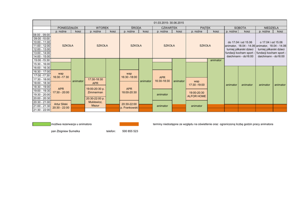 01.03.2015- 30.06.2015 PONIEDZIAŁEK p. nożna kosz WTOREK p. nożna kosz 08:00 - 09:00 09:00 -10:00 10:00 - 11:00 SZKOŁA SZKOŁA 11:00 - 12:00 12:00 - 13:00 13:00 - 14:00 14:00 - 15:00 15:00 -15:30 15:30 - 16:00 16:00 - 16:30 16:30 - 17:00 wap 17:00 -17:30 16:30 -17 30 17:30 - 18:00 17:30-18:30 animator 18:00 - 18:30 APR 18:30 - 19:00 APR 19:00-20:30 p. 19:00 - 19:30 17:30 - 20:00 Zimmerman 19:30 - 20:00 20:00 - 20:30 20:30-22:00 p. Muklewicz, 20:30 - 21:00 Artur Silski Mazur 21:00 - 21:30 20:30 - 22:00 21:30 - 22:00 ŚRODA p. nożna kosz CZWARTEK p. nożna kosz PIĄTEK p. nożna kosz SZKOŁA SZKOŁA SZKOŁA NIEDZIELA p. nożna kosz do 17.04 i od 15.06 o 17.04 i od 15.06 animator, 18.04 - 14.06 animator, 18.04 - 14.06 turniej piłkarski dzieci turniej piłkarski dzieci fundacji kocham sport - fundacji kocham sport daichmann - do16:00 daichmann - do16:00 animator wap 16:30 -18:00 animator APR 18:00-20:30 20:30-22:00 p. Frankowski możliwa rezerwacja u animatora pan Zbigniew Sumelka SOBOTA p. nożna kosz APR 16:30-18:30 animator wap 17:30 -19:00 animator 19:00-20:30 ALFOR HOME animator animator animator animator animator terminy niedostępne ze względu na oświetlenie oraz ograniczoną liczbę godzin pracy animatora telefon: 500 855 523 animator