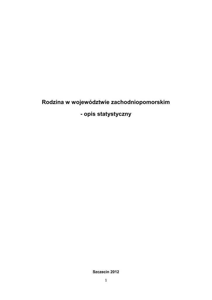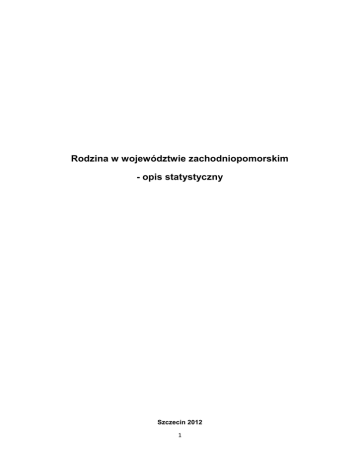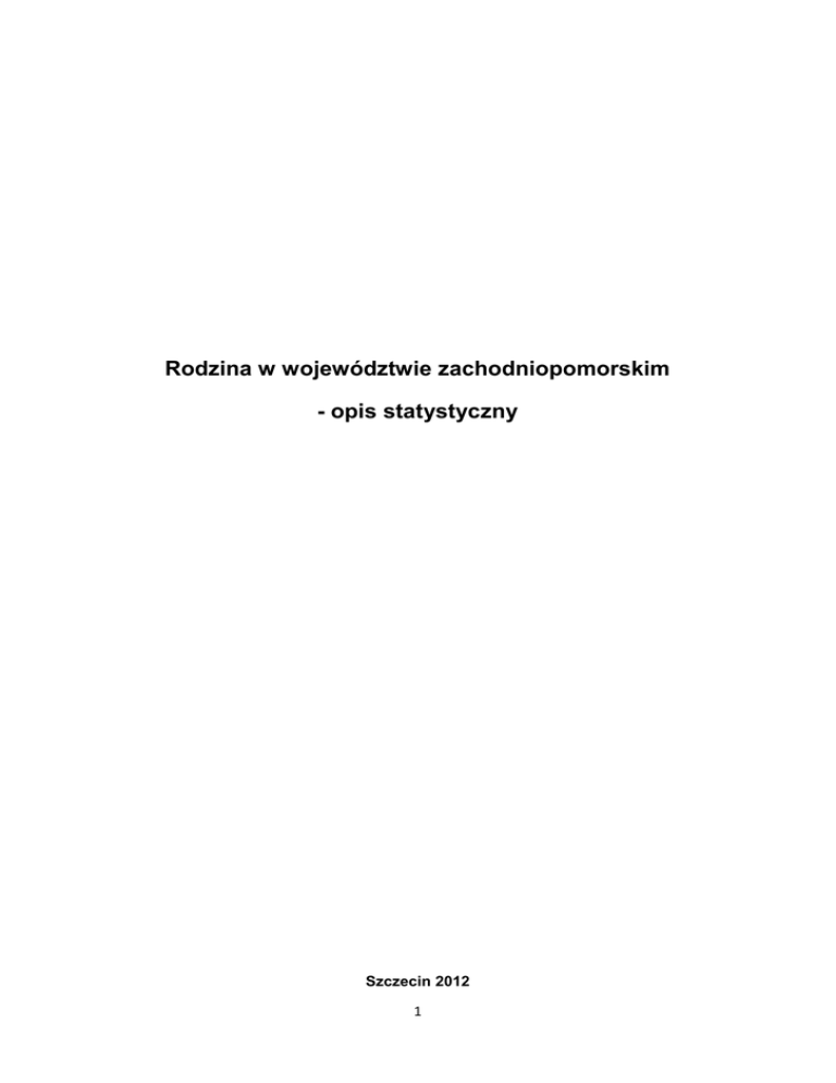 Rodzina w województwie zachodniopomorskim - opis statystyczny Szczecin 2012 1 Spis treści 1. Wprowadzenie .....................................................................................................................3 2. Ustalenia terminologiczne ....................................................................................................4 3. Rodzina i funkcje rodziny .....................................................................................................8 CZĘŚĆ I. STATYSTYKI PUBLICZNE DOTYCZĄCE RODZIN, MAŁŻEŃSTW , ROZWODÓW I URODZEŃ POZAMAŁŻEŃSKICH WEDŁUG GŁÓWNEGO URZĘDU STATYSTYCZNEGO (GUS) 1. Liczba rodzin w województwie zachodniopomorskim według NSP 2002 ............................11 2. Małżeństwa i rozwody .........................................................................................................13 2.1 Przyczyny rozwodów ..............................................................................................15 2.2 Rozwody wg liczby małoletnich dzieci ....................................................................17 2.3 Rozwody wg czasu trwania małżeństwa ................................................................17 2.4 Małżeństwa cywilne i wyznaniowe .........................................................................19 3. Urodzenia pozamałżeńskie ..................................................................................................22 CZĘŚĆ II. RODZINA W SYSTEMIE POMOCY SPOŁECZNEJ 1. Świadczeniobiorcy pomocy społecznej w ogólnej liczbie ludności .......................................25 2. Liczba rodzin pełnych i niepełnych w latach 2009-2011 .......................................................31 3. Liczba rodzin wielodzietnych w latach 2009-2011 ..............................................................34 4. Dochód w rodzinie w przeliczeniu na osobę .......................................................................34 5. Rodzina w systemie pieczy zastępczej ................................................................................36 5.1 Liczba adopcji w województwie zachodniopomorskim w latach 2006-2010 ...........37 5.2 Liczba dzieci w pieczy zastępczej .........................................................................37 5.3 Liczba rodzin zastępczych ....................................................................................38 5.4 Liczba dzieci niepełnosprawnych w pieczy zastępczej ...........................................39 6. Podsumowanie .....................................................................................................................40 2 1. Wprowadzenie Rodzina należy do jednej z najbardziej powszechnych i uniwersalnych instytucji społecznych funkcjonujących w społeczeństwie ludzkim. Jest przedmiotem refleksji prowadzonej w ramach nauk społecznych, które starają się opisać i uporządkować zagadnienia związane z rodziną według różnych kryteriów. Już krótki przegląd literatury na jej temat pokazuje, że życie społeczne zna różne modele życia rodzinnego, i że sama rodzina definiowana i opisywana jest w różny sposób. Celem niniejszego raportu nie jest jednak wszechstronny, akademicki opis rodziny jako takiej. Jego zawartość wynika raczej z potrzeb praktycznych. Regionalny Ośrodek Polityki Społecznej (ROPS), będący jednostką samorządu województwa, realizuje zadania nakładane na niego na mocy różnych ustaw, rozporządzeń i innych aktów prawnych1, jednak bezpośrednim impulsem do sporządzenia raportu jest ustawa z dnia 9 czerwca 2011 r. o wspieraniu rodziny i systemie pieczy zastępczej, nakładająca na ROPS rozmaite zadania, takie jak: 1 Należy wspomnieć w tym kontekście także o Strategii Rozwoju Województwa Zachodniopomorskiego, której zapisy zawarte w celu „6.1 Wspieranie funkcji rodziny”, zakładają prowadzenie takich działań jak: a) wsparcie rodzin znajdujących się w trudnej sytuacji materialnej, dotkniętych marginalizacją, rodzin wielodzietnych, zastępczych, niepełnych i zagrożonych b) wspieranie i promowanie rozwiązań sprzyjających realizowaniu funkcji rodziny w połączeniu z wykonywaniem pracy zawodowej c) edukacja i promocja kształtująca postawy rodzinne i rodzicielskie oraz pozytywny wizerunek rodziny d) wdrażanie programów wsparcia dla kobiet w ciąży i rodzin z małymi dziećmi e) integracja działań dotyczących funkcjonowania rodziny (pomocy społecznej, ochrony zdrowia, edukacji, kultury) przy współudziale partnerów społecznych 3 - opracowywanie programów dotyczących wspierania rodziny i systemu pieczy zastępczej, będących integralną częścią strategii rozwoju województwa; - promowanie nowych rozwiązań w zakresie wspierania rodziny i systemu pieczy zastępczej; - sporządzanie sprawozdań rzeczowo-finansowych z zakresu wspierania rodziny i systemu pieczy zastępczej oraz przekazywanie ich właściwemu wojewodzie (…)2 Prowadzenie systematycznych działań w jakimkolwiek obszarze życia społecznego wymaga wcześniejszego zdiagnozowania tego obszaru. Zakres diagnozy w przypadku niniejszego raportu wyznaczony został trzema czynnikami. Pierwszy z nich to zadania nakładane na ROPS przez różne przepisy prawa, drugi - dostępność przydatnych danych zastanych, trzeci - realne możliwości przeprowadzenia własnych badań w interesującym autorów zakresie, w przypadku wystąpienia braku danych w innych źródłach. Ostatecznie, raport oparty został na danych pochodzących z czterech źródeł. Są nimi: - Główny Urząd Statystyczny (GUS) - Ministerstwo Pracy i Polityki Społecznej (dane z MPiPS-03 i MPiPS-05) - System Informatyczny POMOST (SI POMOST)3 - badanie dotyczące ośrodków adopcyjnych w województwie zachodnipomorskim. przeprowadzone przez Obserwatorium Integracji Społecznej w Szczecinie. 2. Ustalenia terminologiczne Posługiwanie się danymi zastanymi ma to do siebie, iż posługujący si
