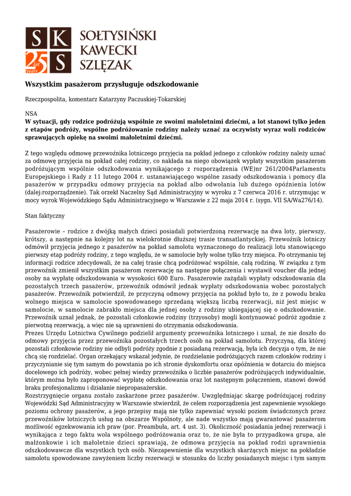 Wszystkim pasażerom przysługuje odszkodowanie Rzeczpospolita, komentarz Katarzyny Paczuskiej-Tokarskiej NSA W sytuacji, gdy rodzice podróżują wspólnie ze swoimi małoletnimi dziećmi, a lot stanowi tylko jeden z etapów podróży, wspólne podróżowanie rodziny należy uznać za oczywisty wyraz woli rodziców sprawujących opiekę na swoimi małoletnimi dziećmi. Z tego względu odmowę przewoźnika lotniczego przyjęcia na pokład jednego z członków rodziny należy uznać za odmowę przyjęcia na pokład całej rodziny, co nakłada na niego obowiązek wypłaty wszystkim pasażerom podróżującym wspólnie odszkodowania wynikającego z rozporządzenia (WE)nr 261/2004Parlamentu Europejskiego i Rady z 11 lutego 2004 r. ustanawiającego wspólne zasady odszkodowania i pomocy dla pasażerów w przypadku odmowy przyjęcia na pokład albo odwołania lub dużego opóźnienia lotów (dalej:rozporządzenie). Tak orzekł Naczelny Sąd Administracyjny w wyroku z 7 czerwca 2016 r. utrzymując w mocy wyrok Wojewódzkiego Sądu Administracyjnego w Warszawie z 22 maja 2014 r. (sygn. VII SA/Wa276/14). Stan faktyczny Pasażerowie – rodzice z dwójką małych dzieci posiadali potwierdzoną rezerwację na dwa loty, pierwszy, krótszy, a następnie na kolejny lot na wielokrotnie dłuższej trasie transatlantyckiej. Przewoźnik lotniczy odmówił przyjęcia jednego z pasażerów na pokład samolotu wyznaczonego do realizacji lotu stanowiącego pierwszy etap podróży rodziny, z tego względu, że w samolocie były wolne tylko trzy miejsca. Po otrzymaniu tej informacji rodzice zdecydowali, że na całej trasie chcą podróżować wspólnie, całą rodziną. W związku z tym przewoźnik zmienił wszystkim pasażerom rezerwację na następne połączenia i wystawił voucher dla jednej osoby na wypłatę odszkodowania w wysokości 600 Euro. Pasażerowie zażądali wypłaty odszkodowania dla pozostałych trzech pasażerów, przewoźnik odmówił jednak wypłaty odszkodowania wobec pozostałych pasażerów. Przewoźnik potwierdził, że przyczyną odmowy przyjęcia na pokład było to, że z powodu braku wolnego miejsca w samolocie spowodowanego sprzedaną większą liczbą rezerwacji, niż jest miejsc w samolocie, w samolocie zabrakło miejsca dla jednej osoby z rodziny ubiegającej się o odszkodowanie. Przewoźnik uznał jednak, że pozostali członkowie rodziny (trzyosoby) mogli kontynuować podróż zgodnie z pierwotną rezerwacją, a więc nie są uprawnieni do otrzymania odszkodowania. Prezes Urzędu Lotnictwa Cywilnego podzielił argumenty przewoźnika lotniczego i uznał, że nie doszło do odmowy przyjęcia przez przewoźnika pozostałych trzech osób na pokład samolotu. Przyczyną, dla której pozostali członkowie rodziny nie odbyli podróży zgodnie z posiadaną rezerwacją, była ich decyzja o tym, że nie chcą się rozdzielać. Organ orzekający wskazał jedynie, że rozdzielanie podróżujących razem członków rodziny i przyczynianie się tym samym do powstania po ich stronie dyskomfortu oraz opóźnienia w dotarciu do miejsca docelowego ich podróży, wobec pełnej wiedzy przewoźnika o liczbie pasażerów podróżujących indywidualnie, którym można było zaproponować wypłatę odszkodowania oraz lot następnym połączeniem, stanowi dowód braku profesjonalizmu i działanie niepropasażerskie. Rozstrzygnięcie organu zostało zaskarżone przez pasażerów. Uwzględniając skargę podróżującej rodziny Wojewódzki Sąd Administracyjny w Warszawie stwierdził, że celem rozporządzenia jest zapewnienie wysokiego poziomu ochrony pasażerów, a jego przepisy mają nie tylko zapewniać wysoki poziom świadczonych przez przewoźników lotniczych usług na obszarze Wspólnoty, ale nade wszystko mają gwarantować pasażerom możliwość egzekwowania ich praw (por. Preambuła, art. 4 ust. 3). Okoliczność posiadania jednej rezerwacji i wynikająca z tego faktu wola wspólnego podróżowania oraz to, że nie była to przypadkowa grupa, ale małżonkowie i ich małoletnie dzieci sprawiają, że odmowa przyjęcia na pokład rodzi uprawnienia odszkodowawcze dla wszystkich tych osób. Niezapewnienie dla wszystkich skarżących miejsc na pokładzie samolotu spowodowane zawyżeniem liczby rezerwacji w stosunku do liczby posiadanych miejsc i tym samym brak możliwości odbycia podróży przez wszystkich skarżących zgodnie z rezerwacją i wynikającą tym samym wolą tych podróżnych, stanowi odmowę przyjęcia pasażerów na pokład wbrew ich woli, o jakiej mowa w rozporządzeniu (por.art. 2 lit. j i art. 4 ust. 3). WSA wytknął również, że przewoźnik naruszył również prawo gdy zaniechał wezwania ochotników do rezygnacji z rezerwacji i obejmując stosowną procedurą jedynie skarżących. W skardze kasacyjnej do NSA przewoźnik argumentował, że to pasażerowie samodzielnie podjęli decyzję o zmianie rezerwacji na kolejny rejs w przypadku pozostałych członków rodziny, by móc dalej podróżować całą grupą, podczas gdy mogli zdecydować, że rejsem poleci dwóch małoletnich członków rodziny pod opieką jednego z rodziców. Nie doszło zatem, zdaniem przewoźnika, do odmowy przyjęcia ich na pokład w rozumieniu przepisów rozporządzenia. Rozstrzygnięcie NSA nie podzielił jednak tych argumentów podkreślając, że jeżeli obsługujący przewoźnik lotniczy ma uzasadnione powody by przewidywać odmowę przyjęcia na pokład, powinien on najpierw wezwać ochotników do rezygnacji z ich rezerwacji w zamian za korzyści, na warunkach uzgodnionych pomiędzy danym pasażerem a przewoźnikiem lotniczym. W rozpatrywanej sprawie przewoźnik lotniczy nie zastosował powyższej procedury, lecz wprost zwrócił się do podróżującej rodziny o wskazanie jednego z członków tej rodziny, który zrezygnuje z podróży i już to zachowanie przewoźnika stanowiło naruszenie rozporządzenia (art.4 ust. 1 i 2). Ponadto NSA podkreślił, że w przypadku odmowy przyjęcia pasażer