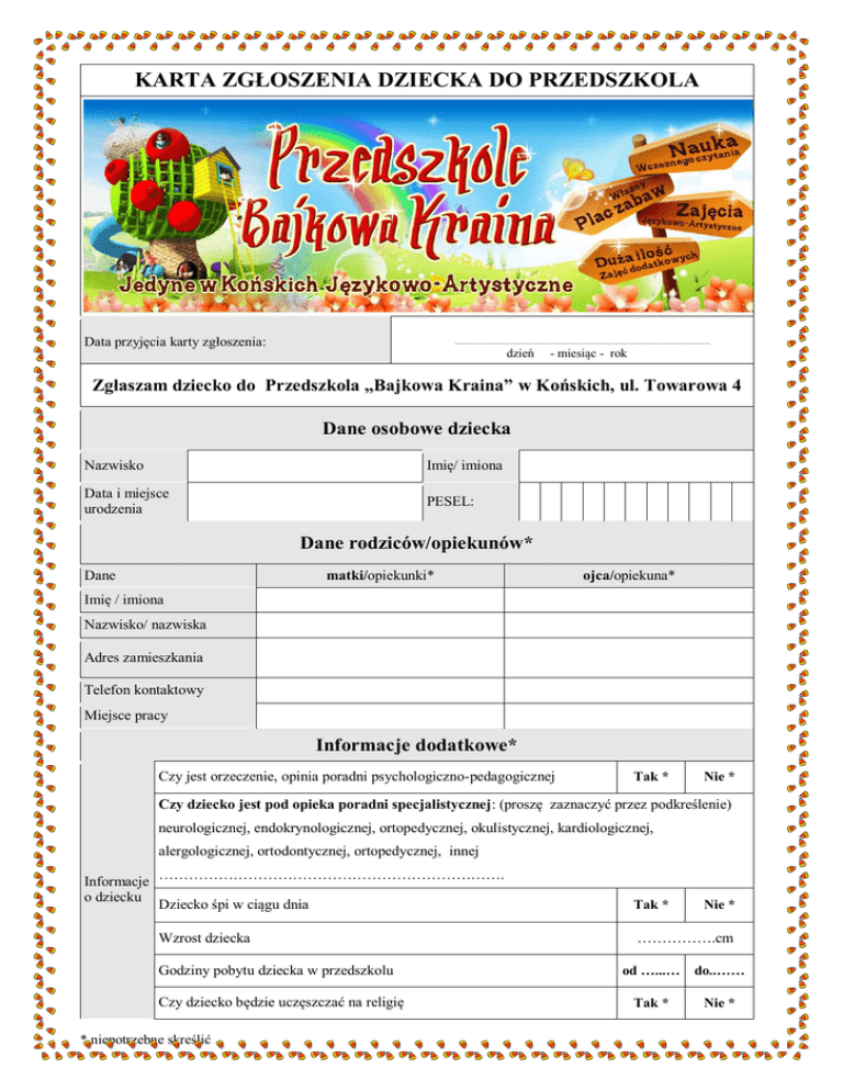 KARTA ZGŁOSZENIA DZIECKA DO PRZEDSZKOLA