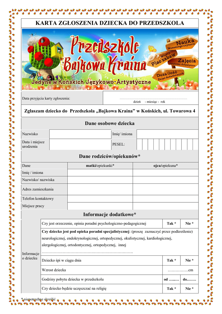 KARTA ZGŁOSZENIA DZIECKA DO PRZEDSZKOLA Data przyjęcia karty zgłoszenia: ......................................................................................................................... dzień - miesiąc - rok Zgłaszam dziecko do Przedszkola „Bajkowa Kraina” w Końskich, ul. Towarowa 4 Dane osobowe dziecka Nazwisko Imię/ imiona Data i miejsce urodzenia PESEL: Dane rodziców/opiekunów* Dane matki/opiekunki* ojca/opiekuna* Imię / imiona Nazwisko/ nazwiska Adres zamieszkania Telefon kontaktowy Miejsce pracy Informacje dodatkowe* Czy jest orzeczenie, opinia poradni psychologiczno-pedagogicznej Tak * Nie * Czy dziecko jest pod opieka poradni specjalistycznej: (proszę zaznaczyć przez podkreślenie) neurologicznej, endokrynologicznej, ortopedycznej, okulistycznej, kardiologicznej, alergologicznej, ortodontycznej, ortopedycznej, innej Informacje o dziecku ……………………………………………………………. Dziecko śpi w ciągu dnia Tak * Wzrost dziecka …………….cm Godziny pobytu dziecka w przedszkolu Czy dziecko będzie uczęszczać na religię * niepotrzebne skreślić Nie * od …...… do..…… Tak * Nie * Deklaracje , zobowiązania rodziców Upoważniam do odbioru z przedszkola mojego dziecka, wymienione obok pełnoletnie osoby (poza rodzicami 1 ..................................................................... /opiekunami prawnymi). ..................................................................... Bierzemy na siebie pełną odpowiedzialność prawną za 2 ..................................................................... bezpieczeństwo odebranego dziecka, od momentu jego odbioru przez wskazaną, upoważnioną przez nas osobę. ..................................................................... Wyrażam zgodę na udział mojego dziecka w wycieczkach organizowanych w przedszkolu. Tak * Nie * Wyrażam zgodę na umieszczenie na stronie internetowej przedszkola wizerunku mojego dziecka. Tak * Nie * Zgodnie z przepisami ustawy z dnia 29 sierpnia 1997r. o ochronie danych osobowych ( Dz. U. Nr 133,poz.883) wyrażam zgodę na wykorzystanie moich danych osobowych w zakresie niezbędnym do pracy przedszkola i zachowania bezpieczeństwa mojego dziecka. Tak * Nie * Zobowiązuję się do: Przestrzegania postanowień statutu przedszkola Regularnego uiszczania wymaganych opłat w wyznaczonym terminie Uczestniczenia w zebraniach rodziców Przyprowadzania i odbierania dziecka z przedszkola osobiście lub przez osobę pełnoletnią, zgłoszoną powyżej, zapewniającą dziecku bezpieczeństwo. Zobowiązuje się do niezwłocznego informowania przedszkola na piśmie o zmianach danych osobowych, danych adresowych. Zobowiązuje się również do pisemnego poinformowania przedszkola, z miesięcznym wyprzedzeniem o rezygnacji z miejsca w przedszkolu oraz o wszelkich zmianach dotyczących ilości godzin, na które dziecko uczęszcza. Oświadczam, że informacje przedstawione w niniejszej karcie zgłoszenia są zgodne ze stanem faktycznym. Końskie, dnia ................................. …………………………………… Czytelny podpis rodziców / opiekunów * niepotrzebne skreślić