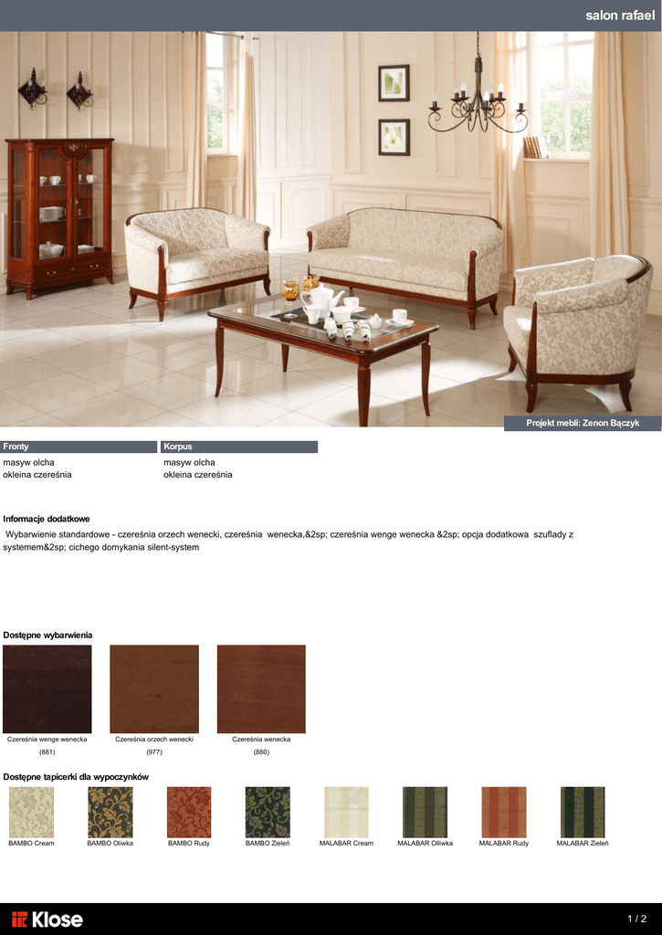 salon rafael Projekt mebli: Zenon Bączyk Fronty Korpus masyw olcha okleina czereśnia masyw olcha okleina czereśnia Informacje dodatkowe Wybarwienie standardowe - czereśnia orzech wenecki, czereśnia wenecka,&2sp; czereśnia wenge wenecka &2sp; opcja dodatkowa szuflady z systemem&2sp; cichego domykania silent-system Dostępne wybarwienia Czereśnia wenge wenecka Czereśnia orzech wenecki Czereśnia wenecka (881) (977) (880) Dostępne tapicerki dla wypoczynków BAMBO Cream BAMBO Oliwka BAMBO Rudy BAMBO Zieleń MALABAR Cream MALABAR Olliwka MALABAR Rudy MALABAR Zieleń 1/2 salon rafael Elementy zestawu witryna witryna witryna witryna narożna kredens wysoki 7420-42 7420-40 7420-41 7420-39 7420-12 kredens wysoki 7420-11 138/213/45 98/213/45 98/213/45 98/213/49 96/149/43 96/149/43 kredens wysoki sekretarzyk barek kredens kredens kredens 7420-10 7420-22 7420-23 7420-05 7420-04 7420-01 135/135/43 66/135/43 66/135/43 175/96/43 135/96/43 96/96/43 kredens kredens komoda TV komoda TV stolik stolik 7420-02 7420-03 7420-21 7420-20 7428-32 7428-31 96/96/43 96/96/43 135/82/57 95/82/57 70x70x50 120x70x50 stolik sofa/2 sofa/3 sofa lustro lustro 7428-30 7420-98 7420-97 7420-99 7420-91 7420-90 100x100x50 136/82/81 186/82/81 84/82/81 135/70/8 96/70/8 Wymiary podawane w kolejności szer./wys./głębokość 2/2