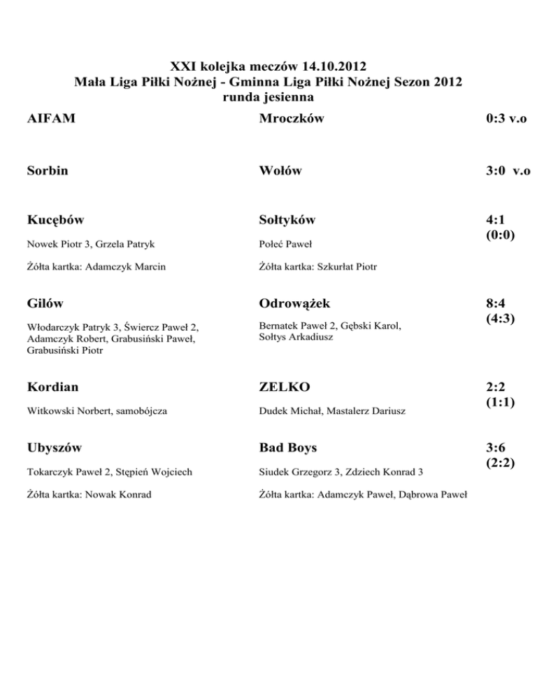 XXI kolejka meczów 14.10.2012 Mała Liga Piłki Nożnej - Gminna Liga Piłki Nożnej Sezon 2012 runda jesienna AIFAM Mroczków 0:3 v.o Sorbin Wołów 3:0 v.o Kucębów Sołtyków Nowek Piotr 3, Grzela Patryk Połeć Paweł 4:1 (0:0) Żółta kartka: Adamczyk Marcin Żółta kartka: Szkurłat Piotr Gilów Odrowążek Włodarczyk Patryk 3, Świercz Paweł 2, Adamczyk Robert, Grabusiński Paweł, Grabusiński Piotr Bernatek Paweł 2, Gębski Karol, Sołtys Arkadiusz Kordian ZELKO Witkowski Norbert, samobójcza Dudek Michał, Mastalerz Dariusz Ubyszów Bad Boys Tokarczyk Paweł 2, Stępień Wojciech Siudek Grzegorz 3, Zdziech Konrad 3 Żółta kartka: Nowak Konrad Żółta kartka: Adamczyk Paweł, Dąbrowa Paweł 8:4 (4:3) 2:2 (1:1) 3:6 (2:2)