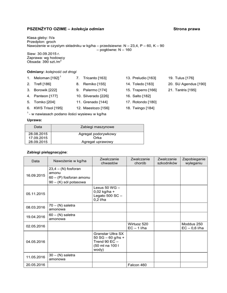 PSZENŻYTO OZIME – kolekcja odmian Strona prawa Klasa gleby: IVa Przedplon: groch Nawożenie w czystym składniku w kg/ha – przedsiewne: N – 23,4, P – 60, K – 90 – pogłówne: N – 160 Siew: 30.09.2015 r. Zaprawa: wg hodowcy 2 Obsada: 390 szt./m Odmiany: kolejność od drogi 1. Meloman [192] 1 7. Tricanto [163] 13. Preludio [163] 19. Tulus [176] 2. Trefl [186] 8. Remiko [155] 14. Toledo [183] 20. SU Agendus [190] 3. Borowik [222] 9. Palermo [174] 15. Traperro [166] 21. Tantris [195] 4. Panteon [177] 10. Silverado [226] 16. Salto [182] 5. Tomko [204] 11. Grenado [144] 17. Rotondo [180] 6. KWS Trisol [195] 12. Maestozo [156] 18. Twingo [184] 1 - w nawiasach podano ilości wysiewu w kg/ha Uprawa: Data Zabiegi maszynowe 28.08.2015 17.09.2015 28.09.2015 Agregat podorywkowy Orka Agregat uprawowy Zabiegi pielęgnacyjne: Data Nawożenie w kg/ha 16.09.2015 23,4 – (N) fosforan amonu 60 – (P) fosforan amonu 90 – (K) sól potasowa Zwalczanie chwastów 08.03.2016 70 – (N) saletra amonowa 19.04.2016 60 – (N) saletra amonowa Wirtuoz 520 EC – 1 l/ha 02.05.2016 Granstar Ultra SX 50 SG – 60 g/hs + Trend 90 EC – (50 ml na 100 l wody) 04.05.2016 20.05.2016 Zwalczanie szkodników Zapobieganie wyleganiu Lexus 50 WG – 0,02 kg/ha + Legato 500 SC – 0,2 l/ha 05.11.2015 11.05.2016 Zwalczanie chorób 30 – (N) saletra amonowa Falcon 460 Moddus 250 EC – 0,6 l/ha EC – 0,6 l/ha Wzorzec dt/ha, 76,5 89,6 Meloman Trefl Borowik Panteon Tomko KWS Trisol Palermo Grenado Maestrozo Trapero Rotondo Twingo Tulus 109 109 14,13 skala 90 14,13 111 107 105 105 14,13 14,13 107 106 105 97 102 104 95 103 89 99 94 99 108 110 105 107 99 98 100 100 6 5,0 5,5 5,5 6,5 3,5 6 5,5 4 6,0 5,5 6,0 4,0 7,4 5,8 7,3 6,2 7,5 6,4 7,9 7,9 5,4 7,3 6,9 7,6 7,0 93128 110 116 128 117 108 116 116 96 120 114 99 93 116 200203 203 202 201 201 202 202 202 202 201 203 202 201 201 Zawartość białka Porastanie w kłosach Gęstość w stanie zsypnym Masa 1000 ziaren g Reakcja na Al+++ skala 90 a2 Dojrzałość woskowa dni od 1.01 a1 Wysokość, cm Lp. Wyleganie Plon % wzorca lata 2012 - 2014 Odmiana 1. 2. 3. 4. 5. 6. 7. 8. 9. 10. 11. 12. 13. Mrozoodporność PSZENŻYTO OZIME – charakterystyka odmian wg „Listy opisowej odmian COBORU 2015” skala 90 5-7 36,851,2 1-8 4-6 3-8 7,5-8,4 5 5 5 5 5 7 5 5 5 5 5 5 5 43,3 46,5 50,3 44,3 43,6 51,2 44,9 36,8 43,6 42,1 44,2 43,5 45,6 7 6 4 9 6 3 8 4 5 7 6 1 6 6 5 5 5 5 5 5 5 5 5 4 5 4 4 5 5 8 5 3 6 3 5 8 3 4 7 8,3 8,2 8,1 8,4 8,0 7,8 8,1 7,5 8,2 7,9 7,8 8,1 8,0 Wzorzec: 2014 – Fredro, Palermo, Tomko; 2013 – Borwo, Fredro, Tomko, Wiarus; 2012 – Algoso, Borwo, Fredro; Plony: Nr Nazwa Plon dt/ha (14%) 1 Rotondo 79,33 2 Palermo 71,99 3 Traperro 71,61 4 Silverado 69,90 5 Tulus 68,25 6 SU Agendus 67,46 7 Preludio 66,32 8 Grenado 66,30 9 Tantris 62,23 10 Twingo 62,10 11 Toledo 57,95 12 Maestozo 56,25 13 Salto 53,92 14 Tomko 52,83 15 KWS Trisol 50,29 16 Remiko 47,17 17 Borowik 47,03 18 Panteon 47,03 19 Trefl 45,14 20 Meloman 42,89 21 Tricanto 36,19 Rdza brunatna Średnia 58,2