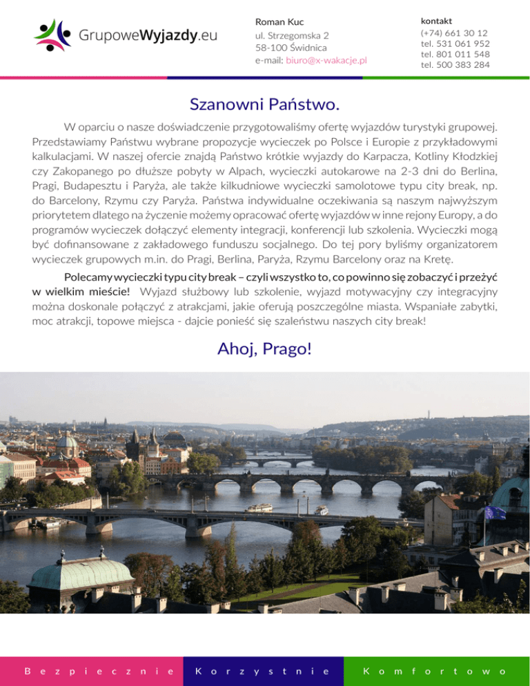 Roman Kuc ul. Strzegomska 2 58-100 Świdnica e-mail: [email protected] kontakt (+74) 661 30 12 tel. 531 061 952 tel. 801 011 548 tel. 500 383 284 Szanowni Państwo. W oparciu o nasze doświadczenie przygotowaliśmy ofertę wyjazdów turystyki grupowej. Przedstawiamy Państwu wybrane propozycje wycieczek po Polsce i Europie z przykładowymi kalkulacjami. W naszej ofercie znajdą Państwo krótkie wyjazdy do Karpacza, Kotliny Kłodzkiej czy Zakopanego po dłuższe pobyty w Alpach, wycieczki autokarowe na 2-3 dni do Berlina, Pragi, Budapesztu i Paryża, ale także kilkudniowe wycieczki samolotowe typu city break, np. do Barcelony, Rzymu czy Paryża. Państwa indywidualne oczekiwania są naszym najwyższym priorytetem dlatego na życzenie możemy opracować ofertę wyjazdów w inne rejony Europy, a do programów wycieczek dołączyć elementy integracji, konferencji lub szkolenia. Wycieczki mogą być dofinansowane z zakładowego funduszu socjalnego. Do tej pory byliśmy organizatorem wycieczek grupowych m.in. do Pragi, Berlina, Paryża, Rzymu Barcelony oraz na Kretę. Polecamy wycieczki typu city break – czyli wszystko to, co powinno się zobaczyć i przeżyć w wielkim mieście! Wyjazd służbowy lub szkolenie, wyjazd motywacyjny czy integracyjny można doskonale połączyć z atrakcjami, jakie oferują poszczególne miasta. Wspaniałe zabytki, moc atrakcji, topowe miejsca - dajcie ponieść się szaleństwu naszych city break! Ahoj, Prago! B e z p i e c z n i e K o r z y s t n i e K o m f o r t o w o Roman Kuc ul. Strzegomska 2 58-100 Świdnica e-mail: [email protected] kontakt (+74) 661 30 12 tel. 531 061 952 tel. 801 011 548 tel. 500 383 284 Udaj się do modnej i kosmopolitycznej stolicy Czech! Zobacz piękne centrum wpisane na listę UNESCO. Magiczna Złota Uliczka, zakamarki Małej Strany, tradycyjna czeska kuchnia, doskonałe piwo to tylko nieliczne powody, dla których trzeba udać się do Pragi. Saluti Roma! B e z p i e c z n i e K o r z y s t n i e K o m f o r t o w o Roman Kuc ul. Strzegomska 2 58-100 Świdnica e-mail: [email protected] kontakt (+74) 661 30 12 tel. 531 061 952 tel. 801 011 548 tel. 500 383 284 Zobacz z nami jak wspaniałe i fascynujące miasto założyli Remus i Romulus. Proponujemy ciekawy program zawierający wszystko to, co koniecznie trzeba w Wiecznym Mieście zobaczyć: Koloseum, Watykan i skarby jego muzeów, Panteon, najsławniejsze place oraz fontanny. Guten Tag Berlin! B e z p i e c z n i e K o r z y s t n i e K o m f o r t o w o kontakt (+74) 661 30 12 tel. 531 061 952 tel. 801 011 548 tel. 500 383 284 Roman Kuc ul. Strzegomska 2 58-100 Świdnica e-mail: [email protected] Udaj się do nowoczesnej metropolii, gdzie ścierają się kultury z całego świata. To miasto bogate we wszelkiego rodzaju ślady przeszłości, zabytki, muzea, pomniki, teatry i filharmonie. Zobaczycie z nami Mur Berliński, Parlament – Reichstag, Aleksanderplatz, wieżę berlińską, Operę Berlińską i wiele innych miejsc, których wagę doceniają turyści z całego świata. Zakochaj się w romantycznym Paryżu! B e z p i e c z n i e K o r z y s t n i e K o m f o r t o w o Roman Kuc ul. Strzegomska 2 58-100 Świdnica e-mail: [email protected] kontakt (+74) 661 30 12 tel. 531 061 952 tel. 801 011 548 tel. 500 383 284 Zapraszamy na wspólny spacer po romantycznym Paryżu. W programie zawarto najbardziej znane zabytki oraz miejsca znane z wielu filmów i powieści. Podczas wycieczki wespniemy się na Wieżę Eiffela, zaplanujemy wizytę w Luwrze, zobaczymy Łuk Triumfalny oraz zatrzymamy się na Moście Aleksandra by podziwiać spokojną Sekwanę. Londyn - Welcome to London! B e z p i e c z n i e K o r z y s t n i e K o m f o r t o w o kontakt (+74) 661 30 12 tel. 531 061 952 tel. 801 011 548 tel. 500 383 284 Roman Kuc ul. Strzegomska 2 58-100 Świdnica e-mail: [email protected] Zobacz jedną z najbardziej fascynujących stolic świata, należącą do ścisłej czołówki największych metropolii. W Londynie nie sposób się nudzić! Miasto to, poza bogactwem atrakcji turystycznych, jest prawdziwym rajem dla zakupoholików, którzy mogą zaszaleć na Oxford Street, imprezowiczów lubiących ogromne kluby i koncerty, a także miłośników sztuki i historii ze względu na wspaniałe muzea i galerie. Specyficzna atmosfera Londynu z pewnością pochłonie każdego! Cała ona – tętniąca życiem Barcelona! B e z p i e c z n i e K o r z y s t n i e K o m f o r t o w o Roman Kuc ul. Strzegomska 2 58-100 Świdnica e-mail: [email protected] kontakt (+74) 661 30 12 tel. 531 061 952 tel. 801 011 548 tel. 500 383 284 Udaj się do tętniącej życiem stolicy Katalonii. To Miasto Gaudíego, Picassa, Miró, pełne najciekawszych zabytków, światowej klasy muzeum i galerii. Tutaj po prostu nie sposób się nudzić! Jest to rewelacyjna propozycja dla wielbicieli wycieczek typu city break, którzy poza zwiedzaniem miasta, chcą zaznać kąpieli słonecznych, udać się na zakupy czy zaszaleć w wiecznie otwartych pubach. Budapeszt- poznaj perłę Dunaju! B e z p i e c z n i e K o r z y s t n i e K o m f o r t o w o Roman Kuc ul. Strzegomska 2 58-100 Świdnica e-mail: [email protected] kontakt (+74) 661 30 12 tel. 531 061 952 tel. 801 011 548 tel. 500 383 284 Budapeszt to nowoczesna metropolia, która oczarowuje malowniczym położeniem, wspaniałymi zabytkami, barwną historią oraz swoistym klimatem. Nikt nie zaprzeczy, że miasto to jest Perłą Dunaju i jedną z piękniejszych stolic Europy! W programie zaplanowano wiele atrakcji turystycznych, w tym oczywiście Zamek Królewski, Parlament, Wzgórze Zamkowe oraz chwilę odpoczynku na Wyspie Małgorzaty. Do tego węgierska kultura kulinaria... Zakochacie się w węgierskiej stolicy bez pamięci! Witaj, Warszawo! B e z p i e c z n i e K o r z y s t n i e K o m f o r t o w o Roman Kuc ul. Strzegomska 2 58-100 Świdnica e-mail: [email protected] kontakt (+74) 661 30 12 tel. 531 061 952 tel. 801 011 548 tel. 500 383 284 Zapraszamy na spacer p