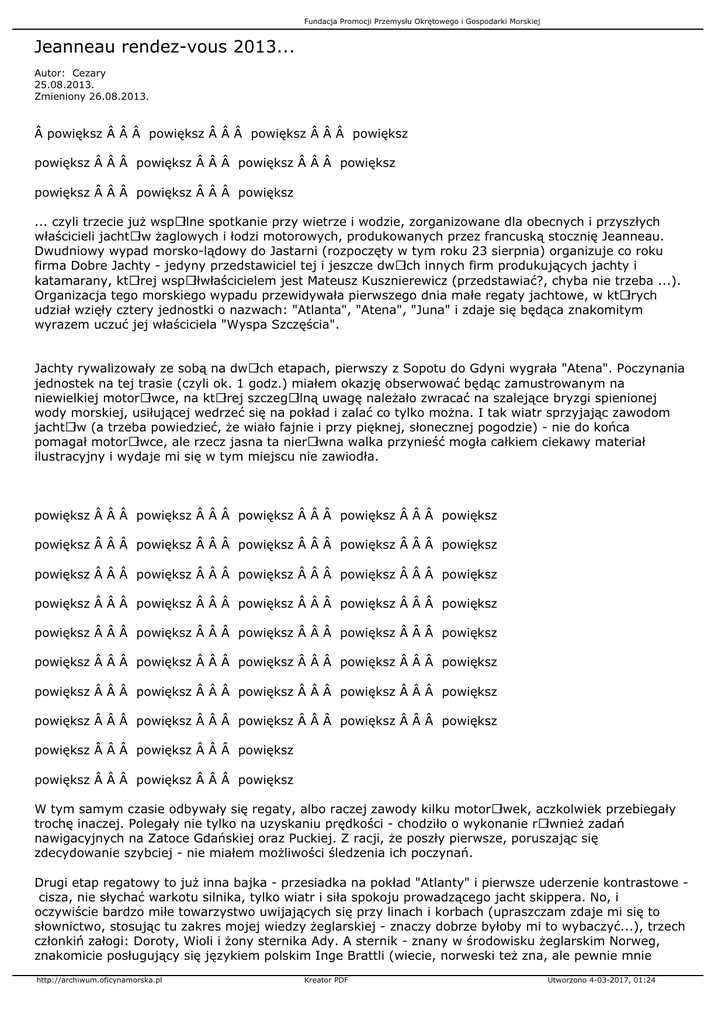 Fundacja Promocji Przemysłu Okrętowego i Gospodarki Morskiej Jeanneau rendez-vous 2013... Autor: Cezary 25.08.2013. Zmieniony 26.08.2013.  powiększ    powiększ    powiększ    powiększ powiększ    powiększ    powiększ    powiększ powiększ    powiększ    powiększ ... czyli trzecie już wspÃłlne spotkanie przy wietrze i wodzie, zorganizowane dla obecnych i przyszłych właścicieli jachtÃłw żaglowych i łodzi motorowych, produkowanych przez francuską stocznię Jeanneau. Dwudniowy wypad morsko-lądowy do Jastarni (rozpoczęty w tym roku 23 sierpnia) organizuje co roku firma Dobre Jachty - jedyny przedstawiciel tej i jeszcze dwÃłch innych firm produkujących jachty i katamarany, ktÃłrej wspÃłłwłaścicielem jest Mateusz Kusznierewicz (przedstawiać?, chyba nie trzeba ...). Organizacja tego morskiego wypadu przewidywała pierwszego dnia małe regaty jachtowe, w ktÃłrych udział wzięły cztery jednostki o nazwach: "Atlanta", "Atena", "Juna" i zdaje się będąca znakomitym wyrazem uczuć jej właściciela "Wyspa Szczęścia". Jachty rywalizowały ze sobą na dwÃłch etapach, pierwszy z Sopotu do Gdyni wygrała "Atena". Poczynania jednostek na tej trasie (czyli ok. 1 godz.) miałem okazję obserwować będąc zamustrowanym na niewielkiej motorÃłwce, na ktÃłrej szczegÃłlną uwagę należało zwracać na szalejące bryzgi spienionej wody morskiej, usiłującej wedrzeć się na pokład i zalać co tylko można. I tak wiatr sprzyjając zawodom jachtÃłw (a trzeba powiedzieć, że wiało fajnie i przy pięknej, słonecznej pogodzie) - nie do końca pomagał motorÃłwce, ale rzecz jasna ta nierÃłwna walka przynieść mogła całkiem ciekawy materiał ilustracyjny i wydaje mi się w tym miejscu nie zawiodła. powiększ    powiększ    powiększ    powiększ    powiększ powiększ    powiększ    powiększ    powiększ    powiększ powiększ    powiększ    powiększ    powiększ    powiększ powiększ    powiększ    powiększ    powiększ    powiększ powiększ    powiększ    powiększ    powiększ    powiększ powiększ    powiększ    powiększ    powiększ    powiększ powiększ    powiększ    powiększ    powiększ    powiększ powiększ    powiększ    powiększ    powiększ    powiększ powiększ    powiększ    powiększ powiększ    powiększ    powiększ W tym samym czasie odbywały się regaty, albo raczej zawody kilku motorÃłwek, aczkolwiek przebiegały trochę inaczej. Polegały nie tylko na uzyskaniu prędkości - chodziło o wykonanie rÃłwnież zadań nawigacyjnych na Zatoce Gdańskiej oraz Puckiej. Z racji, że poszły pierwsze, poruszając się zdecydowanie szybciej - nie miałem możliwości śledzenia ich poczynań. Drugi etap regatowy to już inna bajka - przesiadka na pokład "Atlanty" i pierwsze uderzenie kontrastowe cisza, nie słychać warkotu silnika, tylko wiatr i siła spokoju prowadzącego jacht skippera. No, i oczywiście bardzo miłe towarzystwo uwijających się przy linach i korbach (upraszczam zdaje mi się to słownictwo, stosując tu zakres mojej wiedzy żeglarskiej - znaczy dobrze byłoby mi to wybaczyć...), trzech członkiń załogi: Doroty, Wioli i żony sternika Ady. A sternik - znany w środowisku żeglarskim Norweg, znakomicie posługujący się językiem polskim Inge Brattli (wiecie, norweski też zna, ale pewnie mnie http://archiwum.oficynamorska.pl Kreator PDF Utworzono 4-03-2017, 01:24 Fundacja Promocji Przemysłu Okrętowego i Gospodarki Morskiej byłoby trudniej...), obecnie wraz z rodziną mieszkający nad samym morzem - w Krakowie i prowadzący tam firmę sprzedającą luksusowe jachty wielokadłubowe. I jak na znakomitego żeglarza przystało, wziął i po prostu wygrał z dużą przewagą ten etap regat, przebiegający na odcinku czasowo dwukrotnie dłuższym z Gdyni do Jastarni. I obiecał, że (cytując tu mistrza) nie przeniesie nam stolicy do Krakowa (z Gdyni oczywiście), albo tak mi się tylko wydawało... powiększ    powiększ    powiększ    powiększ    powiększ powiększ    powiększ    powiększ    powiększ    powiększ powiększ    powiększ    powiększ    powiększ    powiększ powiększ    powiększ    powiększ    powiększ    powiększ powiększ    powiększ    powiększ    powiększ    powiększ powiększ    powiększ    powiększ    powiększ    powiększ powiększ    powiększ    powiększ    powiększ    powiększ A pod wieczÃłr, kiedy wszyscy już znaleźli się w Jastarni odbyło się małe przyjęcie, połączone z prezentacją wyrobÃłw stoczniowych Firmy Jeanneau - oczywiście celem zachęcenia do posiadania takowych, przez tych jeszcze nie zdecydowanych. Pokaz prowadzili organizatorzy, czyli: Mateusz Kusznierewicz, Maciej StompÃłr i Jarosław Chłopek. powiększ    powiększ    powiększ    powiększ    powiększ powiększ    powiększ    powiększ    powiększ    powiększ Drugi dzień zapowiadał się rÃłwnie ciekawie - w planach były pokazy ratownictwa morskiego, dla chętnych wyścigi na łÃłdkach żaglowych i prÃłba sił na nartach wodnych. Niestety inne obowiązki przeszkodziły mi w obserwacji tych atrakcyjnych zmagań. Oczywiście tego rodzaju spotkania integracyjne, przebiegające, jak to było widać po minach uczestnikÃłw w bardzo przyjacielskiej atmosferze, służą m.in. do propagowania zalet rekreacyjnych płynących z uprawiania żeglarstwa. Dzisiaj bardzo ważnym jest uświadamianie młodym ludziom, że komputery to tylko narzędzia w pracy człowieka i nie trzeba im poświęcać całej swojej energii i życia, gdyż świat oprÃłcz gier oferuje bardzo wielki wybÃłr atrakcji przebiegających w "realu" i co ważniejsze - coraz bardziej dostępnych. Tekst i zdjęcia: Cezary Spigarski (a kogo jeszcze nie znuży