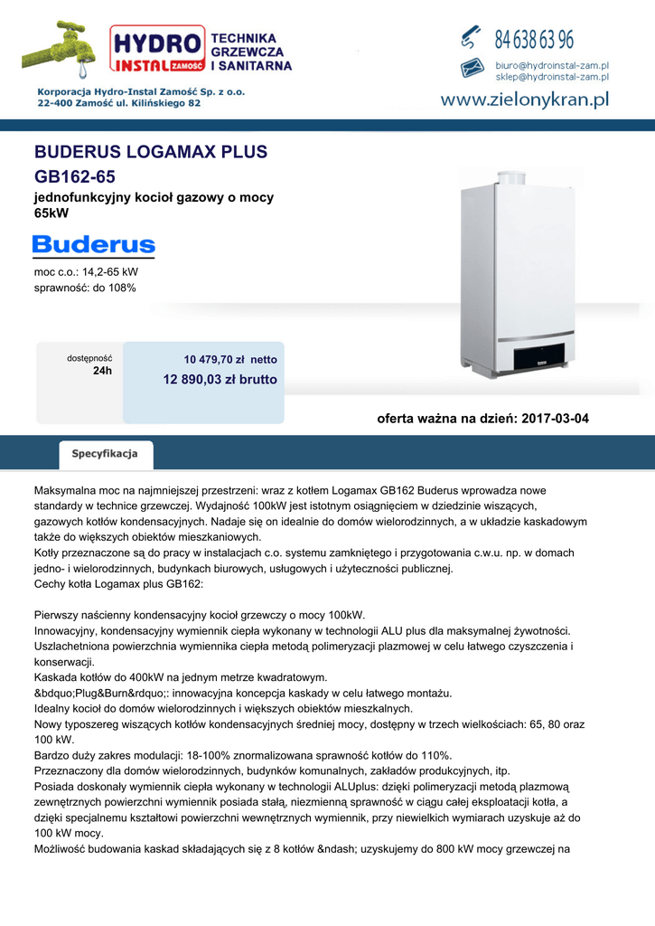 BUDERUS LOGAMAX PLUS GB162-65 jednofunkcyjny kocioł gazowy o mocy 65kW moc c.o.: 14,2-65 kW sprawność: do 108% dostępność 24h 10 479,70 zł netto 12 890,03 zł brutto oferta ważna na dzień: 2017-03-04 Maksymalna moc na najmniejszej przestrzeni: wraz z kotłem Logamax GB162 Buderus wprowadza nowe standardy w technice grzewczej. Wydajność 100kW jest istotnym osiągnięciem w dziedzinie wiszących, gazowych kotłów kondensacyjnych. Nadaje się on idealnie do domów wielorodzinnych, a w układzie kaskadowym także do większych obiektów mieszkaniowych. Kotły przeznaczone są do pracy w instalacjach c.o. systemu zamkniętego i przygotowania c.w.u. np. w domach jedno- i wielorodzinnych, budynkach biurowych, usługowych i użyteczności publicznej. Cechy kotła Logamax plus GB162: Pierwszy naścienny kondensacyjny kocioł grzewczy o mocy 100kW. Innowacyjny, kondensacyjny wymiennik ciepła wykonany w technologii ALU plus dla maksymalnej żywotności. Uszlachetniona powierzchnia wymiennika ciepła metodą polimeryzacji plazmowej w celu łatwego czyszczenia i konserwacji. Kaskada kotłów do 400kW na jednym metrze kwadratowym. „Plug&Burn”: innowacyjna koncepcja kaskady w celu łatwego montażu. Idealny kocioł do domów wielorodzinnych i większych obiektów mieszkalnych. Nowy typoszereg wiszących kotłów kondensacyjnych średniej mocy, dostępny w trzech wielkościach: 65, 80 oraz 100 kW. Bardzo duży zakres modulacji: 18-100% znormalizowana sprawność kotłów do 110%. Przeznaczony dla domów wielorodzinnych, budynków komunalnych, zakładów produkcyjnych, itp. Posiada doskonały wymiennik ciepła wykonany w technologii ALUplus: dzięki polimeryzacji metodą plazmową zewnętrznych powierzchni wymiennik posiada stałą, niezmienną sprawność w ciągu całej eksploatacji kotła, a dzięki specjalnemu kształtowi powierzchni wewnętrznych wymiennik, przy niewielkich wymiarach uzyskuje aż do 100 kW mocy. Możliwość budowania kaskad składających się z 8 kotłów – uzyskujemy do 800 kW mocy grzewczej na niewielkiej przestrzeni kotłowni. Multifunkcjonalna grupa pompowa (wyposażenie dodatkowe) dla ułatwienia montażu kotłów. Łatwa i przyjazna obsługa kotłów poprzez menu serwisowe sterownika Logamatic RC35, dla rozbudowanych instalacji przeznaczony system regulacji z serii 4000. Kocioł przystosowany do spalania gazu ziemnego GZ50 (odatkowo wersje 80 i 100 kW dla GZ41,5 oraz wersja 65 kW dla GZ 35) . numer katalogowy: 7746900768 moc c.o.: 14,2-65 kW sprawność: do 108% komora spalania: zamknięta paliwo: E, 3P maksymalna temperatura zasilania: 90oC dopuszczalne nadciśnienie robocze: 4 bary pojemność wodna: 5,0 l czas wybiegu pompy (nastawiany w sterowniku bazowym Logamatic BC10): 1-60 min strumień masowy spalin2) dla pełnej mocy 100%: 0,0272 kg/s temperatura spalin2 (pełna moc) dla 80/60oC: 64oC temperatura spalin2 (pełna moc) dla 50/30oC: 43oC zawartość CO2 dla pełnej mocy: 9,3% dyspozycyjne ciśnienie tłoczenia spalin: 120 Pa napięcie zasilania elektrycznego: 230V częstotliwość sieci: 50hz stopień ochrony elektrycznej: IPX4 D(IP44) pobór energii elektrycznej (moc częściowa): 21 W pobór energii elektrycznej (moc pełna): 99 W ilość kondensatu przy temperaturze systemu grzewczego 40/30oC (gaz ziemny): 6,9 l/h wartość pH kondensatu: ~4,1 oznakowanie CE: CE 0063 BP 3663 znamionowa moc dla temperatur 80/60oC: 14,2-60,5 kW znamionowa moc dla temperatur 50/30oC: 5,6-65,0 kW moc cieplna palnika: 14,6-62,0 kW sprawność znormalizowana dla temperatur 75/60oC: 107% sprawność znormalizowana dla temperatur 40/30oC: 108% gwarancja: do 60m-cy wysokość: 980mm szerokość: 520mm głębokość: 465mm waga: 70kg Opiekun produktu: Andrzej Iwicki [email protected] 609 700 070