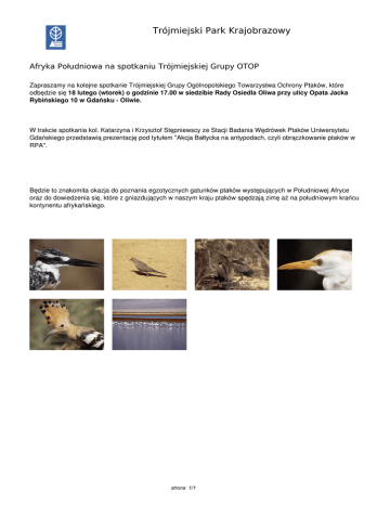 Trójmiejski Park Krajobrazowy Afryka Południowa na spotkaniu Trójmiejskiej Grupy OTOP Zapraszamy na kolejne spotkanie Trójmiejskiej Grupy Ogólnopolskiego Towarzystwa Ochrony Ptaków, które odbędzie się 18 lutego (wtorek) o godzinie 17.00 w siedzibie Rady Osiedla Oliwa przy ulicy Opata Jacka Rybińskiego 10 w Gdańsku - Oliwie. W trakcie spotkania kol. Katarzyna i Krzysztof Stępniewscy ze Stacji Badania Wędrówek Ptaków Uniwersytetu Gdańskiego przedstawią prezentację pod tytułem "Akcja Bałtycka na antypodach, czyli obrączkowanie ptaków w RPA". Będzie to znakomita okazja do poznania egzotycznych gatunków ptaków występujących w Południowej Afryce oraz do dowiedzenia się, które z gniazdujących w naszym kraju ptaków spędzają zimę aż na południowym krańcu kontynentu afrykańskiego. strona 1/1 Powered by TCPDF (www.tcpdf.org)