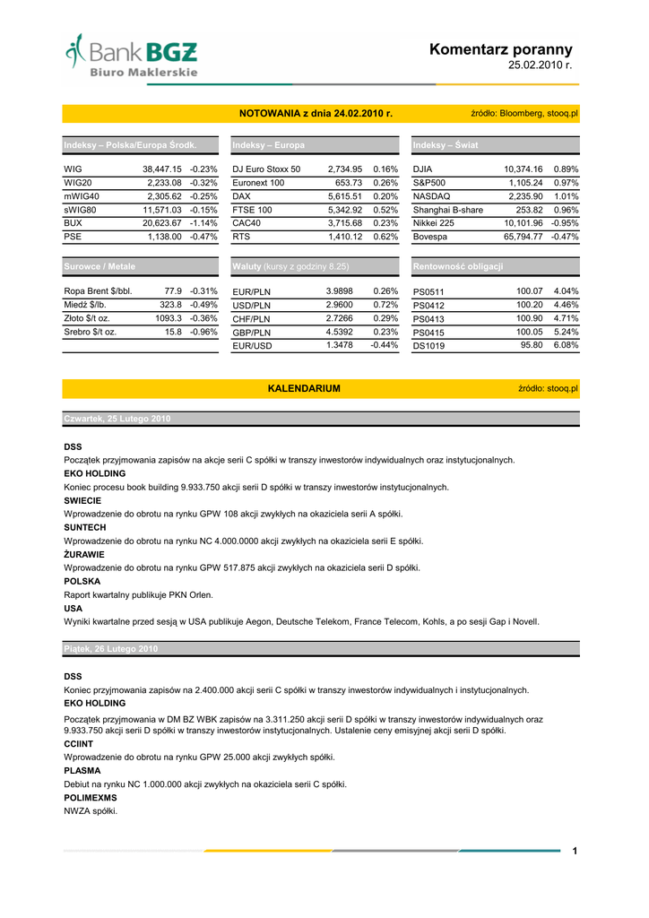 Komentarz poranny 25.02.2010 r. NOTOWANIA z dnia 24.02.2010 r. Indeksy – Polska/Europa Środk. Indeksy – Europa WIG DJ Euro Stoxx 50 38,447.15 -0.23% źródło: Bloomberg, stooq.pl Indeksy – Świat 2,734.95 0.16% DJIA 10,374.16 0.89% 653.73 0.26% S&P500 1,105.24 0.97% DAX 5,615.51 0.20% NASDAQ 2,235.90 1.01% 11,571.03 -0.15% FTSE 100 5,342.92 0.52% Shanghai B-share 253.82 0.96% BUX 20,623.67 -1.14% CAC40 3,715.68 0.23% Nikkei 225 10,101.96 -0.95% PSE 1,138.00 -0.47% RTS 1,410.12 0.62% Bovespa 65,794.77 -0.47% WIG20 2,233.08 -0.32% Euronext 100 mWIG40 2,305.62 -0.25% sWIG80 Surowce / Metale Waluty (kursy z godziny 8.25) Ropa Brent $/bbl. Rentowność obligacji 77.9 -0.31% EUR/PLN 3.9898 0.26% PS0511 100.07 Miedź $/lb. 323.8 -0.49% USD/PLN 2.9600 0.72% PS0412 100.20 4.46% Złoto $/t oz. 1093.3 -0.36% CHF/PLN 2.7266 0.29% PS0413 100.90 4.71% 15.8 -0.96% GBP/PLN 4.5392 0.23% PS0415 100.05 5.24% EUR/USD 1.3478 -0.44% DS1019 95.80 6.08% Srebro $/t oz. KALENDARIUM 4.04% źródło: stooq.pl Czwartek, 25 Lutego 2010 DSS Początek przyjmowania zapisów na akcje serii C spółki w transzy inwestorów indywidualnych oraz instytucjonalnych. EKO HOLDING Koniec procesu book building 9.933.750 akcji serii D spółki w transzy inwestorów instytucjonalnych. SWIECIE Wprowadzenie do obrotu na rynku GPW 108 akcji zwykłych na okaziciela serii A spółki. SUNTECH Wprowadzenie do obrotu na rynku NC 4.000.0000 akcji zwykłych na okaziciela serii E spółki. śURAWIE Wprowadzenie do obrotu na rynku GPW 517.875 akcji zwykłych na okaziciela serii D spółki. POLSKA Raport kwartalny publikuje PKN Orlen. USA Wyniki kwartalne przed sesją w USA publikuje Aegon, Deutsche Telekom, France Telecom, Kohls, a po sesji Gap i Novell. Piątek, 26 Lutego 2010 DSS Koniec przyjmowania zapisów na 2.400.000 akcji serii C spółki w transzy inwestorów indywidualnych i instytucjonalnych. EKO HOLDING Początek przyjmowania w DM BZ WBK zapisów na 3.311.250 akcji serii D spółki w transzy inwestorów indywidualnych oraz 9.933.750 akcji serii D spółki w transzy inwestorów instytucjonalnych. Ustalenie ceny emisyjnej akcji serii D spółki. CCIINT Wprowadzenie do obrotu na rynku GPW 25.000 akcji zwykłych spółki. PLASMA Debiut na rynku NC 1.000.000 akcji zwykłych na okaziciela serii C spółki. POLIMEXMS NWZA spółki. 1 UNIBEP Publikacja raportu rocznego za 2008 rok oraz skonsolidowanego raportu rocznego za 2008 rok. Komentarz poranny, 22.04.2009 Komentarz poranny, 25.02.2010 r. ANALIZA TECHNICZNA Marcin Lachowski WIG20 WIG20 W średnim horyzoncie czasowym na wykresie WIGu20 dominuje negatywna formacja głowy z ramionami. Jej linia szyi znajdująca się na poziomie 2160 na razie stanowi najbliŜsze wsparcie i dopiero jej przełamanie byłoby negatywnym sygnałem. W krótszym horyzoncie czasowym liczy się konsolidacja pomiędzy wsparciem w okolicach 2225, a oporem w okolicach 2286. W środę mieliśmy odbicie od wsparcia, więc teraz moŜna oczekiwać wahnięcia w górę. GLOWA 2500 2500 RAMIE 2400 2400 RAMIE 2300 2300 OPÓR WSPARCIE 2200 2200 SZYJA 2100 2100 21 28 5 October 12 19 26 2 9 November 16 23 30 7 December 14 21 28 4 2010 11 18 25 1 8 February 15 22 1 8 March mWIG40 MWIG40 MWIG40 znowu trochę spadł i znalazł się poniŜej wsparcia oznaczonego poziomą linią. Mimo to nie moŜna mówić o powaŜnym pogorszeniu, poniewaŜ skala spadku jest mniejsza niŜ poprzednio, a biała świeczka, nawet mała i połoŜona poniŜej wygląda lepiej, niŜ wcześniejsze czarne korpusy. 2400 2400 SKALA LOGARYTMICZNA WYKRES DZIENNY 2350 2350 OPÓR 2300 2300 WSPARCIE 2250 2250 2200 2200 Obroty 20000 20000 15000 15000 10000 10000 x10 x10 11 18 25 1 February 8 15 22 1 March 2 Komentarz poranny, 22.04.2009 Komentarz poranny, 25.02.2010 r. ANALIZA TECHNICZNA Marcin Lachowski S&P500 GLOWA S&P500 Wczorajsze dane z rynku nieruchomości były słabe. SprzedaŜ nowych domów spadła w styczniu o 11,2% do najniŜszego poziomu od 1963. Mimo to S&P500 mocno wzrósł, prawdopodobnie z powodu wypowiedzi Bernankego o tym, Ŝe ostatnia podwyŜka stopy dyskontowej nie jest wstępem do dalszego zaostrzania polityki pienięŜnej. Z technicznego punktu widzenia zasadniczych zmian nie ma, choć zniwelowanie większości wcześniejszego spadku robi dobre wraŜenie. Poza tym mamy nowe wsparcie, czyli poziom wtorkowego minimum (1092). 1150 1150 WYKRES DZIENNY SKALA ARYTMETYCZNA RAMIE OPÓR RAMIE 1100 1100 WSPARCIE 1050 1050 SZYJA 14 21 28 5 October 12 19 26 2 9 November 16 23 30 7 December 14 21 28 4 2010 11 19 25 1 8 February 16 22 1 March DAX DAX Niewielka poprawa nastąpiła teŜ na wykresie DAXa, poniewaŜ indeks ten odbił się od wsparcia wyznaczonego przez lukę i utworzył pozytywną formację. Na dłuŜszą metę waŜniejsza jest jednak formacja RGR. GLOW A 6100 6100 6000 6000 RAMIE 5900 5900 RAMIE 5800 5800 5700 5700 5600 5600 5500 5500 5400 5400 5300 5300 5200 5200 5100 5100 5000 5000 4900 4900 20 27 3 10 August 17 24 31 7 14 September 21 28 5 12 October 19 26 2 9 16 November 23 30 7 14 December 21 4 11 2010 18 25 1 8 February 15 22 1 8 March 15 3 ul. śurawia 6/12, 00–503 Warszawa tel. (22) 32 94 300, fax (22) 32 94 303 e-mail: [email protected] www.bgz.pl Doradztwo Inwestycyjne telefon adres email Tomasz Dumała (022) 329 43 40 Marcin Lachowski (022) 329 43 84 Grzegorz Kujawski (022) 329 43 46 Tomasz Manowiec (022) 329 43 44 tomasz.dumał[email protected] [email protected] [email protected] [email protected] Operacje Brokerskie telefon adres email Jarosław Duszczyk Klienci instytucjonalni (022) 329 43 23 Marek Niewiadomski Klienci instytucjonalni (022) 329 43 26 Grzegorz Leszek Klienci instytucjonalni (022) 329 43 25 Monika Dudek Klienci detaliczni (022) 329 43 24/20 Przemysław Borycki Klienci detaliczni (022) 329 43 22 [email protected] [email protected] [email protected] [email protected] przemysł[email protected] telefon adres email [email protected] bogusł[email protected] Oferty Publiczne (IPO) Marek Jaczewski Główny specjali