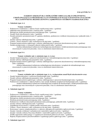 ZAŁĄCZNIK Nr 3 ZAKRESY SZKOLEŃ DLA OSÓB, KTÓRE UBIEGAJĄ SIĘ O UPRAWNIENIA UMOŻLIWIAJĄCE ZATRUDNIENIE NA STANOWISKACH MAJĄCYCH ISTOTNE ZNACZENIE DLA ZAPEWNIENIA BEZPIECZEŃSTWA JĄDROWEGO I OCHRONY RADIOLOGICZNEJ 1. Szkolenie typu A-A - Tematy wykładów: Podstawowe wiadomości z zakresu fizyki współczesnej (min. 1 godzina) Oddziaływanie promieniowania z materią (min. 1 godzina) Biologiczne skutki promieniowania jonizującego (min. 1 godzina) Zasady fizyki akceleratorów (min. 1 godzina) Zasady pomiarów promieniowania X i gamma, detektory, podstawowe wielkości dozymetryczne i jednostki (min. 3 godziny) Zasady ochrony radiologicznej (min. 1 godzina) Ustawa - Prawo atomowe i akty wykonawcze do niej (min. 1 godzina) Program bezpieczeństwa jądrowego i ochrony radiologicznej w pracowni akceleratorowej (min. 1 godzina) Zasady postępowania w sytuacjach zdarzeń radiacyjnych (min. 1 godzina) Analiza dokumentacji techniczno-technologicznej akceleratora i źródeł promieniowania jonizującego oraz stosowanych w pracowni procedur, wraz ze szkoleniem stanowiskowym. 2. Szkolenie typu S-A Tematy wykładów jak w szkoleniu typu A-A oraz: - Zasady bezpiecznej pracy w pracowni akceleratorowej i teleradioterapeutycznej (min. 2 godziny) - Zasady ochrony radiologicznej pacjentów (min. 2 godziny) - Program bezpieczeństwa jądrowego i ochrony radiologicznej w pracowni akceleratorowej i teleradioterapeutycznej (min. 4 godziny) Analiza dokumentacji techniczno-technologicznej akceleratora i urządzeń do teleradioterapii oraz stosowanych w pracowni procedur, wraz ze szkoleniem stanowiskowym. 3. Szkolenie typu S-Z - Tematy wykładów jak w szkoleniu typu A-A, z wyłączeniem zasad fizyki akceleratorów oraz: Zasady bezpiecznej pracy w pracowni brachyterapii (min. 2 godziny) Zasady ochrony radiologicznej pacjentów (min. 2 godziny) Program bezpieczeństwa jądrowego i ochrony radiologicznej w pracowni brachyterapii (min. 4 godziny) Podstawowe wiadomości z zakresu budowy oraz zasady działania urządzeń do brachyterapii (min. 2 godziny) Analiza dokumentacji techniczno-technologicznej urządzeń do brachyterapii i źródeł promieniowania jonizującego oraz stosowanych w pracowni procedur, wraz ze szkoleniem stanowiskowym. 4. Szkolenie typu S-E - Tematy wykładów: Podstawowe wiadomości z zakresu fizyki współczesnej (min. 1 godzina) Oddziaływanie promieniowania z materią (min. 1 godzina) Biologiczne skutki promieniowania jonizującego (min. 1 godzina) Detekcja promieniowania jonizującego (min. 2 godziny) Podstawowe wielkości dozymetrii promieniowania jonizującego, jednostki (min. 2 godziny) Zasady ochrony radiologicznej (min. 4 godziny) Zagadnienie krytyczności i współczynnika mnożenia (min. 4 godziny) Ustawa - Prawo atomowe i akty wykonawcze do niej (min. 2 godziny) Konwencje i umowy międzynarodowe w zakresie zabezpieczeń materiałów jądrowych (min. 2 godziny) Zasady i metody ewidencji i rachunkowości materiałów jądrowych (min. 2 godziny) Zasady i metody ochrony fizycznej obiektów i materiałów jądrowych (min. 2 godziny) Źródła zagrożenia radiacyjnego w wypalonych elementach paliwowych (min. 1 godzina) Raporty bezpieczeństwa przechowalników wypalonego paliwa jądrowego (min. 1 godzina) 5. Szkolenie typu S-O Tematy wykładów jak w szkoleniu typu S-E oraz: - Zasady bezpiecznej pracy z zamkniętymi źródłami promieniotwórczymi, urządzeniami zawierającymi takie źródła, otwartymi źródłami promieniotwórczymi, w pracowni i poza pracownią (min. 4 godziny) - Zasady postępowania z odpadami promieniotwórczymi - metody przerobu i kondycjonowania, transport, składowanie (min. 4 godziny) - Zasady pomiarów mocy dawki i skażeń promieniotwórczych (min. 2 godziny) - Organizacja ochrony radiologicznej w jednostce organizacyjnej, obowiązki i uprawnienia kierownika jednostki, inspektora ochrony radiologicznej, pracowników (min. 2 godziny) - Przygotowanie dokumentów w jednostce organizacyjnej: regulamin pracy, instrukcje pracy, rejestry dawek, rejestry źródeł, zakładowy plan postępowania awaryjnego (min. 2 godziny) Analiza dokumentacji techniczno-technologicznej, łącznie z planami postępowania awaryjnego, składowiska odpadów lub przechowalnika wypalonego paliwa jądrowego. 6. Szkolenie typu R-O - Tematy wykładów jak w szkoleniu typu S-E oraz: Podstawy fizyki jądrowej i reaktorowej (min. 6 godzin) Charakterystyki fizyczne i cieplne reaktora (min. 2 godziny) Detekcja promieniowania jonizującego - uzupełnienie (min. 2 godziny) System barier powstrzymujących rozprzestrzenianie się produktów rozszczepienia (min. 2 godziny) Źródła zagrożenia w jądrowym reaktorze badawczym (min. 2 godziny) Podstawy zagadnień dozymetrii reaktorowej (min. 4 godziny) Gospodarka odpadami promieniotwórczymi i paliwem jądrowym (min. 2 godziny) Awarie w badawczych reaktorach jądrowych (min. 4 godziny) Zasady zapewnienia jakości w eksploatacji jądrowych reaktorów badawczych (min. 4 godziny) Wymiana ciepła w reaktorze (min. 4 godziny) Naświetlanie materiału tarczowego oraz ewidencja i kontrola ruchu źródeł promieniotwórczych (min. 2 godziny) Limity operacyjne w reaktorze badawczym (min. 1 godzina) Analiza dokumentacji techniczno-technologicznej (w tym raportu bezpieczeństwa) reaktora badawczego, ze szczególnym uwzględnieniem następujących tematów: Budowa bloku reaktora Obiegi chłodzenia: pierwotny i wtórny Awaryjne układy chłodzenia Układ wentylacji Układy sterowania, zabezpieczeń i kontroli technologicznej Układ zasilania elektrycznego Standardowe i awaryjne procedury pracy jądrowego reaktora badawczego Charakterystyka i budowa układów kontroli dozymetrycznej Napromienianie w reaktorze Zagadnienia chemiczne Komory gorące i ekspedycja izotopów Plany postępowania awaryjnego Ćwiczenia z zakresu fizyki reaktorowej, obejmujące w szczególności kalibrację prętów regulacyjnych, metody sterowania reaktorem, pomiary efektów reaktywnościow