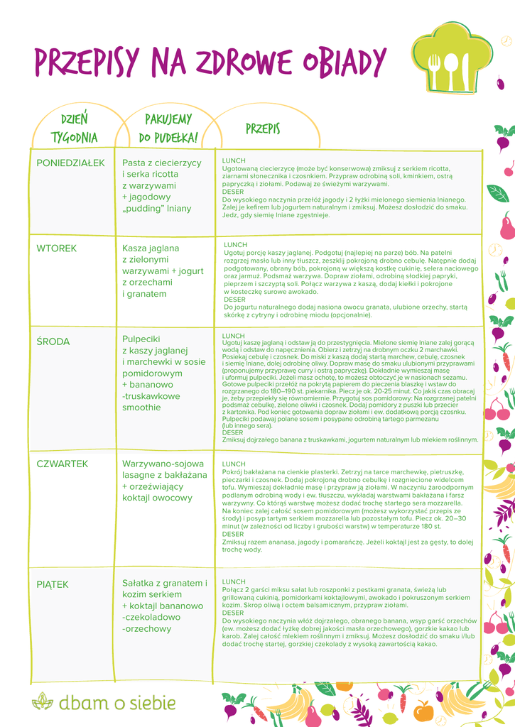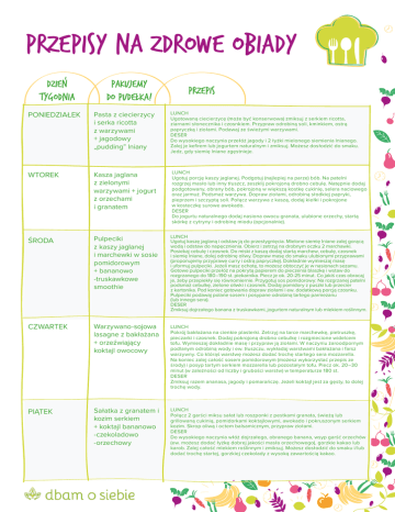 przepisy na zdrowe obiady DZIEN TYGODNIA PAKUJEMY DO PUDELKA! Przepis poniedziałek Pasta z ciecierzycy i serka ricotta z warzywami + jagodowy „pudding” lniany LUNCH Ugotowaną ciecierzycę (może być konserwowa) zmiksuj z serkiem ricotta, ziarnami słonecznika i czosnkiem. Przypraw odrobiną soli, kminkiem, ostrą papryczką i ziołami. Podawaj ze świeżymi warzywami. DESER Do wysokiego naczynia przełóż jagody i 2 łyżki mielonego siemienia lnianego. Zalej je kefirem lub jogurtem naturalnym i zmiksuj. Możesz dosłodzić do smaku. Jedz, gdy siemię lniane zgęstnieje. wtorek Kasza jaglana z zielonymi warzywami + jogurt z orzechami i granatem LUNCH Ugotuj porcję kaszy jaglanej. Podgotuj (najlepiej na parze) bób. Na patelni rozgrzej masło lub inny tłuszcz, zeszklij pokrojoną drobno cebulę. Natępnie dodaj podgotowany, obrany bób, pokrojoną w większą kostkę cukinię, selera naciowego oraz jarmuż. Podsmaż warzywa. Dopraw ziołami, odrobiną słodkiej papryki, pieprzem i szczyptą soli. Połącz warzywa z kaszą, dodaj kiełki i pokrojone w kosteczkę surowe awokado. DESER Do jogurtu naturalnego dodaj nasiona owocu granata, ulubione orzechy, startą skórkę z cytryny i odrobinę miodu (opcjonalnie). środa Pulpeciki z kaszy jaglanej i marchewki w sosie pomidorowym + bananowo -truskawkowe smoothie LUNCH Ugotuj kaszę jaglaną i odstaw ją do przestygnięcia. Mielone siemię lniane zalej gorącą wodą i odstaw do napęcznienia. Obierz i zetrzyj na drobnym oczku 2 marchawki. Posiekaj cebulę i czosnek. Do miski z kaszą dodaj startą marchew, cebulę, czosnek i siemię lniane, dolej odrobinę oliwy. Dopraw masę do smaku ulubionymi przyprawami (proponujemy przyprawę curry i ostrą papryczkę). Dokładnie wymieszaj masę i uformuj pulpeciki. Jeżeli masz ochotę, to możesz obtoczyć je w nasionach sezamu. Gotowe pulpeciki przełóż na pokrytą papierem do pieczenia blaszkę i wstaw do rozgrzanego do 180–190 st. piekarnika. Piecz je ok. 20-25 minut. Co jakiś czas obracaj je, żeby przepiekły się równomiernie. Przygotuj sos pomidorowy: Na rozgrzanej patelni podsmaż cebulkę, zielone oliwki i czosnek. Dodaj pomidory z puszki lub przecier z kartonika. Pod koniec gotowania dopraw ziołami i ew. dodatkową porcją czosnku. Pulpeciki podawaj polane sosem i posypane odrobiną tartego parmezanu (lub innego sera). DESER Zmiksuj dojrzałego banana z truskawkami, jogurtem naturalnym lub mlekiem roślinnym. czwartek Warzywano-sojowa lasagne z bakłażana + orzeźwiający koktajl owocowy LUNCH Pokrój bakłażana na cienkie plasterki. Zetrzyj na tarce marchewkę, pietruszkę, pieczarki i czosnek. Dodaj pokrojoną drobno cebulkę i rozgniecione widelcem tofu. Wymieszaj dokładnie masę i przypraw ją ziołami. W naczyniu żaroodpornym podlanym odrobiną wody i ew. tłuszczu, wykładaj warstwami bakłażana i farsz warzywny. Co którąś warstwę możesz dodać trochę startego sera mozzarella. Na koniec zalej całość sosem pomidorowym (możesz wykorzystać przepis ze środy) i posyp tartym serkiem mozzarella lub pozostałym tofu. Piecz ok. 20–30 minut (w zależności od liczby i grubości warstw) w temperaturze 180 st. DESER Zmiksuj razem ananasa, jagody i pomarańczę. Jeżeli koktajl jest za gęsty, to dolej trochę wody. piątek Sałatka z granatem i kozim serkiem + koktajl bananowo -czekoladowo -orzechowy LUNCH Połącz 2 garści miksu sałat lub roszponki z pestkami granata, świeżą lub grillowaną cukinią, pomidorkami koktajlowymi, awokado i pokruszonym serkiem kozim. Skrop oliwą i octem balsamicznym, przypraw ziołami. DESER Do wysokiego naczynia włóż dojrzałego, obranego banana, wsyp garść orzechów (ew. możesz dodać łyżkę dobrej jakości masła orzechowego), gorzkie kakao lub karob. Zalej całość mlekiem roślinnym i zmiksuj. Możesz dosłodzić do smaku i/lub dodać trochę startej, gorzkiej czekolady z wysoką zawartością kakao.