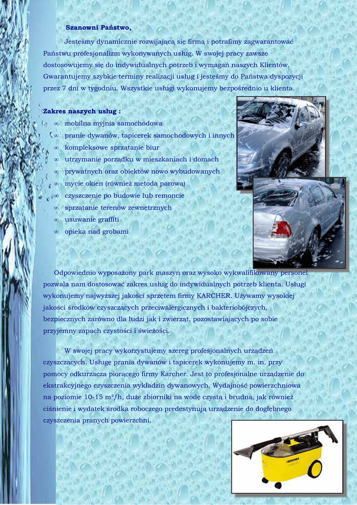 Szanowni Państwo, Jesteśmy dynamicznie rozwijającą się firmą i potrafimy zagwarantować Państwu profesjonalizm wykonywanych usług. W swojej pracy zawsze dostosowujemy się do indywidualnych potrzeb i wymagań naszych Klientów. Gwarantujemy szybkie terminy realizacji usług i jesteśmy do Państwa dyspozycji przez 7 dni w tygodniu. Wszystkie usługi wykonujemy bezpośrednio u klienta. Zakres naszych usług : • mobilna myjnia samochodowa • pranie dywanów, tapicerek samochodowych i innych • kompleksowe sprzątanie biur • utrzymanie porządku w mieszkaniach i domach • prywatnych oraz obiektów nowo wybudowanych • mycie okien (równieŜ metodą parową) • czyszczenie po budowie lub remoncie • sprzątanie terenów zewnętrznych • usuwanie graffiti • opieka nad grobami Odpowiednio wyposaŜony park maszyn oraz wysoko wykwalifikowany personel pozwala nam dostosować zakres usług do indywidualnych potrzeb klienta. Usługi wykonujemy najwyŜszej jakości sprzętem firmy KARCHER. UŜywamy wysokiej jakości środków czyszczących przeciwalergicznych i bakteriobójczych, bezpiecznych zarówno dla ludzi jak i zwierząt, pozostawiających po sobie przyjemny zapach czystości i świeŜości. W swojej pracy wykorzystujemy szereg profesjonalnych urządzeń czyszczących. Usługę prania dywanów i tapicerek wykonujemy m. in. przy pomocy odkurzacza piorącego firmy Karcher. Jest to profesjonalne urządzenie do ekstrakcyjnego czyszczenia wykładzin dywanowych. Wydajność powierzchniowa na poziomie 10-15 m²/h, duŜe zbiorniki na wodę czystą i brudną, jak równieŜ ciśnienie i wydatek środka roboczego predestynują urządzenie do dogłębnego czyszczenia pranych powierzchni. Parownica firmy Karcher zadowoli nawet najbardziej wymagających klientów. Urządzenie idealnie nadaje się do twardych podłóg: para wodna usuwa nawet najbardziej uporczywe zabrudzenia bez konieczności szorowania. Funkcja Vapohydro: umoŜliwia wyrzucanie kropel gorącej wody w strumieniu pary, znakomicie przyczynia się do spłukiwania rozpuszczonego brudu. Urządzenie klasy super. Doskonale sprawdza się na duŜych powierzchniach i wszechstronnego zastosowania. Urządzenie posiada dyszę do czyszczenia okien, okrągłą szczotkę, dyszę ręczną i dyszę punktową oraz zestaw do czyszczenia podłóg. Przydatna w łazience, w kuchni, czyści okna, kafle i podłogi twarde a wszystko to bez uŜycia szkodliwych detergentów. Odkurzacz Karcher sucho/mokro ma uniwersalne zastosowanie w przemyśle i handlu, straŜy poŜarnej, zakładach komunalnych, wszędzie tam, gdzie duŜe ilości wody, cieczy muszą zostać odkurzone szybko i sprawnie (np. podczas porządków po zalaniu, pozbycie się cieczy ze zbiorników, pojemników itd.). WyposaŜenie spełniające specjalistyczne wymogi klientów Turbina ssąca typu Bypass, zamontowana w dźwiękochłonnej obudowie (63 dB(A)) Wysoka siła ssania, moŜliwość zasysania śmieci suchych i mokrych, niski poziom hałasu. Oferta nasza skierowana jest zarówno do firm jak i klientów indywidualnych. Obszarem naszej działalności jest Dąbrowa Górnicza i jej najbliŜsze okolice (w tej strefie dojazd do klienta gratis!). Ceny za nasze usługi staramy się dopasować do wymagań oraz moŜliwości klienta. Przy większych zamówieniach oraz stałych zleceniach moŜliwe korzystne rabaty. Zapraszamy do zapoznania się ze szczegółami naszej oferty. Nasza oferta: Mobilna myjnia samochodowa Wewnątrz: - odkurzanie z trzepaniem tapicerki - czyszczenie kokpitu - mycie szyb - pranie tapicerek materiałowych - pielęgnacja tapicerek skórzanych - impregnacja tapicerek materiałowych Z zewnątrz: - bezdotykowe mycie karoserii (mycie + wosk + polerowanie) - czyszczenie i polerowanie elementów chromowych - aplikacja twardego wosku - mycie felg - czyszczenie i nabłyszczanie plastików - nabłyszczanie opon - mycie szyb - aplikacja "niewidzialnej wycieraczki" Pranie - dywanów - foteli i krzeseł - kanap, naroŜników pokojowych i kuchennych, wersalek - tapicerek samochodowych Sprzątanie biur Usługa obejmuje: - utrzymanie w czystości wyposaŜenia biurowego (mebli, sprzętu komputerowego oraz innego sprzętu biurowego) - utrzymanie w czystości powierzchni szklanych (drzwi, ścian przeszklonych, luster) - utrzymanie czystości podłóg (odkurzanie wykładzin, mycie powierzchni posadzek) - utrzymanie czystości w sanitariatach - zaopatrywanie sanitariatów w środki higieniczne (papier toaletowy, ręczniki papierowe, mydło) Sprzątanie mieszkań i domów Stałe utrzymanie czystości obejmuje: - wycieranie kurzu z wszelkich mebli i biurek - przecieranie witryn, gablotek, biblioteczek - przetarcie parapetów, poręczy - odkurzanie dywanów i wykładzin - mycie podłóg panelowych, kamiennych itp. - mycie drzwi - utrzymanie czystości w pomieszczeniach sanitarnych - wyrzucanie śmieci do wyznaczonych kontenerów Prace na indywidualne Ŝyczenie klientów: - trzepanie dywanów - odkurzanie antyalergiczne oraz trzepanie kanap, łóŜek itp. - mycie płytek metodą parową Czyszczenie po remontach Do zakresu prac wchodzi: - odkurzanie ścian, sufitów, podłóg oraz mebli - oczyszczanie pozostałości po zaprawach, farbach i lakierach - czyszczenie płytek ściennych i podłogowych po fugowaniu - mycie podłóg i innych powierzchni - inne prace po wcześniejszej konsultacji Opieka nad grobami - mycie nagrobka oraz usunięcie starych kwiatów i zniczy - sprzątanie terenu wokół grobu i usunięcie zbędnej roślinności - zapalenie małego znicza - dokumentacja zdjęciowa wykonanej usługi Sprzątanie terenów zewnętrznych - zamiatanie chodników, placów i parkingów - zbieranie śmieci wokół budynku - grabienie liści - pielęgnacja zieleni: koszenie trawnika, wywóz skoszonej trawy - zamiatanie altan śmietnikowych oraz wyznaczonych miejsc z wolno stojącymi pojemnikami i kontenerami na śmieci Cennik Mobilna myjnia samochodowa • Odkurzanie + mycie z zewnątrz + wosk 45 zł 