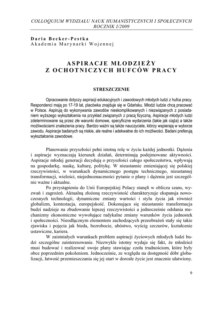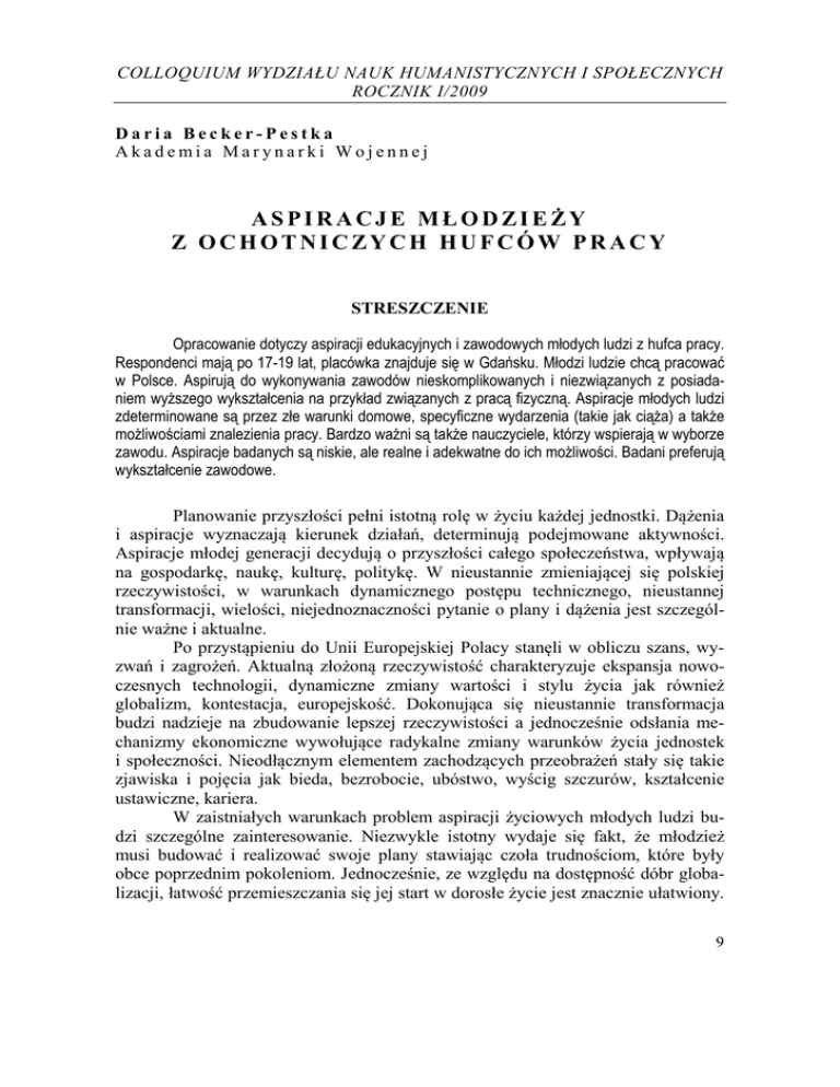 COLLOQUIUM WYDZIAŁU NAUK HUMANISTYCZNYCH I SPOŁECZNYCH ROCZNIK I/2009 Daria Becker-Pestka Akademia Marynarki Wojennej ASPIRACJE MŁODZIEŻY Z OCHOTNICZYCH HUFCÓW PRACY STRESZCZENIE Opracowanie dotyczy aspiracji edukacyjnych i zawodowych młodych ludzi z hufca pracy. Respondenci mają po 17-19 lat, placówka znajduje się w Gdańsku. Młodzi ludzie chcą pracować w Polsce. Aspirują do wykonywania zawodów nieskomplikowanych i niezwiązanych z posiadaniem wyższego wykształcenia na przykład związanych z pracą fizyczną. Aspiracje młodych ludzi zdeterminowane są przez złe warunki domowe, specyficzne wydarzenia (takie jak ciąża) a także możliwościami znalezienia pracy. Bardzo ważni są także nauczyciele, którzy wspierają w wyborze zawodu. Aspiracje badanych są niskie, ale realne i adekwatne do ich możliwości. Badani preferują wykształcenie zawodowe. Planowanie przyszłości pełni istotną rolę w życiu każdej jednostki. Dążenia i aspiracje wyznaczają kierunek działań, determinują podejmowane aktywności. Aspiracje młodej generacji decydują o przyszłości całego społeczeństwa, wpływają na gospodarkę, naukę, kulturę, politykę. W nieustannie zmieniającej się polskiej rzeczywistości, w warunkach dynamicznego postępu technicznego, nieustannej transformacji, wielości, niejednoznaczności pytanie o plany i dążenia jest szczególnie ważne i aktualne. Po przystąpieniu do Unii Europejskiej Polacy stanęli w obliczu szans, wyzwań i zagrożeń. Aktualną złożoną rzeczywistość charakteryzuje ekspansja nowoczesnych technologii, dynamiczne zmiany wartości i stylu życia jak również globalizm, kontestacja, europejskość. Dokonująca się nieustannie transformacja budzi nadzieje na zbudowanie lepszej rzeczywistości a jednocześnie odsłania mechanizmy ekonomiczne wywołujące radykalne zmiany warunków życia jednostek i społeczności. Nieodłącznym elementem zachodzących przeobrażeń stały się takie zjawiska i pojęcia jak bieda, bezrobocie, ubóstwo, wyścig szczurów, kształcenie ustawiczne, kariera. W zaistniałych warunkach problem aspiracji życiowych młodych ludzi budzi szczególne zainteresowanie. Niezwykle istotny wydaje się fakt, że młodzież musi budować i realizować swoje plany stawiając czoła trudnościom, które były obce poprzednim pokoleniom. Jednocześnie, ze względu na dostępność dóbr globalizacji, łatwość przemieszczania się jej start w dorosłe życie jest znacznie ułatwiony. 9 Daria Becker-Pestka Aspiracje młodej generacji decydują o przyszłości całego społeczeństwa, wpływają na gospodarkę, kulturę, postęp techniczny, naukę, politykę. Aspiracje młodych ludzi znajdują się w obszarze zainteresowań przedstawicieli wielu dyscyplin naukowych z uwagi na to, że od ich realizacji zależeć będzie kształt państwa, Europy, świata kiedyś w przyszłości jak również z uwagi na fakt, że działania edukacyjne winny być dostosowane do realnych potrzeb i planów młodzieży. Problematykę aspiracji charakteryzuje ogromna złożoność i korelacje z wieloma dziedzinami wiedzy i doświadczenia. U podstaw aspiracji leży poszukiwanie odpowiedzi na pytanie o to, co stanowi siłę napędową, motywację ukierunkowanych na przyszłość ludzkich działań. Psychologa interesuje stan swoistego nasilenia aspiracji i ich zmienności w nasileniu, niezależnie od tego, jakiego rodzaju obiekty są ich przedmiotem1. Socjologowie analizują hierarchię celów i wartości, które stanowią fundament ludzkich dążeń. Zdaniem badaczy przedmiotem zainteresowań socjologów są nie tylko same aspiracje, lecz również źródła ich powstawania i skutki określonych aspiracji ludności dla procesu kształtowania się struktury społecznej i zmian funkcjonowania społeczeństwa2. Pedagodzy posługują się najczęściej ogólnymi definicjami encyklopedycznymi lub definicjami o charakterze socjologicznym, które odwołują się do uznawanych hierarchii celów i wartości. Za komplementarną uważana jest definicja, w której aspiracje definiowane są jako kategoria potrzeb świadomych, odnoszących się do przedmiotów i wartości aktualnie nie posiadanych lub takich, które wymagają stałego odnawiania a są uznawane za godne pożądania3. Ja przyjęłam, że aspiracje to dążenia człowieka do określonego celu, który uważany jest za cenny i wartościowy. Badacze podejmujący problematykę aspiracji wyróżnili aspiracje dotyczące nauki szkolnej różnych treści i poziomów kształcenia, odmiennych dróg edukacyjnych, aspiracje odnoszące się do zawodu czy pracy zawodowej, aspiracje związane z życiem osobistym, zwłaszcza z życiem rodzinnym, aspiracje dotyczące spraw materialnych, aspiracje kulturalne, społeczne, polityczne, przywódcze, moralne i ludyczne4. Aspiracje ujawniają się i formułują pod wpływem wielu czynników, które często nie są przez jednostkę uświadomione. Badacze uważają, że perspektywy życiowe jednostki są określone przez warunki obiektywne społeczeństwa (poziom rozwoju gospodarczego kraju, ustrój społeczny, mobilność pozioma i pionowa itp.), 1 A. Janowski, Aspiracje młodzieży szkół średnich, PWN, Warszawa 1977, s. 16. M. Ścisłowicz, Aspiracje edukacyjne rodziców a osiągnięcia szkolne ich dzieci, Wyd. WSP, Kielce 1994, s. 12. 3 A. Kłoskowska, Wartości, potrzeby i aspiracje kulturalne małej społeczności miejskiej, [w:] „Studia Socjologiczne”, 1970, nr 3. 4 T. Lewowicki, Aspiracje dzieci i młodzieży, PWN, Warszawa 1987, s. 25. 2 10 COLLOQUIUM WNHiS Aspiracje młodzieży z ochotniczych hufców pracy jak i przez właściwości i warunki indywidualne (zdolności, aspiracje i motywy, system wartości, środowisko społeczno-kulturowe, sytuacja rodzinna i materialna itp.) jednostki5. Podejmujący problematykę aspiracji badacze w sposób szczególny akcentują rolę rodziny w formowaniu się życiowych planów i dążeń jednostki6. Dla 