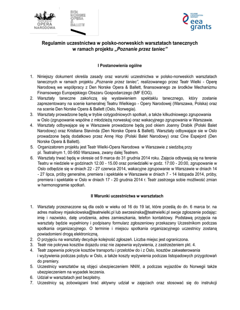 Regulamin uczestnictwa w polsko-norweskich warsztatach tanecznych w ramach projektu „Poznanie przez taniec” I Postanowienia ogólne 1. Niniejszy dokument określa zasady oraz warunki uczestnictwa w polsko-norweskich warsztatach tanecznych w ramach projektu „Poznanie przez taniec”, realizowanego przez Teatr Wielki - Operę Narodową we współpracy z Den Norske Opera & Ballett, finansowanego ze środków Mechanizmu Finansowego Europejskiego Obszaru Gospodarczego (MF EOG). 2. Warsztaty taneczne zakończą się wystawieniem spektaklu tanecznego, który zostanie zaprezentowany na scenie kameralnej Teatru Wielkiego - Opery Narodowej (Warszawa, Polska) oraz na scenie Den Norske Opera & Ballett (Oslo, Norwegia). 3. Warsztaty prowadzone będą w trybie cotygodniowych spotkań, a także kilkudniowego zgrupowania w Oslo (zgrupowanie wspólne z młodzieżą norweską) oraz wakacyjnego zgrupowania w Warszawie. 4. Warsztaty odbywające się w Warszawie prowadzone będą pod okiem Joanny Drabik (Polski Balet Narodowy) oraz Kristiana Støvinda (Den Norske Opera & Ballett). Warsztaty odbywające sie w Oslo prowadzone będą dodatkowo przez Annę Hop (Polski Balet Narodowy) oraz Cine Espejord (Den Norske Opera & Ballett). 5. Organizatorem projektu jest Teatr Wielki-Opera Narodowa w Warszawie z siedzibą przy pl. Teatralnym 1, 00-950 Warszawa, zwany dalej Teatrem. 6. Warsztaty trwać będą w okresie od 9 marca do 31 grudnia 2014 roku. Zajęcia odbywają się na terenie Teatru w niedziele w godzinach 12.00 - 15.00 oraz poniedziałki w godz. 17:00 - 20:00, zgrupowanie w Oslo odbędzie się w dniach 22 - 27 czerwca 2014, wakacyjne zgrupowanie w Warszawie w dniach 14 - 27 lipca, próby generalne, premiera i spektakle w Warszawie w dniach 7 - 14 listopada 2014, próby, premiera i spektakle w Oslo w dniach 17 - 20 grudnia 2014 r. Teatr zastrzega sobie możliwość zmian w harmonogramie spotkań. II Warunki uczestnictwa w warsztatach 1. Warsztaty przeznaczone są dla osób w wieku od 16 do 19 lat, które prześlą do dn. 6 marca br. na adres mailowy [email protected] lub [email protected] swoje zgłoszenie podając: imię i nazwisko, datę urodzenia, adres zamieszkania, telefon kontaktowy. Podstawą przyjęcia na warsztaty będzie wypełniony i podpisany formularz zgłoszeniowy przekazany Uczestnikom podczas spotkania organizacyjnego. O terminie i miejscu spotkania organizacyjnego uczestnicy zostaną powiadomieni drogą elektroniczną. 2. O przyjęciu na warsztaty decyduje kolejność zgłoszeń. Liczba miejsc jest ograniczona. 3. Teatr nie pokrywa kosztów dojazdu oraz nie zapewnia wyżywienia, z zastrzeżeniem pkt. 4. 4. Teatr zapewnia pokrycie kosztów transportu i przelotów do i z Oslo, kosztów zakwaterowania i wyżywienia podczas pobytu w Oslo, a także koszty wyżywienia podczas listopadowych przygotowań do premiery. 5. Uczestnicy warsztatów są objęci ubezpieczeniem NNW, a podczas wyjazdów do Norwegii także ubezpieczeniem na wypadek leczenia. 6. Udział w warsztatach jest bezpłatny. 7. Uczestnicy są zobowiązani brać aktywny udział w zajęciach oraz stosować się do instrukcji prowadzących. Udział w czterech pierwszych zajęciach należy traktować jako okres próbny, po którym uczestnik podejmuje decyzję o pozostaniu w projekcie bądź o rezygnacji. Teatr zastrzega sobie prawo wyboru ostatecznej grupy Uczestników. W przypadku kontynuacji udziału w zajęciach po okresie próbnym, trzecia nieobecność na zajęciach będzie traktowana jako rezygnacja z udziału w warsztatach, a Uczestnik zostanie obciążony karą w wysokości 1500 zł (z wyłączeniem zdarzeń losowych). 8. Deklarując na formularzu zgłoszeniowym zgodę na uczestnictwo w warsztatach Uczestnik i ustawowy opiekun akceptuje niniejszy Regulamin. III Wykorzystanie materiałów 1. Uczestnicy przenoszą na Teatr wszelkie prawa pokrewne do nieograniczonego w czasie i przestrzeni, w kraju i za granicą, korzystania i rozporządzania w całości lub we fragmentach artystycznymi wykonaniami Uczestników lub dowolnymi sekwencjami ruchu z udziałem Uczestników oraz głosu Uczestników podczas warsztatów, prób, premier oraz w spektaklach. 2. Przeniesienie praw następuje na cały czas ich trwania i Teatr ma prawo przenoszenia nabytych praw na osoby trzecie. 3. Przeniesienie obejmuje następujące pola eksploatacji: 1. wystawienie spektaklu z artystycznym wykonaniem Uczestników, 2. utrwalenie- rejestrację audiowizualną lub/i audialną warsztatów, prób, premier oraz spektakli z artystycznym wykonaniem Uczestników na dowolnym nośniku materialnym wraz z prawem do wielokrotnego nadawania zarejestrowanych artystycznych wykonań Uczestników we fragmentach za pomocą wizji lub fonii przewodowej lub bezprzewodowej przez stacje naziemne oraz za pośrednictwem satelity w tym transmisja na żywo, reemisja równoczesna i integralna przez stacje telewizyjne,w tym dla celów reklamy i promocji Teatru lub projektu, 3. publiczne odtwarzanie lub wyświetlanie, 4. umieszczenia zarejestrowanych artystycznych wykonań Uczestników na nośnikach audiowizualnych lub audialnych w zbiorach archiwalnych podmiotu dokonującego rejestracji oraz wykorzystywania poprzez nadanie fragmentów tych wykonań w programach monograficznych, kronikarskich i edukacyjnych, 5. prawo do zwielokrotnienia zarejestrowanego materiału z artystycznym wykonaniem Uczestników w nieograniczonej ilości, w dowolnej formie, w tym audiowizualnej, audialnej w każdym systemie, standardzie i formacie, na każdym nośniku, w tym w technice elektronicznej, cyfrowej, komputerowej oraz na kasetach, CD, DVD, 6. wprowadzenie do obrotu nośników z artystycznym wykonaniem Uczestników w nieograniczonej ilości nakładu, 7. użyczenie i najem nośników, 8. w zakresie rozpowszechniania wykonania i jego egzemplarzy w sposób inny niż mowa powyżej – nadawania, reemitowania oraz odtwarzania, także w miejscach dostępnych za opłatą wstępu, wyświetlania, a także publiczne