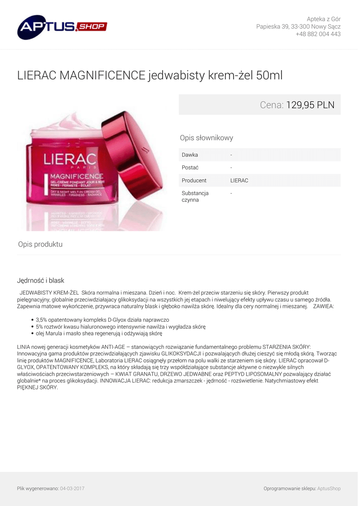 Apteka z Gór Papieska 39, 33-300 Nowy Sącz +48 882 004 443 LIERAC MAGNIFICENCE jedwabisty krem-żel 50ml Cena: 129,95 PLN Opis słownikowy Dawka - Postać - Producent LIERAC Substancja czynna - Opis produktu Jędrność i blask JEDWABISTY KREM-ŻEL Skóra normalna i mieszana. Dzień i noc. Krem-żel przeciw starzeniu się skóry. Pierwszy produkt pielęgnacyjny, globalnie przeciwdziałajacy glikoksydacji na wszystkich jej etapach i niwelujący efekty upływu czasu u samego źródła. Zapewnia matowe wykończenie, przywraca naturalny blask i głęboko nawilża skórę. Idealny dla cery normalnej i mieszanej. ZAWIEA: 3,5% opatentowany kompleks D-Glyox działa naprawczo 5% roztwór kwasu hialuronowego intensywnie nawilża i wygładza skórę olej Marula i masło shea regenerują i odżywiają skórę LINIA nowej generacji kosmetyków ANTI-AGE – stanowiących rozwiązanie fundamentalnego problemu STARZENIA SKÓRY: Innowacyjna gama produktów przeciwdziałających zjawisku GLIKOKSYDACJI i pozwalających dłużej cieszyć się młodą skórą. Tworząc linię produktów MAGNIFICENCE, Laboratoria LIERAC osiągnęły przełom na polu walki ze starzeniem się skóry. LIERAC opracował DGLYOX, OPATENTOWANY KOMPLEKS, na który składają się trzy współdziałające substancje aktywne o niezwykle silnych właściwościach przeciwstarzeniowych – KWIAT GRANATU, DRZEWO JEDWABNE oraz PEPTYD LIPOSOMALNY pozwalający działać globalnie* na proces glikoksydacji. INNOWACJA LIERAC: redukcja zmarszczek - jędrność - rozświetlenie. Natychmiastowy efekt PIĘKNEJ SKÓRY. Plik wygenerowano: 04-03-2017 Oprogramowanie sklepu: AptusShop Apteka z Gór Papieska 39, 33-300 Nowy Sącz +48 882 004 443 Plik wygenerowano: 04-03-2017 Powered by TCPDF (www.tcpdf.org) Oprogramowanie sklepu: AptusShop