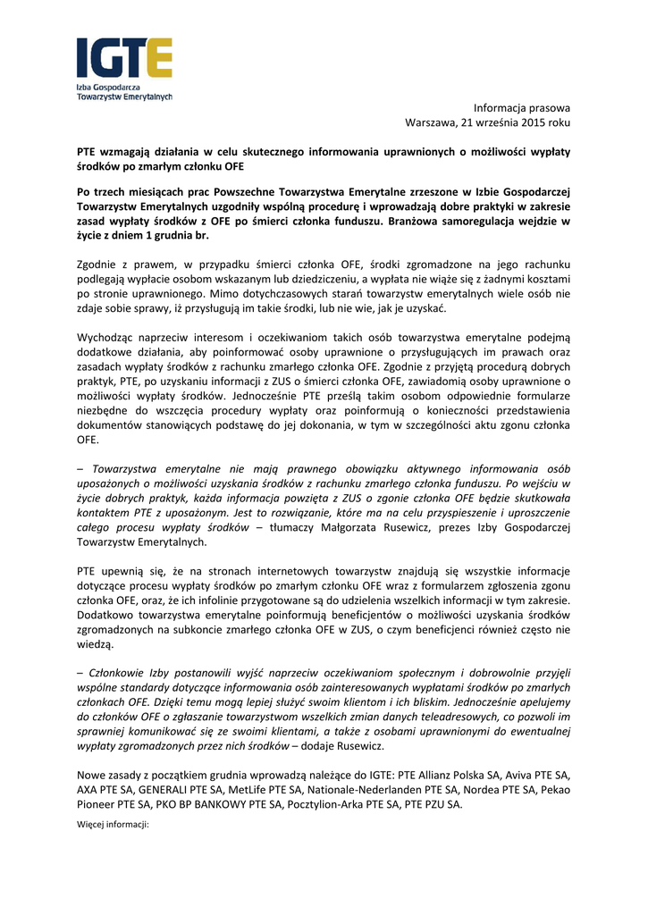Informacja prasowa Warszawa, 21 września 2015 roku PTE wzmagają działania w celu skutecznego informowania uprawnionych o możliwości wypłaty środków po zmarłym członku OFE Po trzech miesiącach prac Powszechne Towarzystwa Emerytalne zrzeszone w Izbie Gospodarczej Towarzystw Emerytalnych uzgodniły wspólną procedurę i wprowadzają dobre praktyki w zakresie zasad wypłaty środków z OFE po śmierci członka funduszu. Branżowa samoregulacja wejdzie w życie z dniem 1 grudnia br. Zgodnie z prawem, w przypadku śmierci członka OFE, środki zgromadzone na jego rachunku podlegają wypłacie osobom wskazanym lub dziedziczeniu, a wypłata nie wiąże się z żadnymi kosztami po stronie uprawnionego. Mimo dotychczasowych starań towarzystw emerytalnych wiele osób nie zdaje sobie sprawy, iż przysługują im takie środki, lub nie wie, jak je uzyskać. Wychodząc naprzeciw interesom i oczekiwaniom takich osób towarzystwa emerytalne podejmą dodatkowe działania, aby poinformować osoby uprawnione o przysługujących im prawach oraz zasadach wypłaty środków z rachunku zmarłego członka OFE. Zgodnie z przyjętą procedurą dobrych praktyk, PTE, po uzyskaniu informacji z ZUS o śmierci członka OFE, zawiadomią osoby uprawnione o możliwości wypłaty środków. Jednocześnie PTE prześlą takim osobom odpowiednie formularze niezbędne do wszczęcia procedury wypłaty oraz poinformują o konieczności przedstawienia dokumentów stanowiących podstawę do jej dokonania, w tym w szczególności aktu zgonu członka OFE. – Towarzystwa emerytalne nie mają prawnego obowiązku aktywnego informowania osób uposażonych o możliwości uzyskania środków z rachunku zmarłego członka funduszu. Po wejściu w życie dobrych praktyk, każda informacja powzięta z ZUS o zgonie członka OFE będzie skutkowała kontaktem PTE z uposażonym. Jest to rozwiązanie, które ma na celu przyspieszenie i uproszczenie całego procesu wypłaty środków – tłumaczy Małgorzata Rusewicz, prezes Izby Gospodarczej Towarzystw Emerytalnych. PTE upewnią się, że na stronach internetowych towarzystw znajdują się wszystkie informacje dotyczące procesu wypłaty środków po zmarłym członku OFE wraz z formularzem zgłoszenia zgonu członka OFE, oraz, że ich infolinie przygotowane są do udzielenia wszelkich informacji w tym zakresie. Dodatkowo towarzystwa emerytalne poinformują beneficjentów o możliwości uzyskania środków zgromadzonych na subkoncie zmarłego członka OFE w ZUS, o czym beneficjenci również często nie wiedzą. – Członkowie Izby postanowili wyjść naprzeciw oczekiwaniom społecznym i dobrowolnie przyjęli wspólne standardy dotyczące informowania osób zainteresowanych wypłatami środków po zmarłych członkach OFE. Dzięki temu mogą lepiej służyć swoim klientom i ich bliskim. Jednocześnie apelujemy do członków OFE o zgłaszanie towarzystwom wszelkich zmian danych teleadresowych, co pozwoli im sprawniej komunikować się ze swoimi klientami, a także z osobami uprawnionymi do ewentualnej wypłaty zgromadzonych przez nich środków – dodaje Rusewicz. Nowe zasady z początkiem grudnia wprowadzą należące do IGTE: PTE Allianz Polska SA, Aviva PTE SA, AXA PTE SA, GENERALI PTE SA, MetLife PTE SA, Nationale-Nederlanden PTE SA, Nordea PTE SA, Pekao Pioneer PTE SA, PKO BP BANKOWY PTE SA, Pocztylion-Arka PTE SA, PTE PZU SA. Więcej informacji: Izba Gospodarcza Towarzystw Emerytalnych Filip Pietkiewicz-Bednarek PR manager tel. 22 629 09 27 email: [email protected]