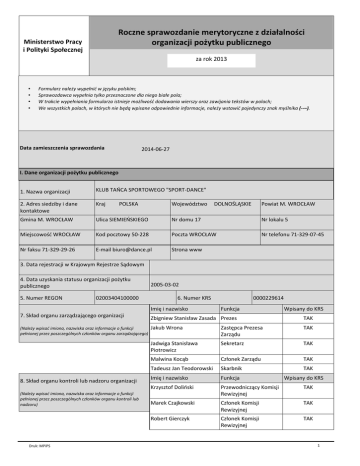 ZŽĐnjŶĞƐƉƌĂǁŽnjĚĂŶŝĞŵĞƌLJƚŽƌLJĐnjŶĞnjĚnjŝĂųĂůŶŽƑĐŝ ŽƌŐĂŶŝnjĂĐũŝƉŽǏLJƚŬƵƉƵďůŝĐnjŶĞŐŽ Ministerstwo Pracy ŝWŽůŝƚLJŬŝ^ƉŽųĞĐnjŶĞũ za rok 2013 • • • • &ŽƌŵƵůĂƌnjŶĂůĞǏLJǁLJƉĞųŶŝđǁũħnjLJŬƵƉŽůƐŬŝŵ͖ ^ƉƌĂǁŽnjĚĂǁĐĂǁLJƉĞųŶŝĂƚLJůŬŽƉƌnjĞnjŶĂĐnjŽŶĞĚůĂŶŝĞŐŽďŝĂųĞƉŽůĂ͖ tƚƌĂŬĐŝĞǁLJƉĞųŶŝĂŶŝĂĨŽƌŵƵůĂƌnjĂŝƐƚŶŝĞũĞŵŽǏůŝǁŽƑđĚŽĚĂǁĂŶŝĂǁŝĞƌƐnjLJŽƌĂnjnjĂǁŝũĂŶŝĂƚĞŬƐƚſǁǁƉŽůĂĐŚ͖ tĞǁƐnjLJƐƚŬŝĐŚƉŽůĂĐŚ͕ǁŬƚſƌLJĐŚŶŝĞďħĚČǁƉŝƐĂŶĞŽĚƉŽǁŝĞĚŶŝĞŝŶĨŽƌŵĂĐũĞ͕ŶĂůĞǏLJǁƐƚĂǁŝđƉŽũĞĚLJŶĐnjLJnjŶĂŬŵLJƑůŶŝŬĂ (--–). Data zamieszczenia sprawozdania 2014-06-27 /͘ĂŶĞŽƌŐĂŶŝnjĂĐũŝƉŽǏLJƚŬƵƉƵďůŝĐnjŶĞŐŽ 1. Nazwa organizacji <>hdF^WKZdKt'KΗ^WKZdͲEΗ 2. Adres siedziby i dane kontaktowe Kraj 'ŵŝŶĂD͘tZKBt POLSKA tŽũĞǁſĚnjƚǁŽK>EK_>^</ WŽǁŝĂƚD͘tZKBt hůŝĐĂ^/D/F^</'K Nr domu 17 Nr lokalu 5 DŝĞũƐĐŽǁŽƑđtZKBt Kod pocztowy 50-228 WŽĐnjƚĂtZKBt Nr telefonu 71-329-07-45 Nr faksu 71-329-29-26 E-mail [email protected] Strona www ϯ͘ĂƚĂƌĞũĞƐƚƌĂĐũŝǁ<ƌĂũŽǁLJŵZĞũĞƐƚƌnjĞ^ČĚŽǁLJŵ ϰ͘ĂƚĂƵnjLJƐŬĂŶŝĂƐƚĂƚƵƐƵŽƌŐĂŶŝnjĂĐũŝƉŽǏLJƚŬƵ publicznego 5. Numer REGON 02003404100000 2005-03-02 6. Numer KRS /ŵŝħŝŶĂnjǁŝƐŬŽ ϳ͘^ŬųĂĚŽƌŐĂŶƵnjĂƌnjČĚnjĂũČĐĞŐŽŽƌŐĂŶŝnjĂĐũŝ ;EĂůĞǏLJǁƉŝƐĂđŝŵŝŽŶĂ͕ŶĂnjǁŝƐŬĂŽƌĂnjŝŶĨŽƌŵĂĐũĞŽĨƵŶŬĐũŝ ƉĞųŶŝŽŶĞũƉƌnjĞnjƉŽƐnjĐnjĞŐſůŶLJĐŚĐnjųŽŶŬſǁŽƌŐĂŶƵnjĂƌnjČĚnjĂũČĐĞŐŽͿ ϴ͘^ŬųĂĚŽƌŐĂŶƵŬŽŶƚƌŽůŝůƵďŶĂĚnjŽƌƵŽƌŐĂŶŝnjĂĐũŝ ;EĂůĞǏLJǁƉŝƐĂđŝŵŝŽŶĂ͕ŶĂnjǁŝƐŬĂŽƌĂnjŝŶĨŽƌŵĂĐũĞŽĨƵŶŬĐũŝ ƉĞųŶŝŽŶĞũƉƌnjĞnjƉŽƐnjĐnjĞŐſůŶLJĐŚĐnjųŽŶŬſǁŽƌŐĂŶƵŬŽŶƚƌŽůŝůƵď nadzoru) Druk: MPiPS 0000229614 Funkcja Wpisany do KRS ďŝŐŶŝĞǁ^ƚĂŶŝƐųĂǁĂƐĂĚĂ Prezes TAK Jakub Wrona ĂƐƚħƉĐĂWƌĞnjĞƐĂ ĂƌnjČĚƵ TAK :ĂĚǁŝŐĂ^ƚĂŶŝƐųĂǁĂ Piotrowicz Sekretarz TAK DĂůǁŝŶĂ<ŽĐČď njųŽŶĞŬĂƌnjČĚƵ TAK Tadeusz Jan Teodorowski Skarbnik TAK /ŵŝħŝŶĂnjǁŝƐŬŽ Funkcja <ƌnjLJƐnjƚŽĨŽůŝŷƐŬŝ WƌnjĞǁŽĚŶŝĐnjČĐLJ<ŽŵŝƐũŝ Rewizyjnej TAK Marek Czajkowski njųŽŶĞŬ<ŽŵŝƐũŝ Rewizyjnej TAK Robert Gierczyk njųŽŶĞŬ<ŽŵŝƐũŝ Rewizyjnej TAK Wpisany do KRS 1 9. Cele statutowe organizacji ;EĂůĞǏLJŽƉŝƐĂđĐĞůĞŶĂƉŽĚƐƚĂǁŝĞƐƚĂƚƵƚƵŽƌŐĂŶŝnjĂĐũŝͿ 1͘WZKtE//B>EK_/EZZKtK:h<h>dhZz͕^dh</͕ OCHRONY DÓBR KULTURY I TRADYCJI. 2. UPOWSZECHNIANIE KULTURY I SPORTU. 3͘ZKtM:dF^WKZdKt'KEK>EzD_>^<h͘ 4͘Z>/:>MttZdz,t^dZd'//ZKtK:htZKBt/ /K>E'K_>^<t<Z^/^WKZdh͕K_t/dz͕tz,KtE// ZDROWIA. 5͘/BE/EZ/Ed'Z:/hZKW:^</:KZZKt/:E/ <KEd<dMt/t^WMBWZzD/%z^WKBEK_/D/͘ 6͘WKdZzDztE/dZz:/EZKKt:͕W/>%'EKtE/ WK>^<K_/KZZKtK:h_t/KDK_/EZKKt:͕ OBYWATELSKIEJ, KULTUROWEJ. 7͘K,ZKE/WZKDK:ZKt/KZ/BE/EZK^M E/WBEK^WZtEz,͘ 8͘KZ'E/KtE/tzWKzE<h///DBK/z͘ 9͘WK:DKtE//BFt^WKD':z,ZKtM:t^WM>EKd/ ^WKBEK_/>K<>Ez,͘ 10͘WZ/t/BE/WdK>K'/KD^WKBEzD͘ 11. NAUKA, EDUKACJA I WYCHOWANIE. 1. ORGANIZOWANIE I PROWADZENIE SEKCJI SPORTOWYCH I KULTURALNYCH. 2. ORGANIZOWANIE ZAWODÓW I IMPREZ SPORTOWYCH ORAZ 10. Sposób realizacji celów statutowych organizacji UCZESTNICZENIE IMPREZACH INNYCH ORGANIZACJI O CHARAKTERZE >K<>EzD͕K'M>EKWK>^</D/D/%zEZKKtzD͘ ;EĂůĞǏLJŽƉŝƐĂđƐƉŽƐſďƌĞĂůŝnjĂĐũŝĐĞůſǁƐƚĂƚƵƚŽǁLJĐŚŽƌŐĂŶŝnjĂĐũŝŶĂ 3͘KZ'E/KtE//WZKtE/^<K>FKZ^D/EZ/Mt> E/DdKZMtz/^WKZdKt'K͘ podstawie statutu organizacji) 4͘WZKtE//B>EK_/'K^WKZ:͕WtE/:: _ZK</&/EE^KtEWKdZz^ddhdKt͘ 5͘t^WMBWZ%KZ'ED/^DKZKtzD/͕W>Mt<D/ K_t/dKtzD/͕/E^dzdh:D/^WKBEzD//^dKtZz^E/D/ hzdEK_/Wh>/E:t>hZ>/:/>Mt^ddhdKtz,͘ 6͘WZK'ZDKtE//Z>/:%/B>EK_/t<Z^/ <dzt/:/E/WBEK^WZtEz,tK^ZK<Z_>KEzD ^ddhdD<>hhWZzt^WMBWZz/E^dzdh:D//KZ'E/:D/ /EdZ^KtEzD/d/B>EK_/͘ 7͘h^dE/dtKtz/hD/^d/Z'/KEh͘ 8͘WK:DKtE//EEz,WZ^/%t/%^Bhz,Z>/:/ CELÓW STATUTOWYCH. 6. //͘ŚĂƌĂŬƚĞƌLJƐƚLJŬĂĚnjŝĂųĂůŶŽƑĐŝŽƌŐĂŶŝnjĂĐũŝƉŽǏLJƚŬƵƉƵďůŝĐnjŶĞŐŽǁŽŬƌĞƐŝĞƐƉƌĂǁŽnjĚĂǁĐnjLJŵ ϭ͘KƉŝƐĚnjŝĂųĂůŶŽƑĐŝƉŽǏLJƚŬƵƉƵďůŝĐnjŶĞŐŽ ϭ͘ϭ͘KƉŝƐŐųſǁŶLJĐŚ ĚnjŝĂųĂŷƉŽĚũħƚLJĐŚ ƉƌnjĞnjŽƌŐĂŶŝnjĂĐũħ Druk: MPiPS 2 <>hdF^WKZdKt'KΗ^WKZdͲEΗtBzB^/%tKZ'E/:%/DWZ^WKZdKtz, KZ'E/KtEz,EdZE/D/^dtZKBt//K>E'K_>^<KZ<>/^/ t/><KWK>^</͘zEE/h^dE/zBtKZ'E/:/tz:MtZWZEd:/WK>^</E D/^dZK^dt_t/d/hZKWzKZdhZE/:Mt<Z:Ktz,tdFhEKtK^EzD͘ ORGANIZACJA IMPREZ: 1͘tzWKzE</DKtz>///DBK/zΗ/DtD/_/2013" 2. WYPOCZYNEK LETNI - ORGANIZACJA WYJAZDU TANCERZY DO CHORWACJI 3.VIII TANECZNA GALA PRZEDSZKOLAKA 4. XXX OTWARTE MISTRZOSTWA POLSKI FREESTYLE 2013 5͘yyys///<D/</D/^dZK^dtWK>^</tdFhdKtZz^</D 6͘/yD/^dZK^dtWK>^<///^dZ^z,tdFhdKtZz^</D 7. KM IDO 2013 TARNOWO PODGÓRNE W 2013Z<>hh^dE/zBtE/KWBdEz,WK<,EZ^WKBEK_/>K<>Ez,͘ BKE<Kt/<>hhWZEdKt>/^tK:hD/:%dEK_/WK^<KEZdhtK>_E/z K<:/<KFE/ZK<h^<K>E'KKZ&/EBht/></:KZ</^dZz_t/dE:WKDKz͘ <>hzEE/tBzB^/%t^<K>E/WZz'KdKttKZKZ'E/:%tz:Mt// /DBK/zEdhZE/:<Z:Kt/'ZE/E͘E:tE/:^z,E>ztzD/E/͗ WYDARZENIA W KRAJU: - 2013.02.16 - KM IDO NYSA 2013; 2013.03.16-17 - KM IDO SZCZECIN 2013; 2013.04.05-07 - KM IDO TARNOWO PODGÓRNE; 2013.04.19-21 - KM IDO GRÓJEC 2013; 2013.06.22-23 - KM IDO SIEDLCE; 2013.11.16-17 - XX OTWARTE MISTRZOSTWA POLSKI FREESTYLE. dhZE/:K'M>EKWK>^</͗dZEKtKWK'MZE͕BM͕W/KdZ<MtdZzhE>^</͕dZK'MZ͕ :tKZ͕'F͕WZD/ZKtK͕_ZKt/><KWK>^<͕Ez^͕K>_E/͘ WYDARZENIA W EUROPIE: - 2013.05.24-26Ͳ/>>ͬtBK,zͲ/KhZKWE,DW/KE^,/W^2013 IN MODERNAND JAZZ DANCE; 2013.06.16-13 - AMSTERDAM/HOLANDIA - IDO EUROPEAN HIP HOP CHAMPIONSHIP 2013; 2013.10.20-16 - IDO WORLD HIP HOP, ELECTRIC BOOGIE AND BREAK DANCE CHAMPIONSHIPS 2013; 201