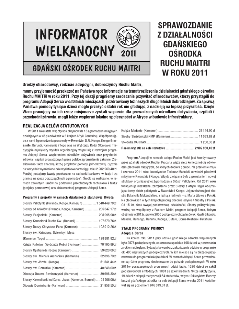 SPRAWOZDANIE Z DZIA£ALNOCI GDAÑSKIEGO ORODKA RUCHU MAITRI W ROKU 2011 Drodzy ofiarodawcy, rodzicie adopcyjni, dobroczyñcy Ruchu Maitri, mamy przyjemnoæ przekazaæ na Pañstwa rêce informacje na temat rozliczenia dzia³alnoci gdañskiego orodka Ruchu MAITRI w roku 2011. Przy tej okazji pragniemy serdecznie przywitaæ ofiarodawców, którzy przyst¹pili do programu Adopcji Serca w ostatnich miesi¹cach, pozdrawiamy te¿ naszych d³ugoletnich dobrodziejów. Za spraw¹ Pañstwa pomocy tysi¹ce dzieci mog³o prze¿yæ ostatni rok nie g³oduj¹c, z nadziej¹ na lepsz¹ przysz³oæ. Dziêki Wam pracuj¹cy na ich rzecz misjonarze zyskali wsparcie dla prowadzonych orodków do¿ywiania, szpitali i przychodni zdrowia, mogli tak¿e wspieraæ lokalne spo³ecznoci w Afryce w budowie infrastruktury. REALIZACJA CELÓW STATUTOWYCH W 2011 roku sta³a wspó³praca obejmowa³a 18 zgromadzeñ misyjnych dzia³aj¹cych w 45 placówkach w 6 krajach Afryki Centralnej. Wspó³pracuj¹ce z nami Zgromadzenia pracowa³y w Rwandzie, D.R. Kongo, Kongo-Brazzaville, Burundi, Kamerunie i Togo oraz na Wybrze¿u Koci S³oniowej. Tradycyjnie najwiêkszy wysi³ek organizacyjny wi¹za³ siê z rozwojem programu Adopcji Serca, wspieraniem orodków do¿ywiania oraz przychodni zdrowia i szpitali prowadzonych przez polskie zgromadzenia zakonne. Zrealizowano tak¿e znaczn¹ liczbê projektów pomocy jednorazowej. £¹cznie na wszystkie wymienione cele wydatkowano w ci¹gu roku 2.902.960,40 z³. Poni¿ej podajemy kwoty przekazane na rachunki bankowe w kraju i za granic¹ na rzecz poszczególnych zgromadzeñ. rodki s¹ rozliczane, w ramach zawartych umów na podstawie przed³o¿onych rachunków i faktur (projekty pomocowe) oraz dokumentacji programu Adopcji Serca. Programy i projekty w ramach dzia³alnoci statutowej Kwota Siostry Pallotynki (Rwanda, Kongo, Kamerun) ...............1 548 449,78 z³ Siostry od Anio³ów (Rwanda, Kongo, Kamerun)............... 235 847,17 z³ Siostry Pasjonistki (Kamerun) ........................................ 205 995,90 z³ Siostry Kanoniczki Ducha w. (Burundi) ......................... 197 679,76 z³ Siostry Duszy Chrystusa Pana (Kamerun) ...................... 192 012,26 z³ Siostry w. Katarzyny, Dziewicy i Mêcz. (Kamerun, Togo) ............................................................ 128 881,82 z³ Ksiê¿a Pallotyni (Wybrze¿e Koci S³oniowej) .................... 70 195,89 z³ Siostry Opatrznoci Bo¿ej (Kamerun)................................ 59 620,06 z³ Siostry w. Micha³a Archanio³a (Kamerun) ....................... 52 896,70 z³ Siostry w. Józefa (Kongo) .............................................. 51 541,44 z³ Siostry w. Dominika (Kamerun) ....................................... 40 248,00 z³ Diecezja Doume-Seminarzyci (Kamerun) ........................ 39 696,30 z³ Siostry Karmelitanki od Dziec. Jezus (Kamerun, Burundi) .....24 508,00 z³ Ojcowie Dominikanie (Kamerun) ....................................... 21 958,50 z³ Ksiê¿a Marianie (Kamerun) .............................................. 21 144,90 z³ Siostry S³u¿ebniczki NMP (Kamerun) ................................ 11 083,92 z³ Sto³ówka CARITAS.............................................................. 1 200,00 z³ Razem wydatki na cele statutowe ................................. 2 902 960,40 z³ Program Adopcji w ramach ca³ego Ruchu Maitri jest koordynowany przez gdañski orodek Ruchu. Praca ta wi¹¿e siê z koniecznoci¹ odwiedzin placówek misyjnych, do których dociera pomoc. Na prze³omie maja i czerwca 2011 roku, koordynator Tadeusz Makulski odwiedzi³ placówki misyjne w Rwandzie i Kongo. Wizyta zwi¹zana by³a z powstaniem nowej struktury organizacyjnej Zgromadzenia Sióstr Pallotynek. Od 2011 roku funkcjonuje niezale¿na, zarz¹dzana przez Siostry z Afryki Regia obejmuj¹ca domy sióstr pallotynek w Rwandzie i Kongo. Jej prze³o¿on¹ jest siostra Balancilla Mukandahiro, a jedn¹ z radnych s. Marta Litawa z Polski. Na placówkach w tych krajach pracuj¹ obecnie jedynie 4 Siostry z Polski. Od 15 lat, obok swojej podstawowej dzia³alnoci, Siostry pallotynki prowadz¹, we wspó³pracy z Ruchem Maitri, program Adopcji Serca, którym obejmuje w 2012r. prawie 2000 podopiecznych z placówek: Kigali-Gikondo, Masaka, Ruhango, Ruhuha, Kabuga, Butare, Goma-Keshero i Rutshuru. STA£E PROGRAMY POMOCY Adopcja Serca Na koniec roku 2011 przy udziale gdañskiego orodka wspieranych by³o 2578 podopiecznych, co oznacza spadek o 195 dzieci w porównaniu z rokiem ubieg³ym. Sytuacja ta wynika z zakoñczenia udzia³u w programie ok. 400 najstarszych podopiecznych. W ich miejsce s¹ na bie¿¹co przyjmowane do programu kolejne dzieci. W ramach Adopcji Serca prowadzone s¹ ró¿ne programy dostosowane do potrzeb podopiecznych. W roku 2011w poszczególnych programach udzia³ bra³o: 1320 dzieci ze szkó³ podstawowych i m³odszych, 1081 ze szkó³ rednich, 94 ze szko³y ¿ycia, 19 dzieci z adopcji medycznej i 64 studentów, w tym 19 kleryków. Roczny bud¿et gdañskiego orodka na cele Adopcji Serca w roku 2011 kszta³towa³ siê na poziomie 1 946 019,31 z³. 2 12 Podopieczny (101/10) z misji Rutshuru (Kongo) ), prowadzonej przez W roku 2011 gdañski orodek Maitri wspiera³ tradycyjnie orodki Zgromadzenie Sióstr Pallotynek, otrzyma³ pieni¹dze na remont domu. do¿ywiania prowadzone przez s. Pallotynki w Masaka, Ruhango, Gikondo Projekt op³acony przez rodziców adopcyjnych podopiecznego. Przew Rwandzie. Z uwagi na potrzeby zg³aszane przez misjonarzy wielokrotkazano kwotê 105 $. nie przeznaczono pomoc dla orodków do¿ywiania w Nyakinama (Rwan- 13 Orodek zdrowia w Essengbot (Kamerun) prowadzony przez Zgromada), Rutshuru, Ntamugenga (Kongo), Buraniro (Burundi). Finansowano dzenie Sióstr Opatrznoci Bo¿ej otrzyma³a pieni¹dze na dokoñczenie tak¿e akcje do¿ywiania dzieci w szko³ach, przedszkolach, parafiach w remontów przychodni zdrowia. Przekazano kwotê 2 500 Euro. Atok, Doume, Dimako, Djouth, Ngelemendouka, Es