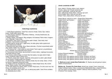 Litania Loretańska do NMP Kyrie, elejson. Chryste, elejson. Kyrie, elejson! Chryste, usłysz nas! Chryste wysłuchaj nas! Ojcze z nieba Boże, zmiłuj się nad nami! Synu, Odkupicielu świata, Boże, zmiłuj się nad nami! Duchu Święty, Boże, zmiłuj się nad nami! Święta Trójco, Jedyny Boże, zmiłuj się nad nami. Ciebie Boga wysławiamy 1. Ciebie Boga wysławiamy, Tobie Panu wieczna chwała. Ciebie, Ojca, niebios bramy, Ciebie wielbi ziemia cała. 2. Tobie wszyscy Aniołowie, Tobie Moce i Niebiosy, Cheruby Serafinowie, ślą wieczystej pieśni głosy. 3. Święty, Święty, nad świętymi, Bóg zastępów, Król łaskawy! Pełne niebo z kręgiem ziemi, Majestatu Twojej sławy. 4. Apostołów Tobie rzesza, Chór proroków pełen chwały, Tobie hołdy nieść pośpiesza, męczenników orszak biały. 5. Ciebie poprzez okrąg ziemi, z głębi serca, ile zdoła, głosy ludów zgodzonymi, wielbi święta pieśń Kościoła. 6. Niezmierzonej Ojca chwały, Syna, Słowo wiekuiste, z Duchem wszechświat wielbi cały, Królem chwały Tyś o Chryste! 7. Tyś Rodzica Syn z wiek wieka, by świat zbawić Twoim zgonem, przyoblókłwszy się w człowieka, nie wzgardziłeś Panny łonem. 8. Tyś poruszył śmierci wrota, starł jej oścień w śmierci dobie, i rajskiego kraj żywota, otworzyłeś wiernym sobie. 9. Po prawicy siedzisz Boga, w chwale Ojca Syn jedyny, lecz gdy zabrzmi trąba sroga, przyjdziesz sądzić ludzkie czyny. 10. Prosimy, słudzy łask niegodni, wspomóż, obmyj grzech co plami, gdyś odkupił nas od zbrodni, Drogiej swojej Krwi strugami. 11. Ze świętymi, w blaskach mocy, wiecznej chwały zlej nam zdroje. Zbaw, o Panie lud sierocy, błogosław dziedzictwo swoje. 12. Rządź je broń po wszystkie lata, prowadź w niebios błogie bramy. My w dzień każdy, Władco świata, Imię Twoje wysławiamy. 13. Po wiek wieków nie ustanie, pieśń, co sławi Twoje czyny. O w dniu onym racz nas Panie, od wszelakiej ustrzec winy. 14. Zjaw swą litość w życiu całym, tym, co żebrzą twej opieki, Tobie Panie zaufałem, nie zawstydzę się na wieki. Str 2 Święta Maryjo, módl się za nami...>Święta Boża Rodzicielko.... Święta Panno nad Pannami…. >Matko Chrystusowa…. Matko Kościoła…. >Matko łaski Bożej…. Matko nieskalana…. >Matko najczystsza…. Matko dziewicza…. >Matko nienaruszona…. Matko najmilsza…. >Matko przedziwna…. Matko dobrej rady…. >Matko Stworzyciela… Matko Zbawiciela…. >Panno roztropna…. Panno czcigodna…. >Panno wsławiona.... Panno można…. >Panno łaskawa.... Panno wierna…. >Zwierciadło sprawiedliwości…. Stolico mądrości…. >Przyczyno naszej radości…. Przybytku Ducha świętego…. >Przybytku chwalebny.... Przybytku sławny pobożności…. >Różo duchowna.... Wieżo Dawidowa…. >Wieżo z kości słoniowej... Domie złoty…. >Arko przymierza.... Bramo niebieska…. >Gwiazdo zaranna.... Uzdrowienie chorych…. >Ucieczko grzesznych Pocieszycielko strapionych…. >Królowo Patriarchów.... Królowo Proroków…. >Królowo Apostołów.... Królowo męczenników…. >Królowo Wyznawców.... Królowo Dziewic…. >Królowo Wszystkich Świętych.... Królowo bez zmazy pierworodnej poczęta.... Królowo wniebowzięta.... Królowo Różańca świętego…. >Królowo Pokoju.... Królowo rodzin…. >Królowo Polski.... Baranku Boży, który gładzisz grzechy świata, przepuść nas Panie! Baranku Boży, który gładzisz grzechy świata, wysłuchaj nas Panie! Baranku Boży, który gładzisz grzechy świata, zmiłuj się nad nami! K. Módl się za nami, święta Boża Rodzicielko. W. Abyśmy się stali godnymi wobec obietnic Chrystusowych. Módlmy się. Prosimy Cię, Panie Boże, dozwól nam, sługom Twoim cieszyć się trwałym zdrowiem duszy i ciała, a za przyczyną Najświętszej Maryi, zawsze Dziewicy, racz nas uwolnić od doczesnych utrapień i obdarzyć wieczną radością. Przez Chrystusa Pana naszego. Amen. Str 3