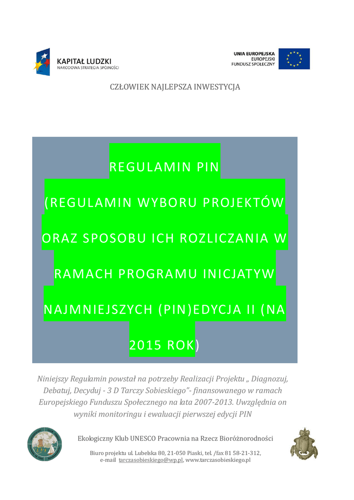 CZŁOWIEK NAJLEPSZA INWESTYCJA REGUL AMIN PIN (REGUL AMIN WYBORU P ROJEKTÓW ORAZ SPOSOBU ICH ROZ LICZANIA W RAMACH PROGRAMU INICJATYW NAJMNIEJSZYCH (PIN )EDYCJA II (NA 2015 ROK) Niniejszy Regulamin powstał na potrzeby Realizacji Projektu „ Diagnozuj, Debatuj, Decyduj - 3 D Tarczy Sobieskiego”- finansowanego w ramach Europejskiego Funduszu Społecznego na lata 2007-2013. Uwzględnia on wyniki monitoringu i ewaluacji pierwszej edycji PIN Ekologiczny Klub UNESCO Pracownia na Rzecz Bioróżnorodności Biuro projektu ul. Lubelska 80, 21-050 Piaski, tel. /fax 81 58-21-312, e-mail [email protected], www.tarczasobieskiego.pl 1. Niniejsze wytyczne określają sposób Realizacji Programu Inicjatyw Najmniejszych ( PIN) realizowanego w ramach projektu „Diagnozuj, Debatuj, Decyduj - 3 D Tarczy Sobieskiego” w II edycji ( 2015 r.) oraz określają główne elementy jakimi charakteryzować się będzie proces wyłaniania i realizacji inicjatyw PIN. 2. Ilekroć w niniejszym dokumencie będzie mowa o Projekcie należy przez to rozumieć projekt „Diagnozuj, Debatuj, Decyduj - 3 D Tarczy Sobieskiego” współfinansowany ze środków Unii Europejskiej w ramach Europejskiego Funduszu Społecznego Programu Operacyjnego Kapitał Ludzki Priorytet V „Dobre rządzenie”, Poddziałanie 5.4.2 „Rozwój dialogu obywatelskiego”, realizowany przez Ekologiczny Klub UNESCO Pracownia na rzecz Bioróżnorodności z siedzibą w Piaskach od 01 stycznia 2014 roku do 30 czerwca 2015 roku, w partnerstwie z gminą Gorzków, gminą Piaski, gminą Spiczyn, Gminą Wólka, oraz Instytutem Adaptacji Kulturowej i Językowej- Katarzyna Sieńko. 3. Ilekroć w niniejszym dokumencie jest mowa o PIN, należy przez to rozumieć Program Inicjatyw Najmniejszych, skierowany do obywateli, mieszkańców Szlaku Jana III Sobieskiego z gmin: Piaski, Mełgiew, Gorzków, Rybczewice, Spiczyn, Wólka. 4. Niniejszy Regulamin określa zasady wsparcia Inicjatyw Najmniejszych w tym zasady zakupów produktów i usług niezbędnych do realizacji Inicjatyw Najmniejszych w edycji na 2015 r. I. ORGANIZATORZY Program Inicjatyw Najmniejszych PIN ( zwany dalej PIN) jest organizowany przez Ekologiczny Klub UNESCO Pracownia na Rzecz Bioróżnorodności z siedzibą w Piaskach (ulica Partyzantów 19, 21-050 Piaski) w ramach projektu „Diagnozuj, Debatuj, Decyduj3 D Tarczy Sobieskiego” realizowanego przez Ekologiczny Klub UNESCO w partnerstwie z: gminą Gorzków, Piaski, Spiczyn, Wólka, oraz Instytutem Adaptacji Kulturowej i Językowej- Katarzyna Sieńko. Program jest współfinansowany ze środków Unii Europejskiej w ramach Europejskiego Funduszu Społecznego Programu Operacyjnego Kapitał Ludzki Priorytet V „Dobre rządzenie”, Działanie 5.4 „Rozwój potencjału trzeciego sektora”, Poddziałanie 5.4.2 „Rozwój dialogu obywatelskiego”. Biuro projektu mieści się w Piaskach (ul. Lubelska 80, 21-050 Piaski). Strona 1 II. BENEFICJENCI 1. Uzyskanie statusu beneficjenta Programu możliwe będzie po wypełnieniu formularzy zgłoszeniowych (i integralnych z nim załączników) podczas procesu rekrutacji oraz po uzyskaniu pozytywnej decyzji komisji rekrutacyjnej. Ostatnim dniem na złożenie dokumentów rekrutacyjnych jest 31.12.2014 r. 2. Beneficjentami edycji PIN na 2015 rok mogą być trzyosobowe grupy mieszkańców Gmin Szlaku Jana III Sobieskiego ( dalej JIIIS) z gmin: Gorzków, Mełgiew, Piaski, Rybczewice, Spiczyn, Wólka, składające się z: a) Osoby/osób pełnoletnie/pełnoletnich (obowiązkowe) b) Osoba/y powyżej 13 roku życia ( za zgodą opiekunów prawnych, tylko jako członek grupy inicjatywnej) 3. Każda osoba może uczestniczyć tylko w jednej inicjatywie PIN. Każdy z uczestników PIN oświadcza w formularzu, że uczestniczy tylko w jednej inicjatywie PIN. W przypadku stwierdzenia uczestnictwa tej samej osoby w dwu lub więcej inicjatywach PIN Klub prowadzi konsultacje ze wszystkimi stronami, po której podejmuje decyzję, która z inicjatyw może przejść do kolejnego etapu. Decyzja Klubu jest nieodwołalna. W obecnej edycji PIN, po spełnieniu powyższych warunków, mogą wziąć także udział osoby, które wzięły udział w pierwszej edycji PIN (osoby te mogą obecnie pełnić inne funkcje niż w pierwszej edycji: mogą być liderami, lub członkami grupy inicjatywnej). Warunki: a) złożono nowy opis inicjatywy PIN b) opis ten zawiera nazwiska i adresy trzech osób obecnej inicjatywy PIN Do etapu debaty i głosowania PIN zostanie zrekrutowane co najmniej 90 osób tworzących trzyosobowe grupy, tj. w sumie co najmniej 30 grup inicjatywnych. Kobietom i mężczyznom zapewniono równe szanse. Może zostać stworzona także lista rezerwowa (Szczegóły zostaną upublicznione w pierwszej połowie stycznia 2015 r.). III. CELE ORAZ OBSZARY REALIZACJI PROGRAMU PIN Strona 2 Inicjatywy PIN muszą mieć charakter lokalny i mogą je pilotować tylko grupy nieformalne, składające się z 3 osób. Grupy te nie otrzymają środków finansowych na realizację zadania, a jedynie materiały i/lub sprzęt i/ lub usługi zakupione przez Klub UNESCO do wysokości określonego budżetu. Osoby pilotujące daną inicjatywę tj. członkowie w/w grup inicjatywnych zyskają status wolontariuszy Klubu UNESCO na etapie poprzedzającym realizację inicjatywy PIN. Celem Głównym Programu PIN jest zwiększenie roli grup nieformalnych/mieszkańców we współpracy JST i NGO na Szlaku Jana III Sobieskiego Celami szczegółowymi są: 1. Zwiększenie ilości oddolnych inicjatyw w 6 gminach Szlaku Jana III Sobieskiego 2.Wskazanie JST i NGO z gmin Szlaku JIIIS realnych predyspozycji, potencjałów i potrzeb mieszkańców pod kątem rozwoju współpracy JST z gmin Szlaku JIIIS z organizacjami pozarządowymi oraz mieszkańcami (np. za pośrednictwem formuły „inicjatywa lokalna”). Realizacja PIN możliwa jest w dwu obszarach tematycznych: 1. Przestrzeń publiczna 2. Inicjatywy na rzecz grup i osób marginalizowanych IV. WNIOSKODAWCY Realizacja ini