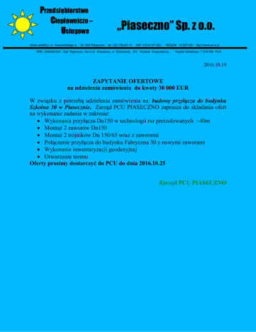 Przedsiębiorstwo Ciepłowniczo – Usługowe Adres siedziby: ul. Kusocińskiego 4, 05 -500 Piaseczno „Piaseczno” Sp. z o.o. tel. (22) 750-02-15 NIP 123-07-87-352 REGON 013071501 http://www.pc-u.pl KRS 0000087343 Sąd Rejonowy dla m.st. Warszawy w Warszawie, XIV Wydział Gospodarczy Kapitał zakładowy: 7 518 000 PLN 2016.10.19 ZAPYTANIE OFERTOWE na udzielenia zamówienia do kwoty 30 000 EUR W związku z potrzebą udzielenia zamówienia na: budowę przyłącza do budynku Szkolna 30 w Piasecznie, Zarząd PCU PIASECZNO zaprasza do składania ofert na wykonanie zadania w zakresie: Wykonanie przyłącza Dn150 w technologii rur preizolowanych ~40m Montaż 2 zaworów Dn150 Montaż 2 trójników Dn 150/65 wraz z zaworami Połączenie przyłącza do budynku Fabryczna 30 z nowymi zaworami Wykonanie inwentaryzacji geodezyjnej Otworzenie terenu Oferty prosimy dostarczyć do PCU do dnia 2016.10.25 Zarząd PCU PIASECZNO
