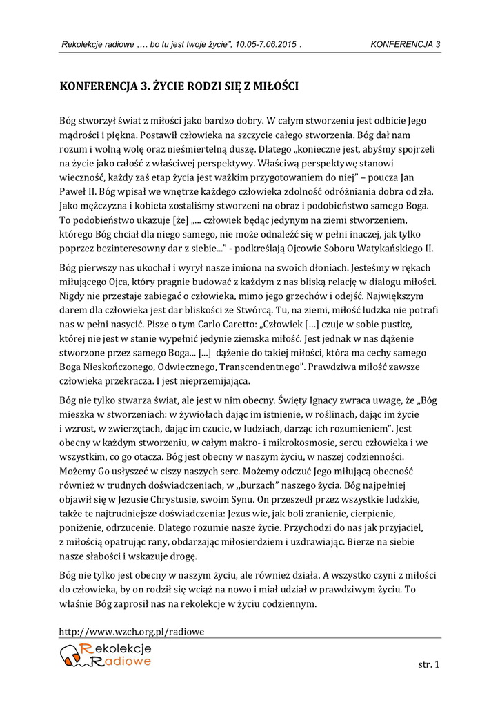 Rekolekcje radiowe „… bo tu jest twoje życie”, 10.05-7.06.2015 . KONFERENCJA 3 KONFERENCJA 3. ŻYCIE RODZI SIĘ Z MIŁOŚCI Bóg stworzył świat z miłości jako bardzo dobry. W całym stworzeniu jest odbicie Jego mądrości i piękna. Postawił człowieka na szczycie całego stworzenia. Bóg dał nam rozum i wolną wolę oraz nieśmiertelną duszę. Dlatego „konieczne jest, abyśmy spojrzeli na życie jako całość z właściwej perspektywy. Właściwą perspektywę stanowi wieczność, każdy zaś etap życia jest ważkim przygotowaniem do niej” – poucza Jan Paweł II. Bóg wpisał we wnętrze każdego człowieka zdolność odróżniania dobra od zła. Jako mężczyzna i kobieta zostaliśmy stworzeni na obraz i podobieństwo samego Boga. To podobieństwo ukazuje [że] „... człowiek będąc jedynym na ziemi stworzeniem, którego Bóg chciał dla niego samego, nie może odnaleźć się w pełni inaczej, jak tylko poprzez bezinteresowny dar z siebie...” - podkreślają Ojcowie Soboru Watykańskiego II. Bóg pierwszy nas ukochał i wyrył nasze imiona na swoich dłoniach. Jesteśmy w rękach miłującego Ojca, który pragnie budować z każdym z nas bliską relację w dialogu miłości. Nigdy nie przestaje zabiegać o człowieka, mimo jego grzechów i odejść. Największym darem dla człowieka jest dar bliskości ze Stwórcą. Tu, na ziemi, miłość ludzka nie potrafi nas w pełni nasycić. Pisze o tym Carlo Caretto: „Człowiek […] czuje w sobie pustkę, której nie jest w stanie wypełnić jedynie ziemska miłość. Jest jednak w nas dążenie stworzone przez samego Boga... [...] dążenie do takiej miłości, która ma cechy samego Boga Nieskończonego, Odwiecznego, Transcendentnego”. Prawdziwa miłość zawsze człowieka przekracza. I jest nieprzemijająca. Bóg nie tylko stwarza świat, ale jest w nim obecny. Święty Ignacy zwraca uwagę, że „Bóg mieszka w stworzeniach: w żywiołach dając im istnienie, w roślinach, dając im życie i wzrost, w zwierzętach, dając im czucie, w ludziach, darząc ich rozumieniem”. Jest obecny w każdym stworzeniu, w całym makro- i mikrokosmosie, sercu człowieka i we wszystkim, co go otacza. Bóg jest obecny w naszym życiu, w naszej codzienności. Możemy Go usłyszeć w ciszy naszych serc. Możemy odczuć Jego miłującą obecność również w trudnych doświadczeniach, w ,,burzach” naszego życia. Bóg najpełniej objawił się w Jezusie Chrystusie, swoim Synu. On przeszedł przez wszystkie ludzkie, także te najtrudniejsze doświadczenia: Jezus wie, jak boli zranienie, cierpienie, poniżenie, odrzucenie. Dlatego rozumie nasze życie. Przychodzi do nas jak przyjaciel, z miłością opatrując rany, obdarzając miłosierdziem i uzdrawiając. Bierze na siebie nasze słabości i wskazuje drogę. Bóg nie tylko jest obecny w naszym życiu, ale również działa. A wszystko czyni z miłości do człowieka, by on rodził się wciąż na nowo i miał udział w prawdziwym życiu. To właśnie Bóg zaprosił nas na rekolekcje w życiu codziennym. http://www.wzch.org.pl/radiowe str. 1 Rekolekcje radiowe „… bo tu jest twoje życie”, 10.05-7.06.2015 . KONFERENCJA 3 Na tej drodze możemy doświadczyć, jak wiele troski Bóg nam poświęca pragnąc, by Jego Słowo dotknęło, przemieniało nasze serce, nasze myślenie. Bóg potrzebuje nas, chce z nami współpracować, by dalej prowadzić swoje dzieło w świecie. Pragnie dać człowiekowi udział w swojej miłości. Istotą tej miłości jest budowanie wzajemnej relacji – w dawaniu i przyjmowaniu. Święty Jan Paweł II nauczał, iż: „to miłość właśnie sprawia, że człowiek urzeczywistnia siebie przez bezinteresowny dar z siebie. Miłość, bowiem, jest dawaniem i przyjmowaniem daru. Nie można jej kupować ani sprzedawać. Można się nią tylko wzajemnie obdarowywać". Bóg, stwarzając nas wciąż na nowo z miłości i dla miłości, obdarza nas prawdziwym życiem, za którym często tęsknimy:„bo niespokojne jest serce człowieka, dopóki nie spocznie w Bogu”, jak pisze na podstawie swojego życia, święty Augustyn. To doświadczenie jest udziałem wielu osób, które powracają do Boga po różnych trudnych przeżyciach. Czasem odpowiedź na łaskę i wołanie Boga przychodzi po wielu latach i niesie głęboką radość. Nasze przyjęcie miłości Boga rodzi nas na nowo, bo odpowiada na najgłębsze pragnienie człowieka bycia kochanym. Poznać Miłość, uwierzyć Jej, to zadanie dla każdego człowieka. Poznanie dokonuje się poprzez intymność i bliskość. Pomaga nam nasza wiara i nadzieja. Otwierając się na Bożą miłość pozwalamy się nią obdarowywać, a otrzymując dary, możemy je rozdawać innym dzieląc się w ten sposób miłością. Miłować oznacza przecież pragnąć dobra dla drugiego. W ten sposób wchodzimy w dialog miłości, w budowanie Królestwa Miłości. Tylko na drodze praktykowania miłości można spotkać Boga. Miłość, którą Bóg objawił posyłając swego Syna, aby za nas oddał swoje życie, osiąga doskonałość. Każdy, kto miłuje, narodził się z Boga i zna Boga”, mówi św. Jan. Nawiązując do tych słów św. Jana, papież Benedykt XVI, pisze: „Ponieważ Bóg pierwszy nas umiłował, miłość nie jest już przykazaniem, ale odpowiedzią na dar miłości, z jaką Bóg do nas przychodzi”. Odkrywamy tę prawdę w ciszy serca, słuchając Słowa, które kieruje do nas sam Bóg. Człowiek szukający Boga, otwiera się na słuchanie Słowa Bożego. Ono ciągle wzywa nas w naszej rzeczywistości i stopniowo się objawia. Słowem Bożym, skierowanym do nas w życiu codziennym, są wszelkie sytuacje, często te zwyczajne. Jak wiele Jego znaków miłości można odkryć, codziennie stając przed Bogiem, aby spojrzeć wraz z Nim na mijający dzień? Ile życia niesie doświadczenie, że On nas nie osądza, ale patrzy na nas z miłością i pragnie tylko, byśmy byli coraz bliżej Niego? Czy zawierzan