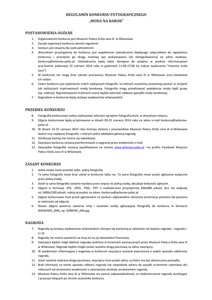 REGULAMIN KONKURSU FOTOGRAFICZNEGO „MODA NA BAROK” POSTANOWIENIA OGÓLNE 1. 2. 3. 4. 5. 6. 7. Organizatorem konkursu jest Muzeum Pałacu Króla Jana III w Wilanowie. Zasady organizacji konkursu określa regulamin. Konkurs jest otwarty dla osób pełnoletnich. Warunkiem przystąpienia do konkursu jest wypełnienie oświadczenia (będącego załącznikiem do regulaminu konkursu) i przesłanie go drogą mailową (po zeskanowaniu lub sfotografowaniu) na adres mailowy: [email protected]. Oświadczenia będą także dostępne do podpisu w punkcie informacyjnym przy bramie pałacowej 22 czerwca 2014 roku w godzinach 11:00-17:00 (w trakcie wydarzenia "Imieniny króla Jana") W konkursie nie mogą brać udziału pracownicy Muzeum Pałacu Króla Jana III w Wilanowie oraz członkowie ich rodzin. Celem konkursu jest wyłonienie trzech najlepszych fotografii, na których uczestnicy prezentują postaci w strojach lub stylizacjach inspirowanych modą barokową. Fotografie mogą przedstawiać pojedyncze osoby bądź grupy (np. rodziny). Najistotniejszym kryterium oceny będzie wierność oddania specyfiki mody barokowej. Nagrodami w konkursie będą zestawy wydawnictw wilanowskich. PRZEBIEG KONKURSU 8. 9. 10. 11. 12. 13. Fotografie konkursowe należy wykonywać własnym sprzętem fotograficznym, w dowolnym miejscu. Zdjęcia konkursowe będą przyjmowane w dniach 09-22 czerwca 2014 roku na adres e-mail [email protected] . W dniach 23-25 czerwca 2014 roku komisja złożona z pracowników Muzeum Pałacu Króla Jana III w Wilanowie wyłoni trzy najlepsze fotografie, z których jedna zdobędzie główną nagrodę. Od decyzji komisji nie można się odwoływać. Zwycięzcy konkursu zostaną poinformowani o wygranej przez wiadomość e-mail. Zwycięskie fotografie zostaną opublikowane na stronie www.wilanow-palac.pl i na profilu Facebook Muzeum Pałacu Króla Jana III w Wilanowie. ZASADY KONKURSU 1. 2. 3. 4. 5. 6. Jedna osoba może przesłać tylko jedną fotografię. Ta sama fotografia może brać udział w konkursie tylko raz. Ta sama fotografia może zostać zgłoszona wyłącznie przez jedną osobę. Jeżeli ta sama fotografia zostanie wysłana przez więcej niż jedną osobę, decyduje kolejność zgłoszeń. Zdjęcia w formacje .JPG, .JPEG, .PNG, .TIFF o rozdzielczości przynajmniej 640x480 pikseli, lecz nie większej niż 1600x1200 pikseli, należy przesyłać na adres: [email protected] . Zdjęcie konkursowe musi przed zgłoszeniem na konkurs odpowiednio obrócone (orientacja pionowa lub pozioma w zależności od zdjęcia). Nazwa zdjęcia powinna zawierać imię i nazwisko osoby zgłaszającej fotografię do konkursu w formacie NAZWISKO_IMIĘ, np. SOBIESKI_JAN.jpg. NAGRODA 7. 8. 9. 10. 11. 12. 13. Nagrodą są zestawy wydawnictw wilanowskich różniące się wartością w zależności od stopnia nagrody – nagroda I, II i III. Nagrody nie można wymienić na inną ani na jej ekwiwalent finansowy. Zwycięzca będzie mógł odebrać nagrodę osobiście w terminach wyznaczonych przez Muzeum Pałacu Króla Jana III w Wilanowie. Nagroda będzie mogła zostać wysłana drogą pocztową na adres zwycięzcy. W wiadomości informującej o wygranej w konkursie zwycięzca zostanie poproszony o wybór sposobu odebrania nagrody. Jeżeli zostanie wybrana droga pocztowa, zwycięzca musi podać adres, na który ma być dostarczona przesyłka. Brak informacji na temat sposobu odbioru nagrody lub niepodanie adresu do wysyłki w terminie czternastu dni roboczych od otrzymania wiadomości o zwycięstwie skutkuje anulowaniem nagrody. Muzeum Pałacu Króla Jana III w Wilanowie nie ponosi odpowiedzialności za niedostarczenie nagrody wynikające z przyczyn leżących po stronie uczestnika konkursu. POSTANOWIENIA KOŃCOWE 1. 2. 3. Warunkiem przystąpienia do konkursu jest akceptacja regulaminu. Zgłoszenie fotografii do konkursu oznacza akceptację warunków konkursu określonych przez niniejszy regulamin. Uczestnicy konkursu wyrażają zgodę na przetwarzanie danych osobowych w rozumieniu Ustawy z dnia 29 sierpnia 1997 r. o ochronie danych osobowych (Dz. U. Nr 133, poz. 833) przez Organizatora w celach prowadzenia konkursu, wyłaniania zwycięzców i przyznawania nagród. Uczestnikom konkursu przysługuje prawo wglądu do swoich danych osobowych i ich poprawiania. 4. Organizator konkursu nie ponosi odpowiedzialności za usługi poczty elektronicznej, z których korzystać będą uczestnicy konkursu. Organizator nie ponosi również odpowiedzialności za działania osób trzecich, związanych z organizacją konkursu oraz za szkody spowodowane podaniem błędnych lub nieaktualnych danych przez uczestników konkursu. 5. Uczestnik konkursu przystępując do konkursu winien dysponować autorskimi prawami majątkowymi do zdjęć zgłoszonych w konkursie. 6. Uczestnik konkursu przystępujący do konkursu zobowiązuje się nie nadsyłać materiałów, które naruszają prawa autorskie osób trzecich. W przeciwnym razie ponosi pełną i wyłączną odpowiedzialność wobec osób, których prawa naruszył. 7. Z chwilą nadesłania przez uczestnika konkursu zdjęcia, na organizatora konkursu przechodzą nieodpłatnie autorskie (niewyłączne) prawa majątkowe do utworu (pracy) w zakresie: utrwalania i zwielokrotniania nadesłanego utworu/ów – wytwarzanie egzemplarzy utworu bez względu na technikę (np. techniką drukarską, reprograficzną, zapisu magnetycznego, cyfrową), ilość i wielkość nakładu; obrotu oryginałem albo egzemplarzami, na których utwór utrwalono, wprowadzanie do obrotu, najem, użyczenie oryginału albo egzemplarzy, nadawanie drogą przewodową i bezprzewodową, wystawianie, odtworzenie, reemitowanie, publiczne udostępnianie utworu w taki sposób, aby każdy mógł mieć do niego dostęp w miejscu i czasie przez siebie wybranym, rozpowszechnianie w nieograniczonym nakładzie i zasięgu terytorialnym, oraz prawa pokrewne z zastrzeżeniem między innymi ujawnienia nazwiska Autora w sposób zwyczajowo pr