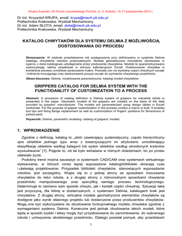 Artykuł Autorski, XII Forum Inżynierskiego ProCAx cz. II, Kraków, 15-17 października 2013 r. Dr inż. Krzysztof KRUPA, email: [email protected] Politechnika Krakowska, Wydział Mechaniczny Dr inż. Adam SŁOTA, email: [email protected] Politechnika Krakowska, Wydział Mechaniczny KATALOG CHWYTAKÓW DLA SYSTEMU DELMIA Z MOŻLIWOŚCIĄ DOSTOSOWANIA DO PROCESU Streszczenie: W artykule przedstawiono tok postępowania przy definiowaniu w systemie Delmia katalogu chwytaków robotów przemysłowych. Modele geometryczne chwytaków zbudowano w oparciu o dane katalogowe udostępniane przez producenta chwytaków. Modele te sparametryzowano wykorzystując tablice projektowe w arkuszu kalkulacyjnym Excell. Dostosowanie chwytaka w kontekście procesu umożliwia opracowane makro. Pozwala ono na wymianę części chwytnych szczęk i kołnierza mocującego oraz dostosowanie pozycji szczęk do wymiarów chwytanego przedmiotu. Słowa kluczowe: Delmia, modelowanie parametryczne, katalog modeli chwytaków GRIPPERS CATALOG FOR DELMIA SYSTEM WITH THE FUNCTIOANLITY OF CUSTOMIZATION TO A PROCESS Abstract: A procedure of catalog definition in Delmia system of grippers for industrial robots is presented in the paper. Geometric models of the grippers are created on the basis of the data provided by grippers’ manufacturer. The models are parameterized using design tables in Excell worksheet. For the purpose of gripper customization in the process context a macro is built. It enables tool tips and fixing flange replacement as well as customization of fingers’ positions for dimensions of picked parts. Keywords: Delmia, parametric modeling, catalog of grippers’ models 1. WPROWADZENIE Zgodnie z definicją, katalog to „zbiór zawierający systematyczny, często hierarchiczny spis obiektów jednego typu wraz z towarzyszącymi im atrybutami, umożliwiający klasyfikację obiektów według kategorii lub wybór obiektów według określonych kryteriów wyszukiwania” [1]. Pojęcie to, od lat było wdrażane w różnych dziedzinach, bo po prostu ułatwiało życie. Podobny trend można zauważyć w systemach CAD/CAM oraz systemach wirtualnego wytwarzania, w których coraz lepiej wyposażone katalogi/biblioteki skracają czas i ułatwiają projektowanie. Przypadek biblioteki chwytaków, stanowiących wyposażenie robotów, jest szczególny. Wiąże się to z jednej strony ze sposobem mocowania chwytaków do kiści robota, a z drugiej strony z różnorodnymi sposobami chwytania przedmiotu manipulowanego oraz specyfiką samego procesu technologicznego. Determinuje to zarówno sam sposób chwytu, jak i kształt części chwytnej. Sytuacja taka jest przyczyną, dla której w dostarczanych, z systemem Delmia, katalogach brak jest chwytaków. Z drugiej strony, wirtualne modele geometryczne elementów chwytaków są dostępne jako wynik własnego projektu lub dostarczone przez producentów chwytaków. Mogą one być wykorzystane do zbudowania funkcjonalnego modelu chwytaka zgodnie z wymaganiami systemu Delmia. Konieczne jest jednak zbudowanie takich modeli, które będą w sposób szybki i łatwy mogły być przystosowane do zamontowania, do wybranego robota i uchwycenia określonego przedmiotu. Dlatego powstał pomysł, aby przedstawić 1 Artykuł Autorski, XII Forum Inżynierskiego ProCAx cz. II, Kraków, 15-17 października 2013 r. procedurę generowania, w oparciu o dane dostarczane przez producentów chwytaków, typoszeregu różnowymiarowych chwytaków o identycznej strukturze, przy czym struktura ta ma zapewniać możliwość adaptacji chwytaka do konkretnego robota i przedmiotu manipulowanego. Zdecydowano się wykorzystać do tego celu informacje zapisane w postaci tabel arkusza MS Excel. W celu wspomożenia modyfikacji w kontekście procesu opracowano odpowiednie makro. Tok postępowania przy budowie takiego katalogu zostanie przedstawiony na przykładzie chwytaków równoległych firmy Bosch. 2. MODELE CHWYTAKÓW Modele elementów składowych chwytaka budowane są w sposób parametryczny, z wykorzystaniem tabel projektowych (Design Table). Tabele te zawierają dane katalogowe chwytaków, udostępnione przez producenta. Rysunek chwytaka wraz z tabelą wymiarów dla chwytaków równoległych firmy Bosch [2] oraz utworzoną na ich podstawie tabelą projektową w programie Microsoft Excell [3] przedstawia rysunek 1. a) b) c) Rys. 1 Dane dla modeli parametrycznych: a) rysunek chwytaka [2], b) tabela wymiarów [2], c) tabela projektowa w programie Excell 2 Artykuł Autorski, XII Forum Inżynierskiego ProCAx cz. II, Kraków, 15-17 października 2013 r. Zgodnie z wymaganiami umożliwiającymi wygenerowanie wszystkich wersji części w edytorze katalogu, w pierwszej kolumnie tabeli projektowej o nagłówku Part Number umieszczono symbole kolejnych wersji części [4]. Wymiary elementu chwytaka określone są przez formuły wykorzystujące wartości parametrów zaczerpnięte z tablicy projektowej. Na podstawie danych katalogowych utworzono modele korpusu oraz szczęki chwytaka. Modele te będą wykorzystane do budowy wzorca chwytaka, z którego poprzez zastępowanie elementów składowych, utworzone zostaną kolejne wersje chwytaków. Aby to umożliwić elementy geometryczne części chwytaka używane do ich łączenia powinny być opublikowane. Widok modelu korpusu chwytaka z zaznaczonymi, opublikowanymi elementami geometrii do połączenia ze szczękami (Edge_Base_Right, Edge_Base_Left, Face_Base, Plane Base) oraz kołnierzem mocującym (Axis1_For_Flange, Axis2_For_Flange, Face_For_Flange) pokazano na rysunku 2. W modelach części chwytaka opublikowano również parametry określające wymiary części chwytnej oraz definiujące skok szczęk chwytaka. Parametry te będą używane do ustalenia położenia szczęk przy chwytaniu przedmiotu manipulowanego. Rys. 2 Widok modelu korpusu chwytaka z opublikowanymi elementami geometrii 3 Artykuł Autorski, XII Forum Inżynierskiego ProCAx cz. II, Kraków, 15-17 października 2