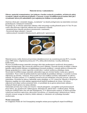 Materiał siewny i sadzeniakowy Zdrowy materiał rozmnożeniowy jest jednym z bardzo ważnych czynników, od których zależy wysokość i jakość uzyskiwanych plonów. Coroczny wysiew kwalifikowanych nasion zbóż jak i wysadzanie zdrowych sadzeniaków jest najtańszym źródłem wzrostu plonów Zarówno zboża jak i ziemniaki ulegają „wyradzaniu” na skutek posługiwania się materiałem siewnym pochodzącym z kolejnych rozmnożeń. Przyjmuje się, że obecnie uprawiane odmiany zbóż utrzymują wysoką plenność przez 4-5 lat. Po tym czasie zdecydowana większość odmian traci na plenności wskutek: - porażenia przez choroby grzybowe przenoszone z nasionami, - krzyżowań danej odmiany z innymi, - niekorzystnych warunków klimatycznych, glebowych i uprawowych. Materiał siewny roślin zbożowych powinien charakteryzować się czystością powyżej 98 %, wysoką masą 1000 ziaren, wilgotnością niższą niż 15%, dobrą zdrowotnością i wysoką zdolnością kiełkowania. Wysiew kwalifikowanego materiału siewnego zbóż daje producentowi możliwość skorzystania z postępu biologicznego, jaki wnoszą do rolnictwa nowe odmiany. Pozwala również na dobór w danym gatunku odpowiedniej odmiany uwzględniającej kierunek produkcji i warunki glebowo-klimatyczne danego gospodarstwa, a także zapewnia wysoki plon i wartość użytkową zebranego ziarna. Stosowanie kwalifikowanego materiału sadzeniakowego jest również bardzo ważne przy uprawie ziemniaków. Przez wiele lat polska hodowla wprowadzała do produkcji odmiany o wyraźnie wyższej odporności na choroby wirusowe. Przyczyniło się to do rzadkiej wymiany sadzeniaków na zdrowy materiał. W Polsce jedynie 3-5 % plantacji towarowych jest obsadzane corocznie nowym, zdrowym materiałem. Wymiana na zdrowy sadzeniak często następuje, co 10 i więcej lat. Obecnie w Krajowym Rejestrze znajduje się wiele odmian zagranicznych hodowli podatnych na wirusy. Ich niższa odporność powoduje szybsze porażenie bulw, co przekłada się na gorsze plonowanie odmian w kolejnych latach uprawy tej samej odmiany. Sadzeniaki powinny być wolne od wirusów i innych patogenów, szczególnie tych przenoszonych przez bulwy, np. grzybowych i bakteryjnych, obniżających, jakość bulw i wielkość plonu. Ważną cechą jest wielkość bulw oraz ich stan fizjologiczny, co w uproszczeniu oznacza, że bulwa powinna wykazywać możliwie najwyższą aktywność rozwojową, a w konsekwencji i plonotwórczą. Należy również zwracać uwagę na właściwy dobór odmiany w zależności od wybranego kierunku użytkowania. Ważne oznaczenia Po wstąpieniu Polski do Unii Europejskiej nastąpiła zmiana poszczególnych stopni kwalifikacji materiału siewnego i sadzeniakowego. Kupując często taki materiał nie zawsze wiemy, co oznaczają symbole zawarte na dołączonych etykietach lub na paszportach roślin w przypadku sadzeniaków. W celu poprawnego odczytania tych symboli obowiązujące obecnie oznaczenia partii kupowanych roślin przedstawiono w tabelach 1 i 2. Najwyższym stopniem kwalifikacji zarówno u zbóż jak i ziemniaków jest materiał kategorii elitarny tj. przedbazowy (PB) i bazowy (B), który jest wytwarzany u hodowcy. Materiał siewny w dalszych stopniach kwalifikacji (C/1, C/2 – w przypadku zbóż oraz C/A i C/B w przypadku ziemniaków) produkują gospodarstwa rolne, a organizacją tej produkcji i uszlachetnianiem nasion zajmują się przedsiębiorstwa nasienno-handlowe. Dopłaty w ramach pomocy '”de minimis” Dodatkową korzyścią ze stosowania kwalifikowanego materiału siewnego jest w ostatnich latach możliwość skorzystania przez producentów rolnych z dopłat w ramach pomocy „de minimis” do zakupu materiału siewnego kategorii elitarny lub kwalifikowany zużytego do siewu lub sadzenia. Rolnicy podobnie jak w roku ubiegłym będą mogli składać wnioski w ARR w terminie od 15 stycznia 2011 r. do 25 czerwca 2011 r. Materiał ten powinien być zakupiony i wysiany (wysadzony) w okresie od 15 lipca 2010 r. do 15 czerwca 2011 r. Producent rolny zobowiązany jest dołączyć do składanego wniosku oryginały lub potwierdzone przez upoważnioną osobę kopie faktur zakupu lub dokumentu wydania z magazynu materiału siewnego kategorii elitarny lub kwalifikowany wystawionych w roku, w którym materiał ten został zużyty do siewu lub sadzenia. Dopłaty przysługują do: zbóż ozimych, zbóż jarych, roślin strączkowych, ziemniaka, mieszanek zbożowych i pastewnych (sporządzonych z gatunków roślin objętych systemem dopłat). Dopłaty te mają na celu zwiększenie ilości stosowanego materiału siewnego w polskich gospodarstwach. Opracowała: Katarzyna Sitek Akceptował kierownik działu: Stanisław Kawa Załączniki: Oznaczenia partii roślin ro Tabela 1. Kategorie i stopnie kwalifikacji materiału siewnego roślin ro roś zbożowych Kategoria Elitarny Kwalifikowany Nazwa Stopień kwalifikacji Symbol Przedbazowy PB Bazowy Pierwszego rozmno rozmnożenia Drugiego rozmno rozmnożenia B Etykieta biała z fioletowym paskiem biała C/1 niebieska C/2 czerwona Źródło: Zbożaa wysokiej jakości, jako Agro Serwis, Warszawa 2007 Tabela 2. Nazewnictwo i oznaczenie partii sadzeniaków Kategoria Nazwa Symbol Klasa Przedbazowy PB Elitarny B/I Bazowy B B/II C/A Kwalifikowany C C/B Kolor paszportu biały z fioletowym paskiem biały niebieski Źródło: ródło: Ziemianki nowe perspektywy, Agro Serwis, Warszawa 2008