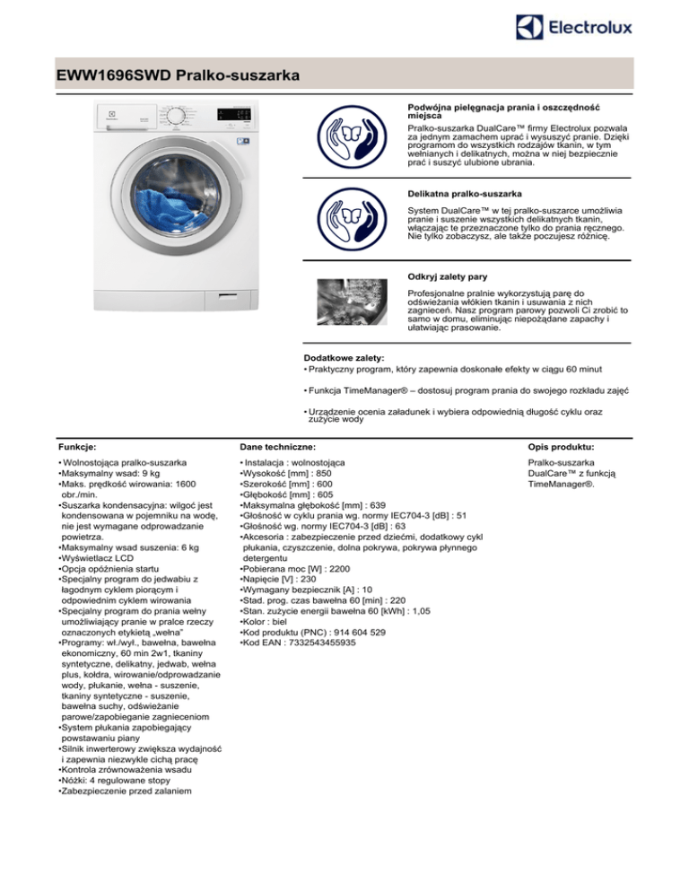 EWW1696SWD Pralko-suszarka Podwójna pielęgnacja prania i oszczędność miejsca Pralko-suszarka DualCare™ firmy Electrolux pozwala za jednym zamachem uprać i wysuszyć pranie. Dzięki programom do wszystkich rodzajów tkanin, w tym wełnianych i delikatnych, można w niej bezpiecznie prać i suszyć ulubione ubrania. Delikatna pralko-suszarka System DualCare™ w tej pralko-suszarce umożliwia pranie i suszenie wszystkich delikatnych tkanin, włączając te przeznaczone tylko do prania ręcznego. Nie tylko zobaczysz, ale także poczujesz różnicę. Odkryj zalety pary Profesjonalne pralnie wykorzystują parę do odświeżania włókien tkanin i usuwania z nich zagnieceń. Nasz program parowy pozwoli Ci zrobić to samo w domu, eliminując niepożądane zapachy i ułatwiając prasowanie. Dodatkowe zalety: • Praktyczny program, który zapewnia doskonałe efekty w ciągu 60 minut • Funkcja TimeManager® – dostosuj program prania do swojego rozkładu zajęć • Urządzenie ocenia załadunek i wybiera odpowiednią długość cyklu oraz zużycie wody Funkcje: Dane techniczne: Opis produktu: • Wolnostojąca pralko-suszarka •Maksymalny wsad: 9 kg •Maks. prędkość wirowania: 1600 obr./min. •Suszarka kondensacyjna: wilgoć jest kondensowana w pojemniku na wodę, nie jest wymagane odprowadzanie powietrza. •Maksymalny wsad suszenia: 6 kg •Wyświetlacz LCD •Opcja opóźnienia startu •Specjalny program do jedwabiu z łagodnym cyklem piorącym i odpowiednim cyklem wirowania •Specjalny program do prania wełny umożliwiający pranie w pralce rzeczy oznaczonych etykietą „wełna” •Programy: wł./wył., bawełna, bawełna ekonomiczny, 60 min 2w1, tkaniny syntetyczne, delikatny, jedwab, wełna plus, kołdra, wirowanie/odprowadzanie wody, płukanie, wełna - suszenie, tkaniny syntetyczne - suszenie, bawełna suchy, odświeżanie parowe/zapobieganie zagnieceniom •System płukania zapobiegający powstawaniu piany •Silnik inwerterowy zwiększa wydajność i zapewnia niezwykle cichą pracę •Kontrola zrównoważenia wsadu •Nóżki: 4 regulowane stopy •Zabezpieczenie przed zalaniem • Instalacja : wolnostojąca •Wysokość [mm] : 850 •Szerokość [mm] : 600 •Głębokość [mm] : 605 •Maksymalna głębokość [mm] : 639 •Głośność w cyklu prania wg. normy IEC704-3 [dB] : 51 •Głośność wg. normy IEC704-3 [dB] : 63 •Akcesoria : zabezpieczenie przed dziećmi, dodatkowy cykl płukania, czyszczenie, dolna pokrywa, pokrywa płynnego detergentu •Pobierana moc [W] : 2200 •Napięcie [V] : 230 •Wymagany bezpiecznik [A] : 10 •Stad. prog. czas bawełna 60 [min] : 220 •Stan. zużycie energii bawełna 60 [kWh] : 1,05 •Kolor : biel •Kod produktu (PNC) : 914 604 529 •Kod EAN : 7332543455935 Pralko-suszarka DualCare™ z funkcją TimeManager®.